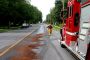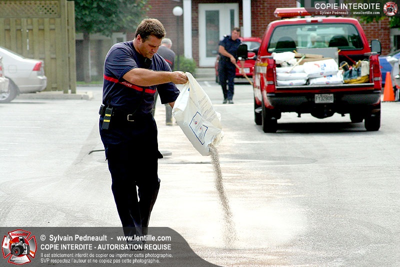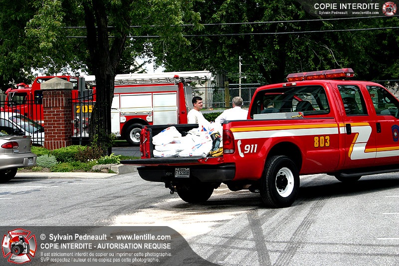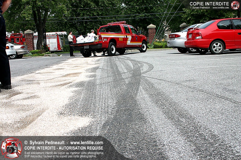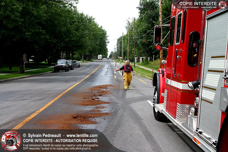Un camion à ordures subit une importante fuite de liquide hydrolique en se déplaçant sur la rue Pratte, résultant en un déversement extrêmement glissant qui doit être asséché très rapidement par le service Incendie et les travaux publics de la ville.