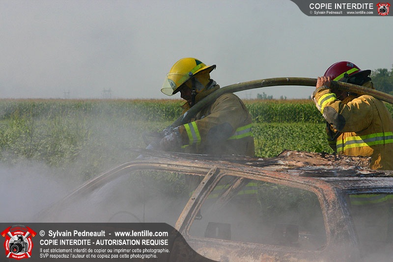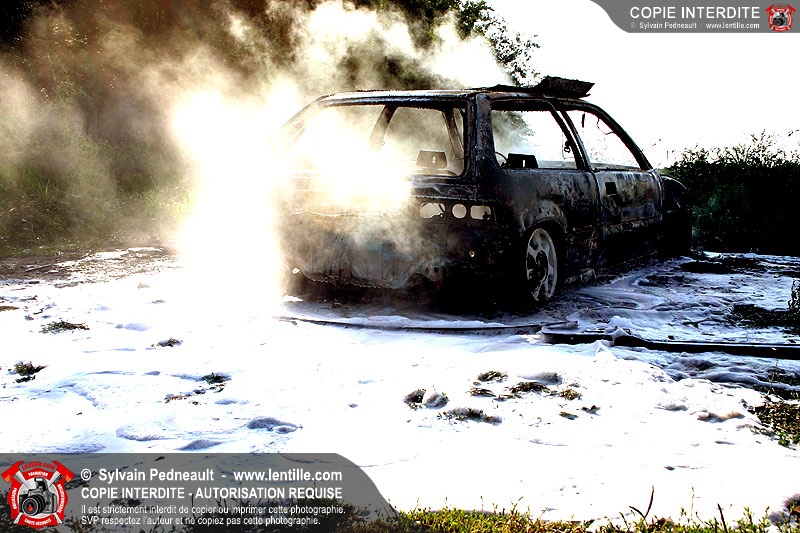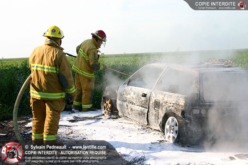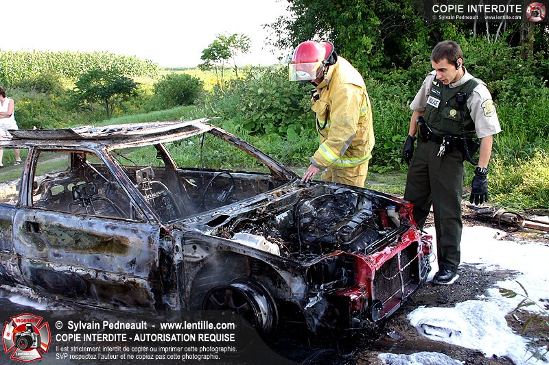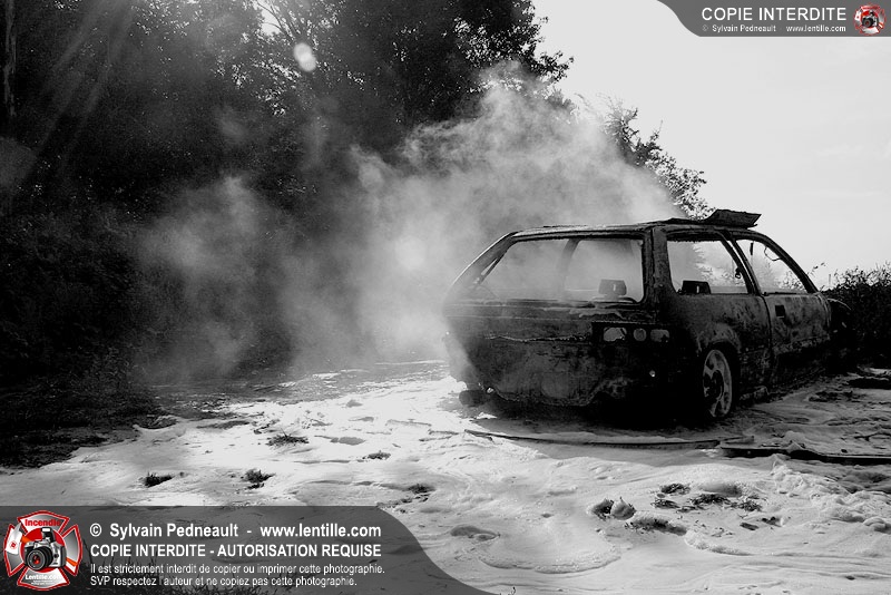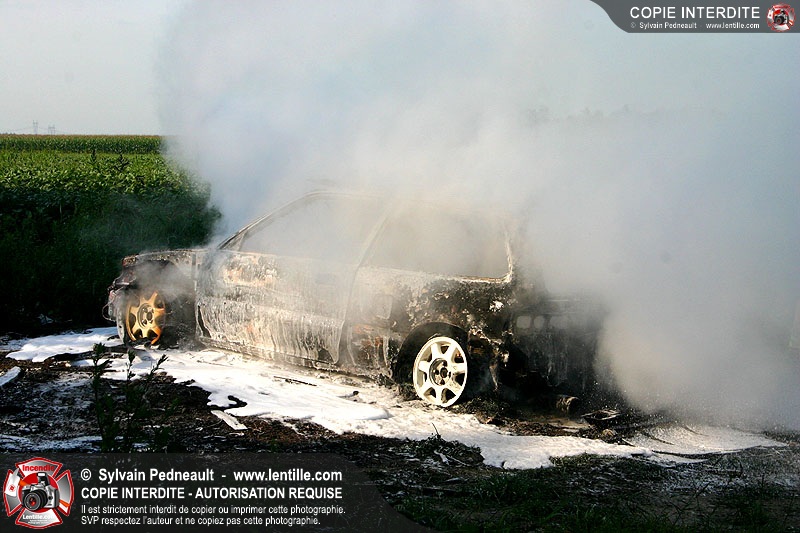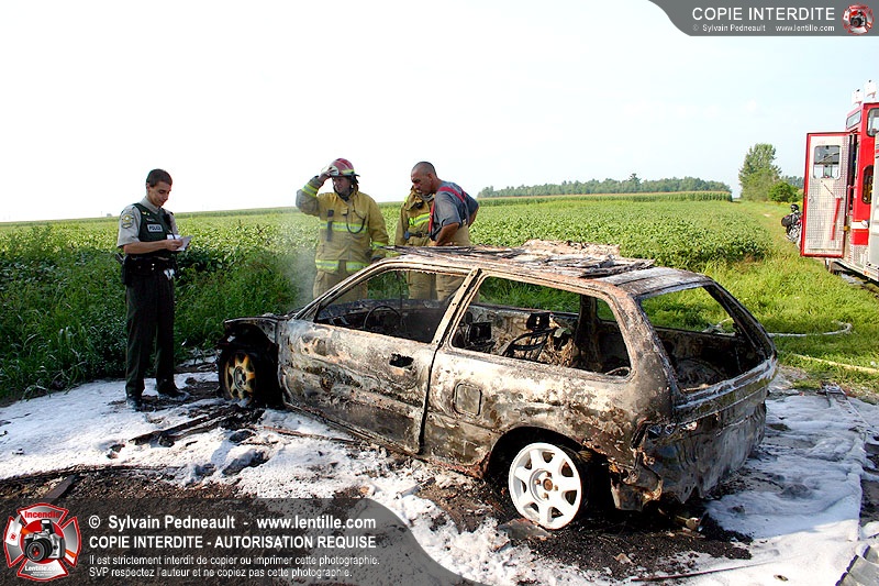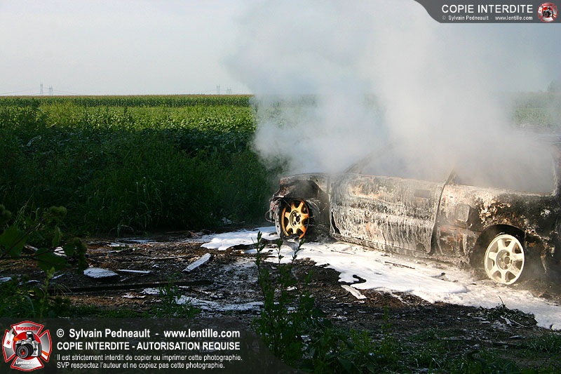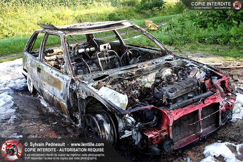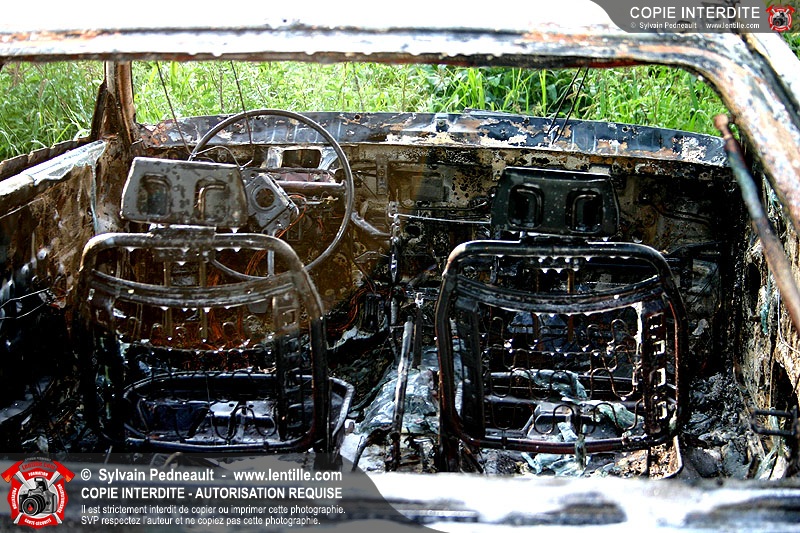 Une voiture abandonnée dans un champ agricole est complètement incendiée. La récolte d'indices sur les causes de l'incendie est cependant peu difficile.