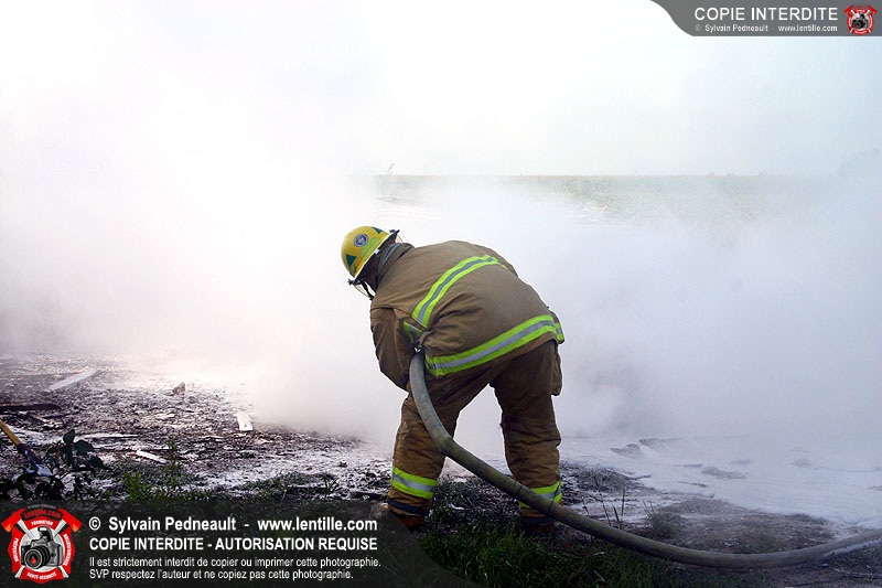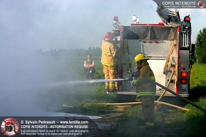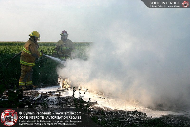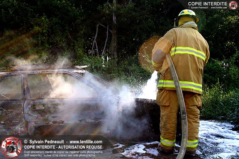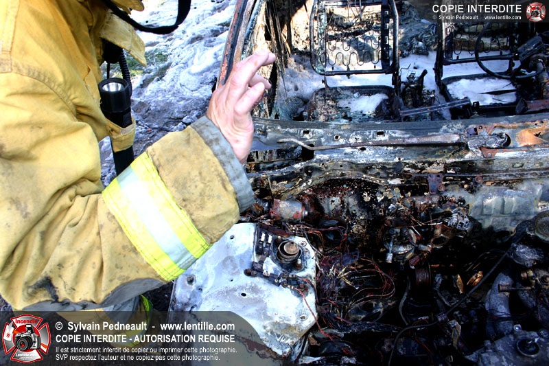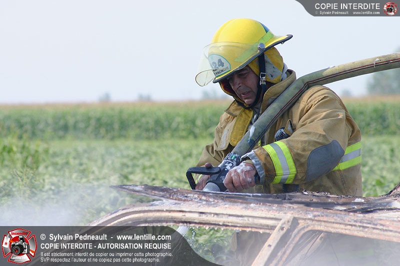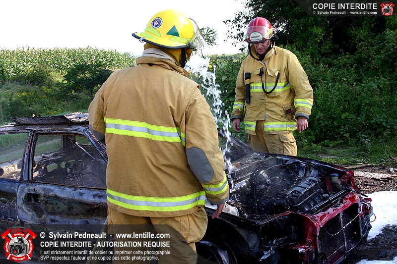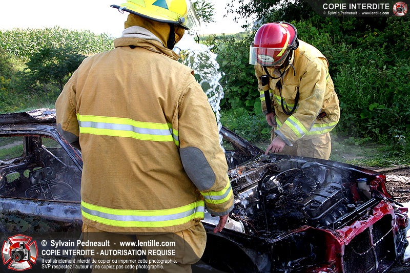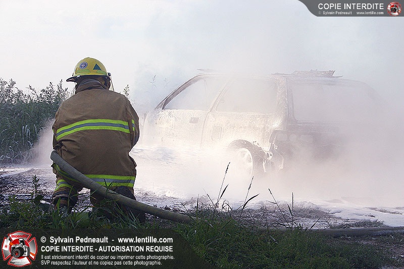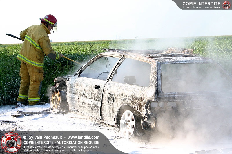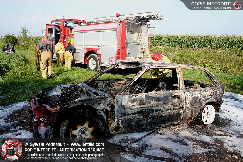 Une voiture abandonnée dans un champ agricole est complètement incendiée. La récolte d'indices sur les causes de l'incendie est cependant peu difficile.