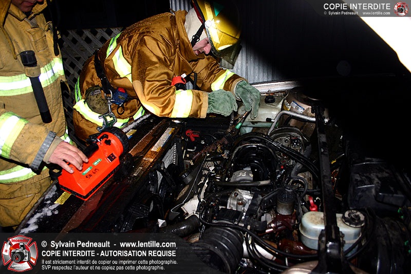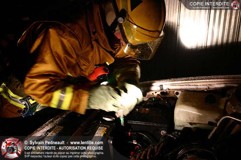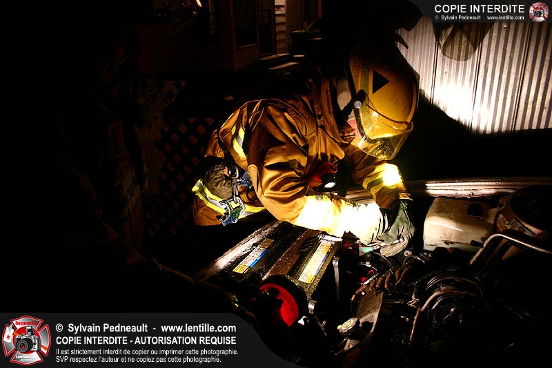 En connectant un dispositif de recharge de batterie à une automobile, une petite explosion survient et cause un début d'incendie. Le tout est cependant rapidement éteint.