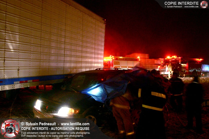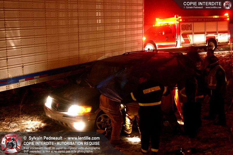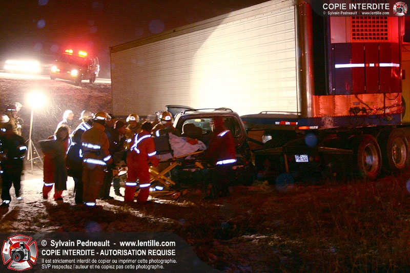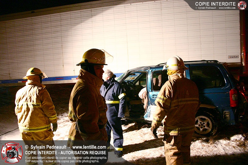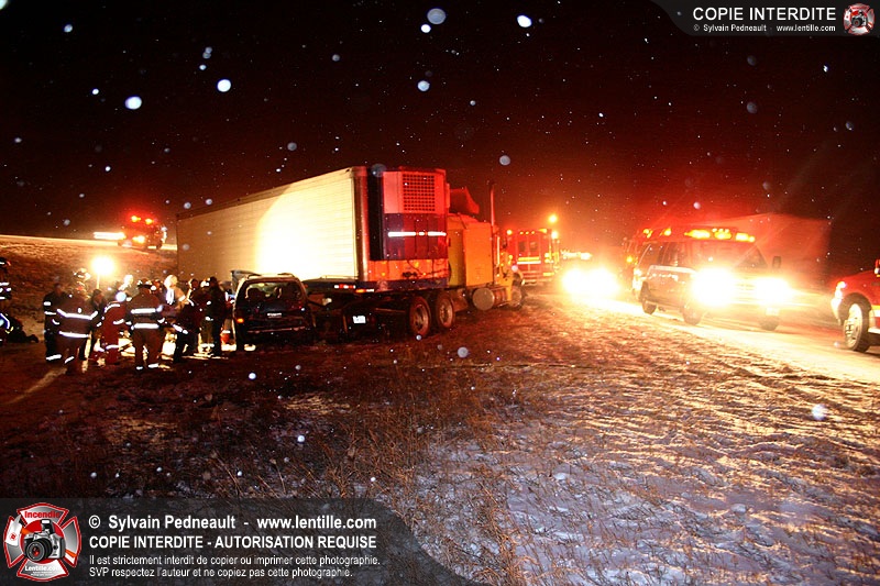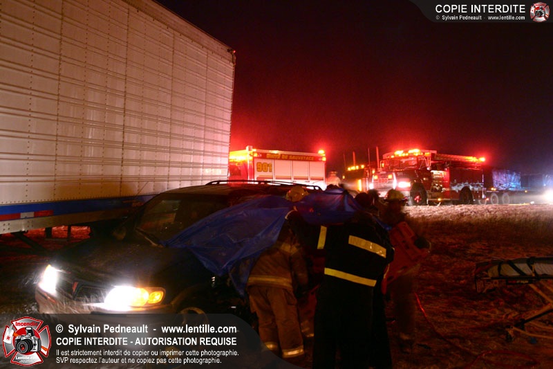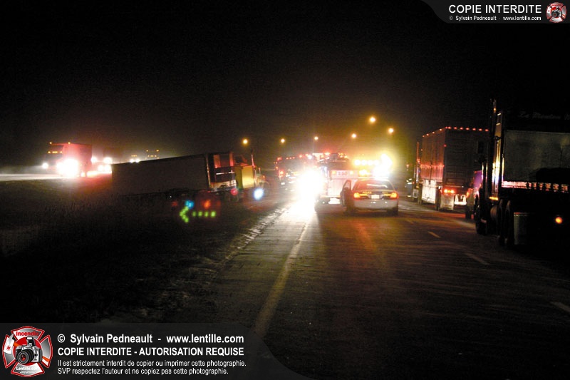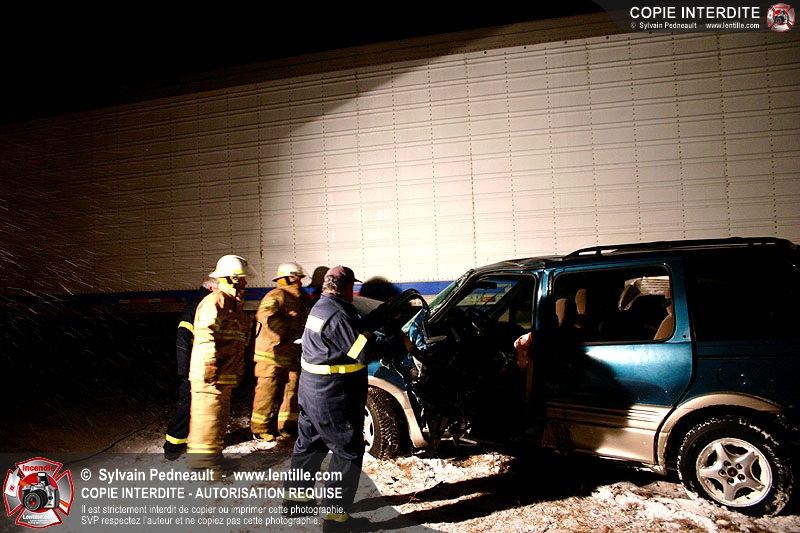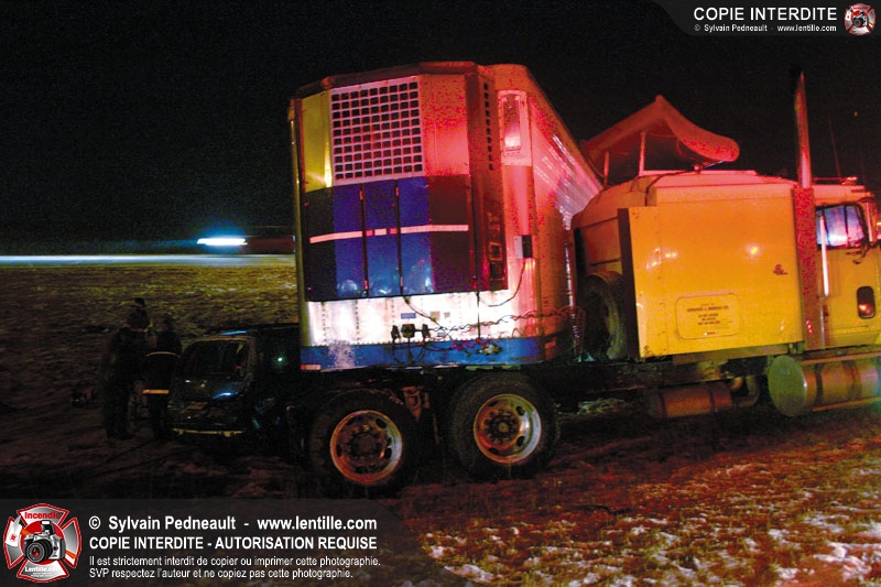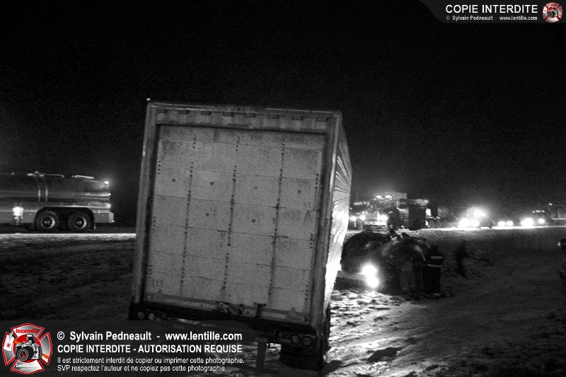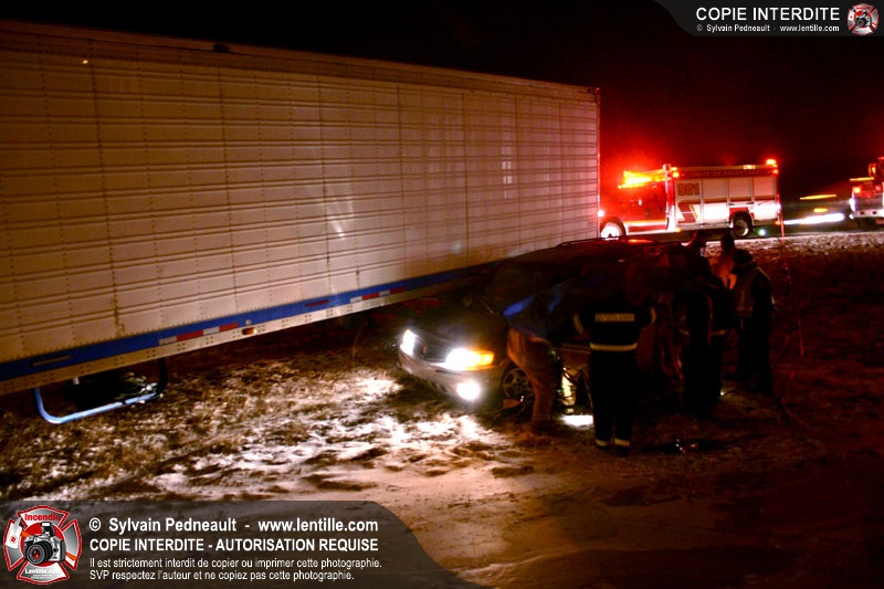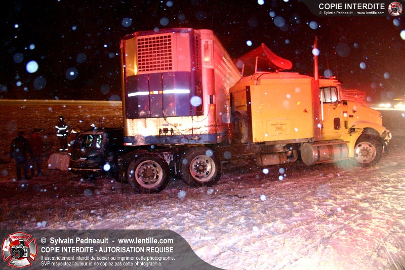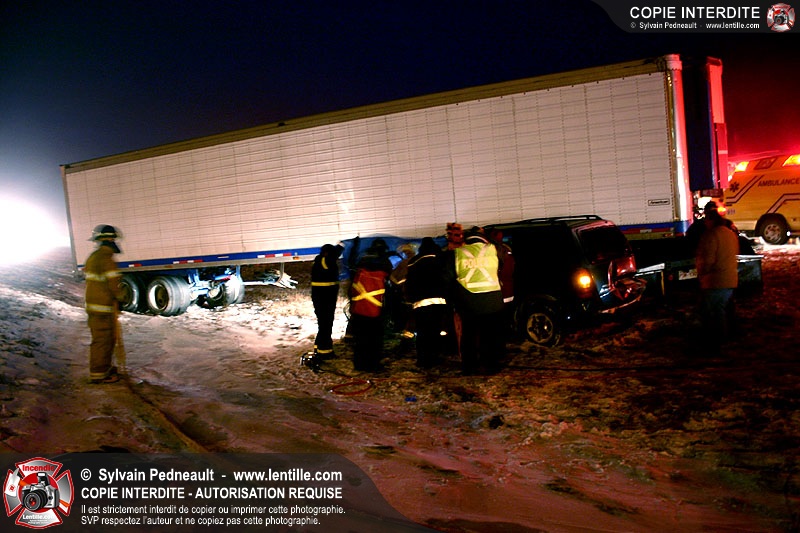 Une minifourgonnette rate le dépassement d'un camion-remorque sur la chaussée glissante de l'autoroute 20. Le SSI de St-Simon, le Service de Premiers Répondants de St-Liboire et le SSI de St-Hyacinthe sont appelés pour la désincarcération.