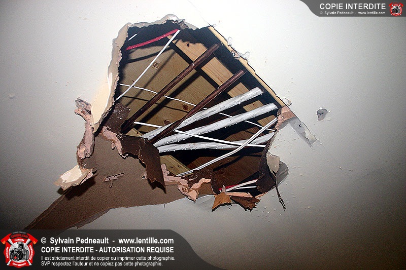 Le bri d'un tuyau de cuivre dans le plafond d'un appartement au 2e étage cause un important dégât d'eau dans un édifice. Un 10-06 de la caserne 3 est nécessaire pour ramasser le tout à l'étage et dans le sous-sol.