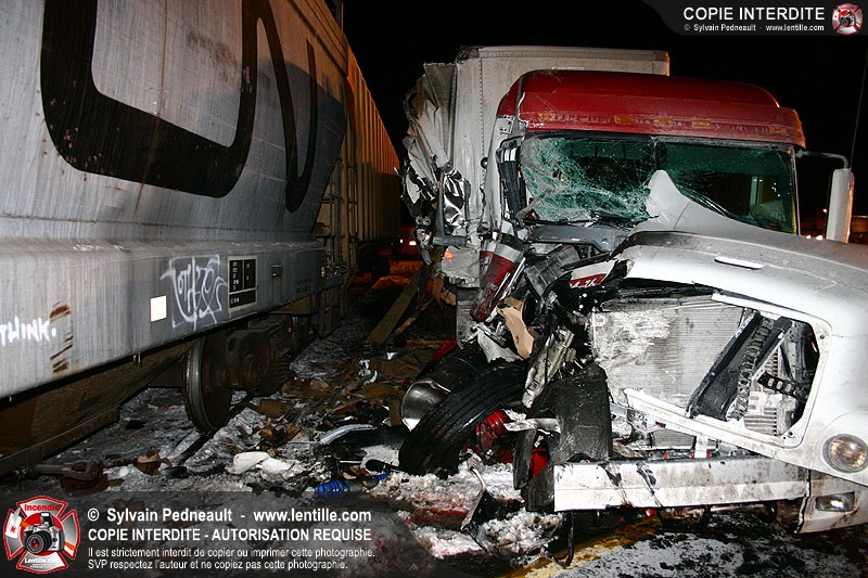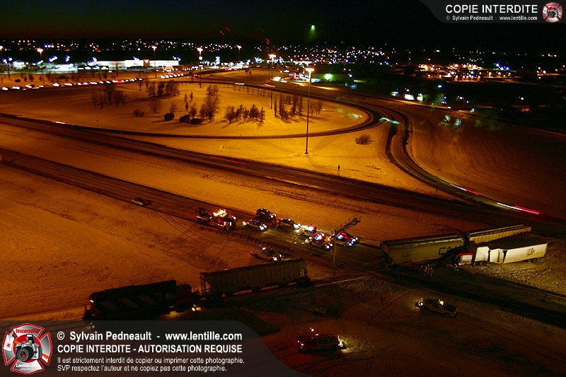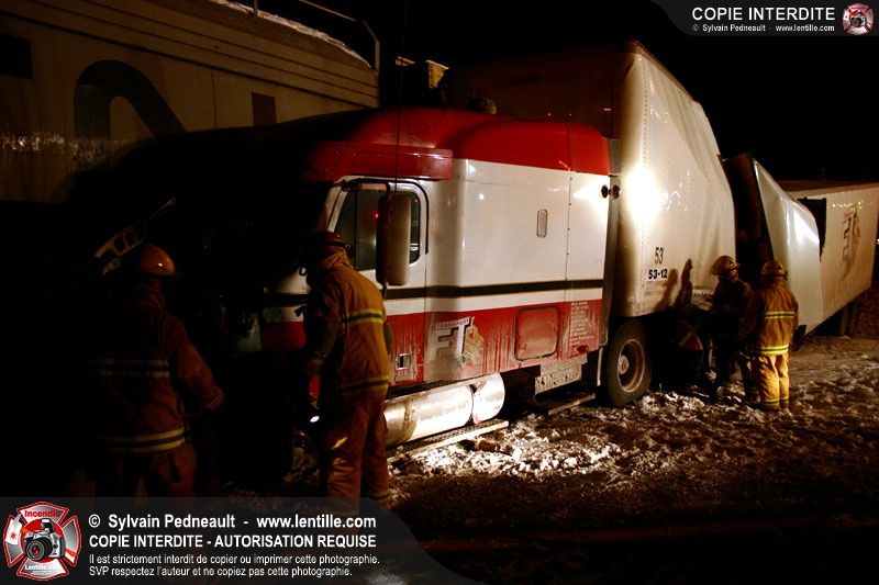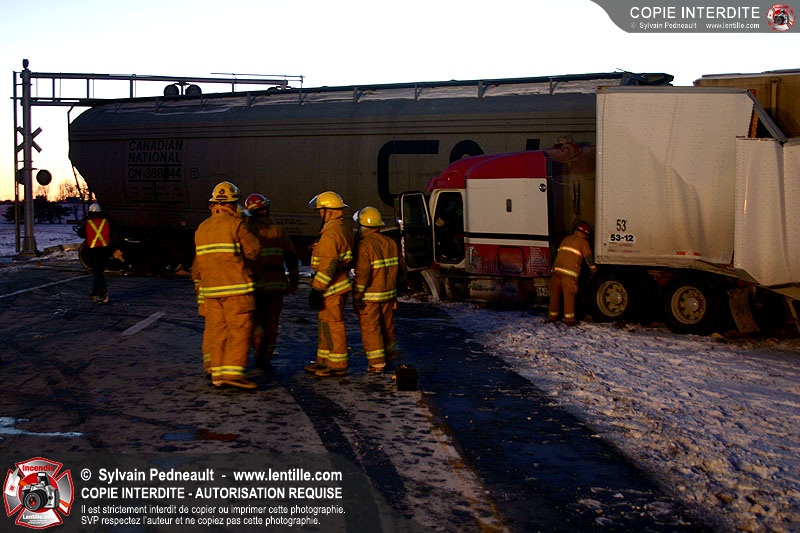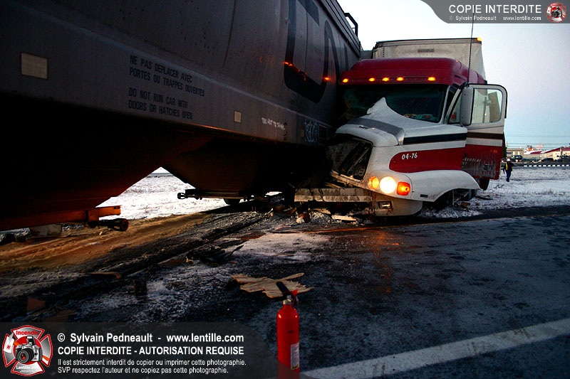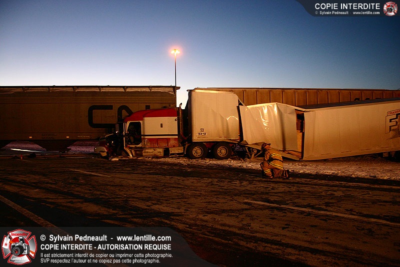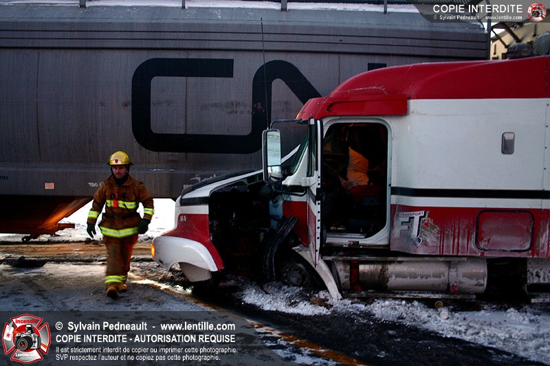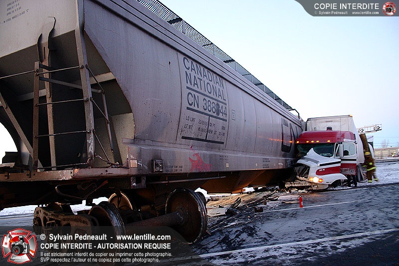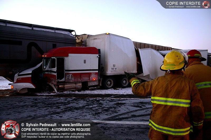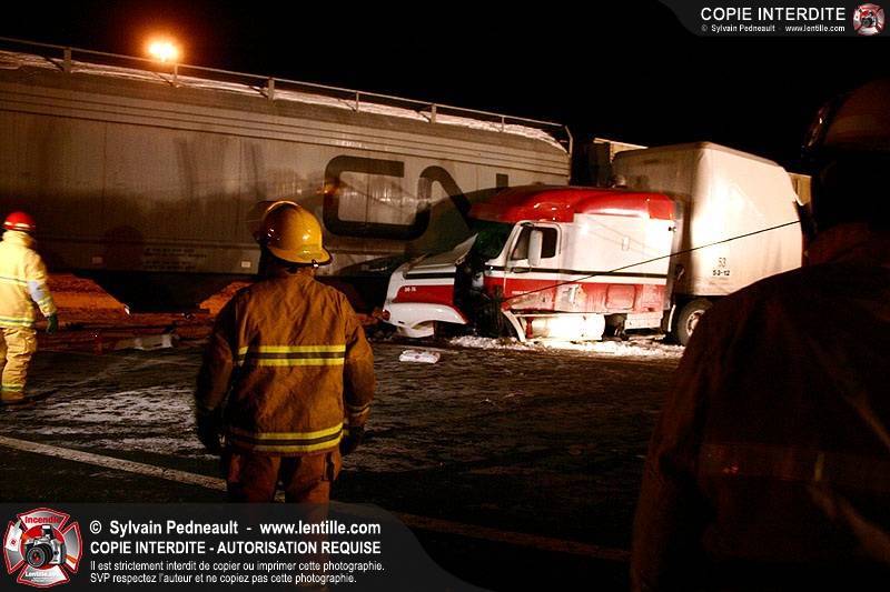 Un camion avec remorque percute un train traversant l'autoroute 20 à la hauteur du centre-ville de Saint-Hyacinthe. Les pompiers sont appelés sur les lieux pour évaluer et surveiller les risques d'incendie.