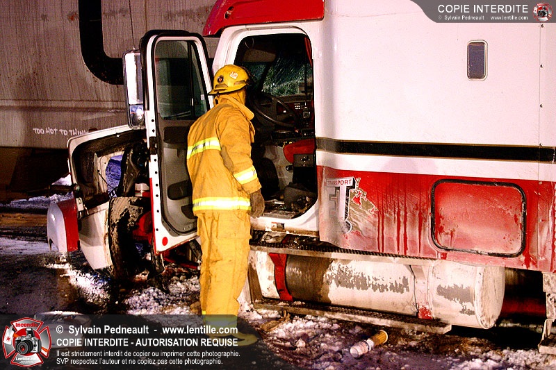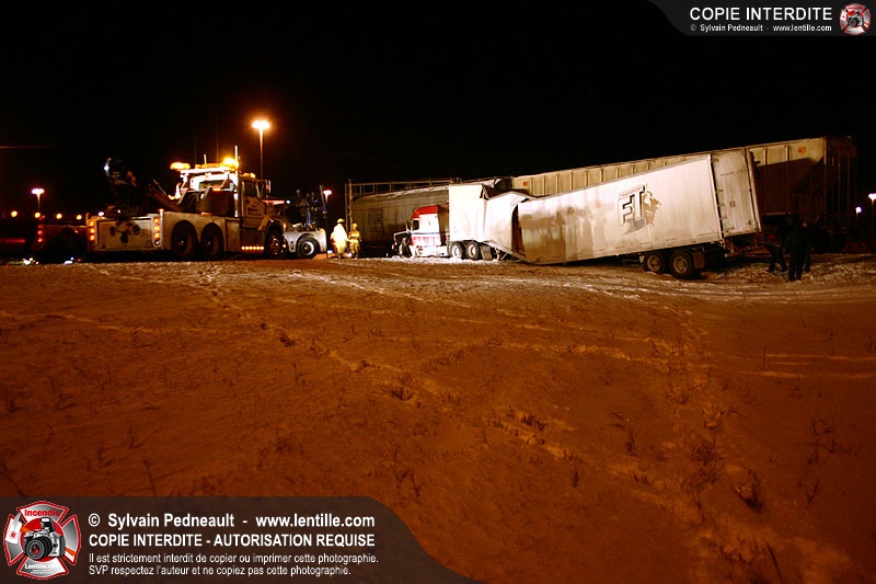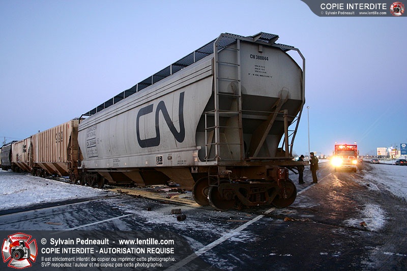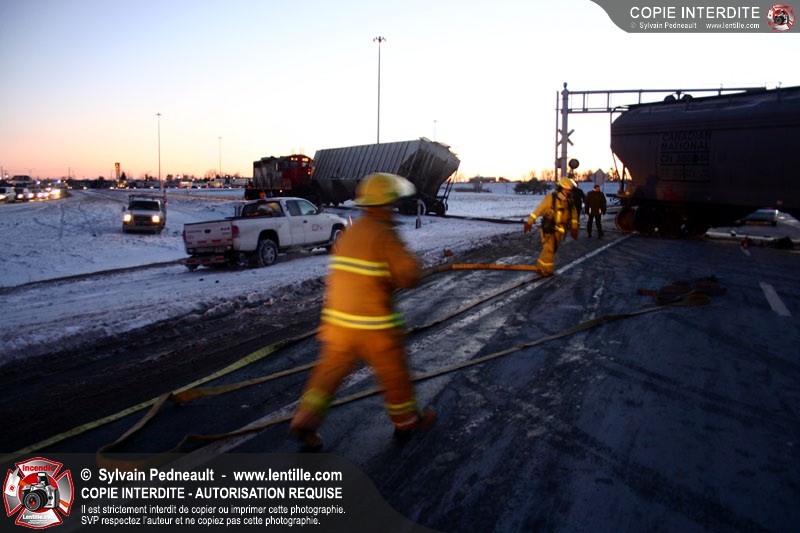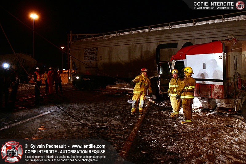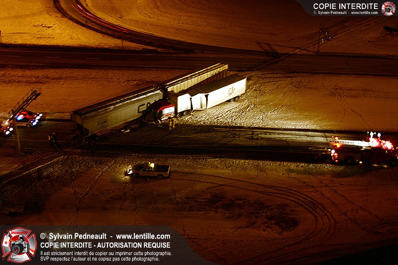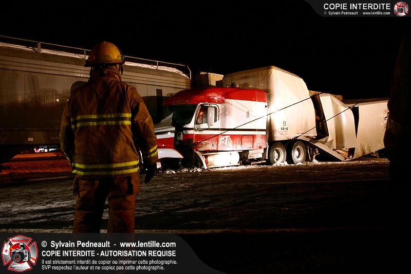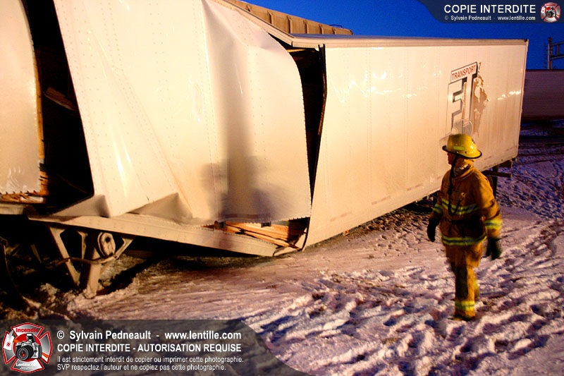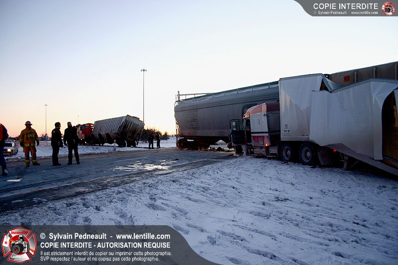 Un camion avec remorque percute un train traversant l'autoroute 20 à la hauteur du centre-ville de Saint-Hyacinthe. Les pompiers sont appelés sur les lieux pour évaluer et surveiller les risques d'incendie.