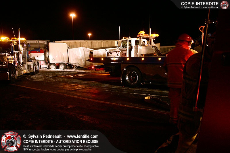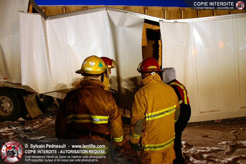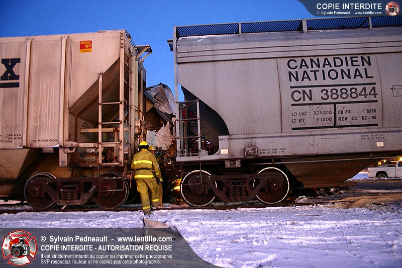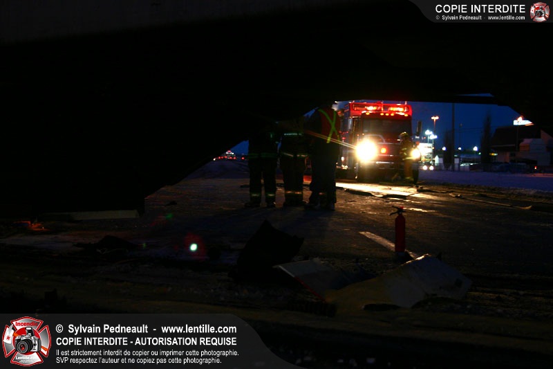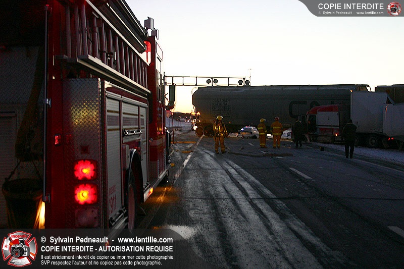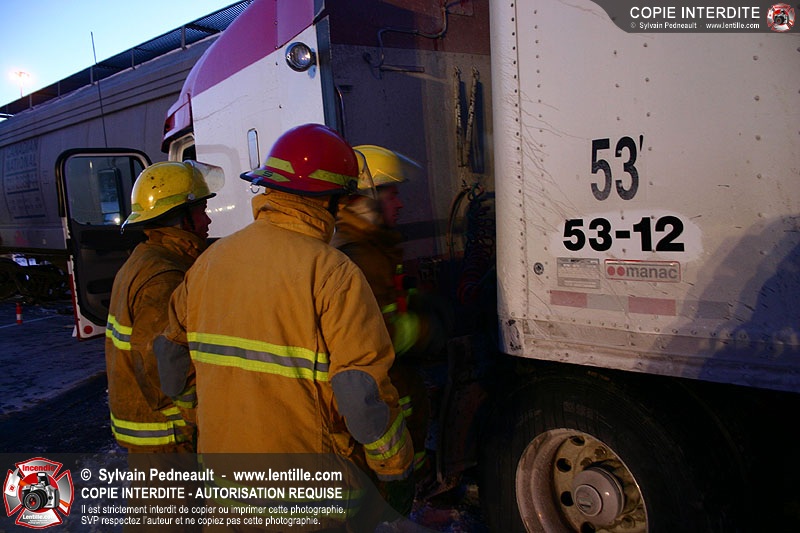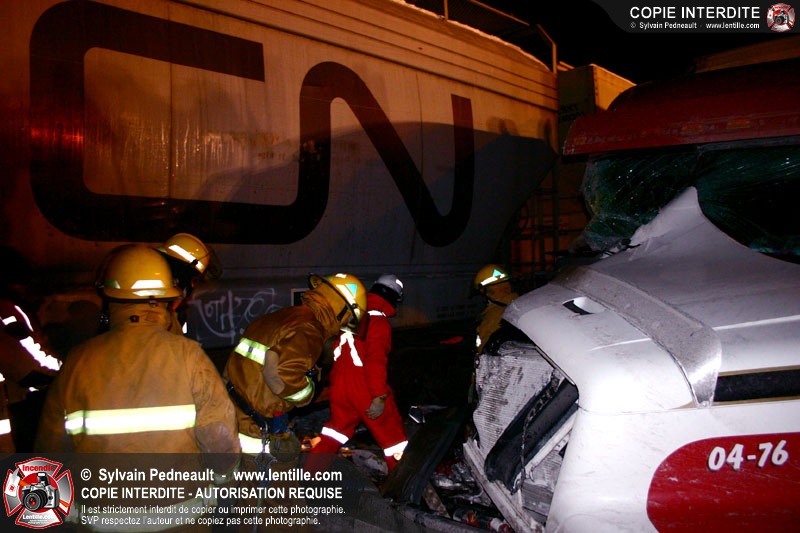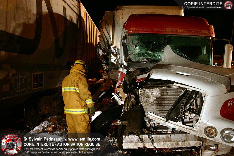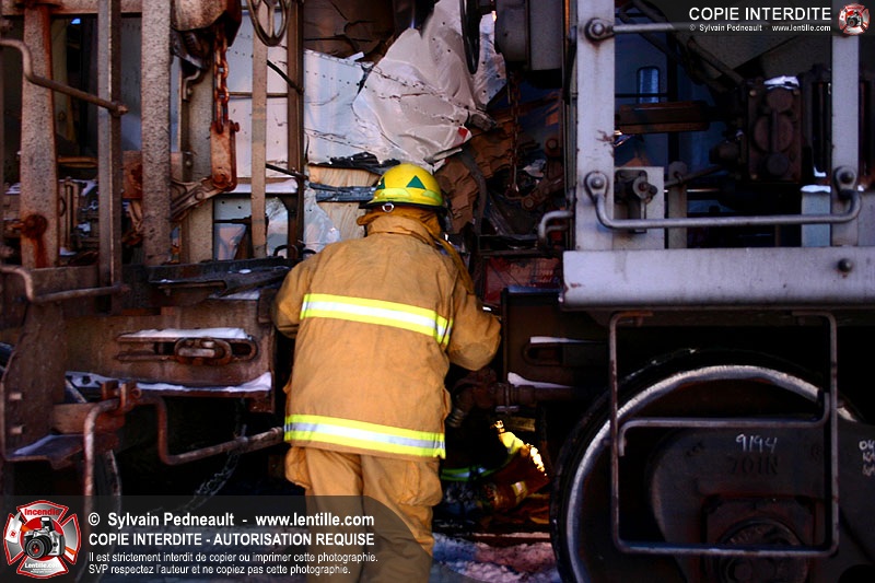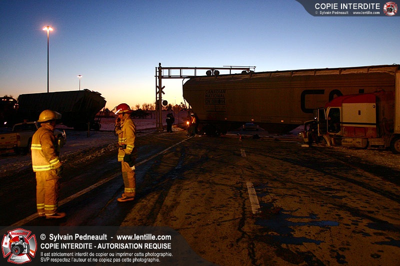 Un camion avec remorque percute un train traversant l'autoroute 20 à la hauteur du centre-ville de Saint-Hyacinthe. Les pompiers sont appelés sur les lieux pour évaluer et surveiller les risques d'incendie.