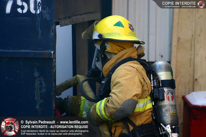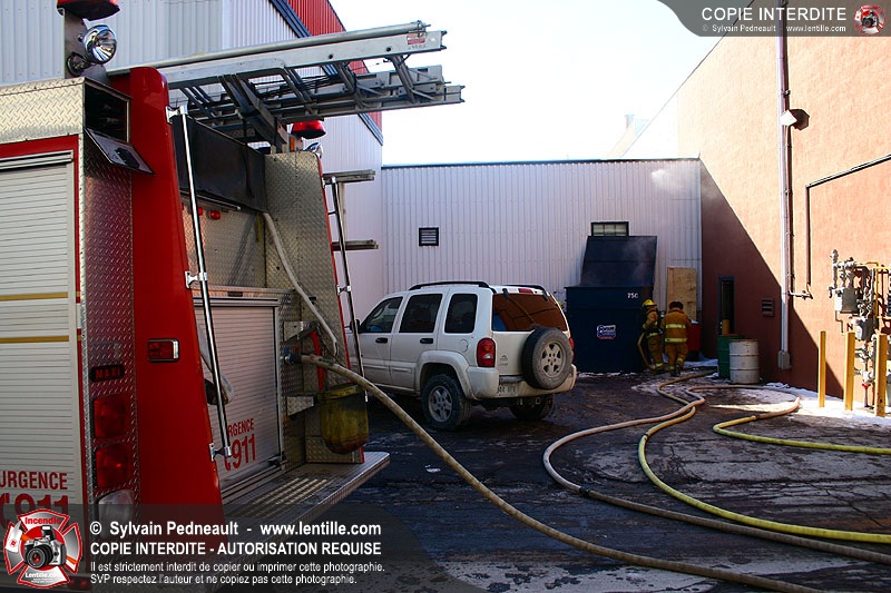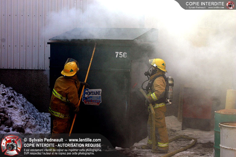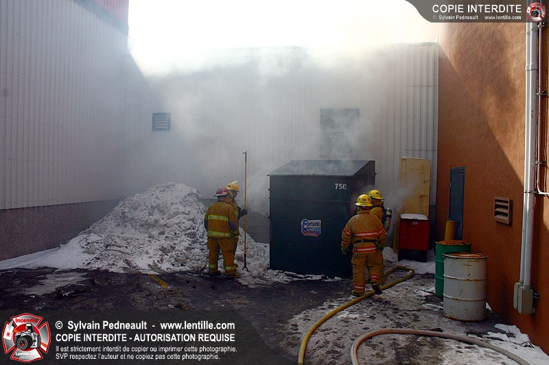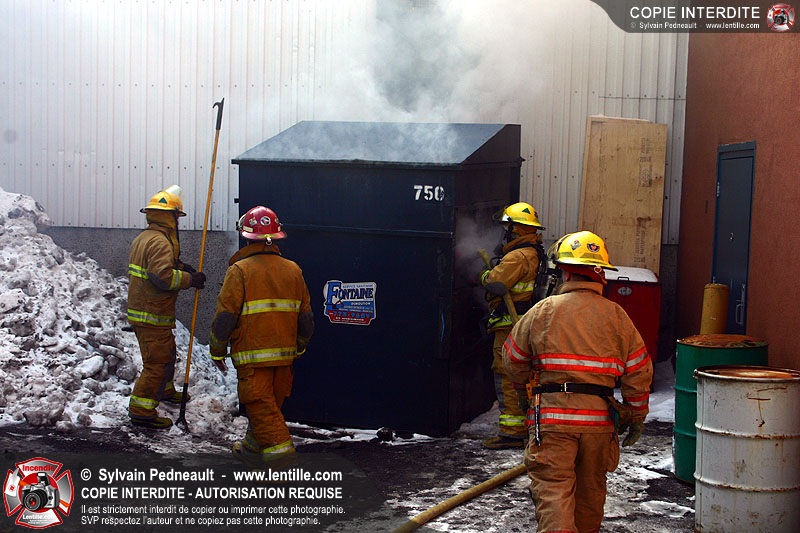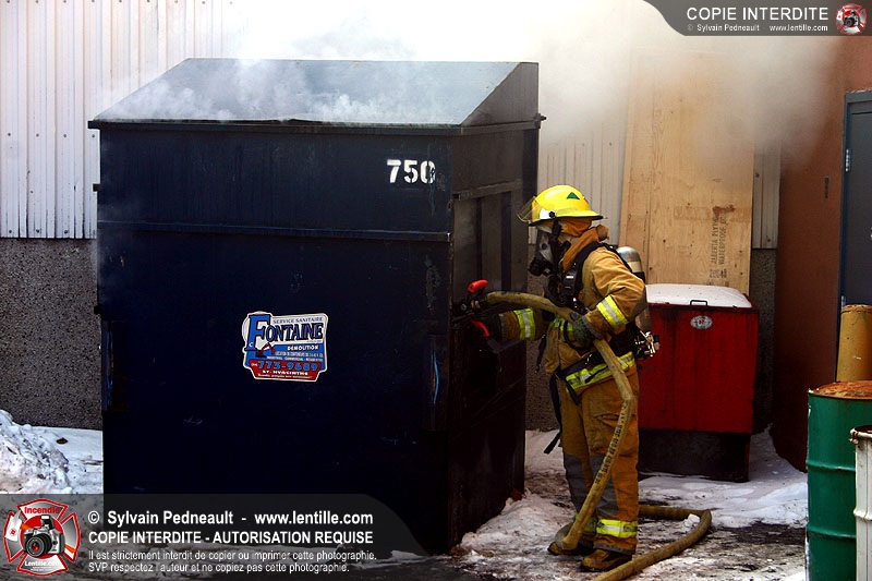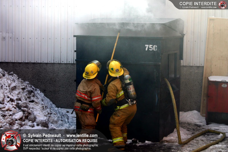 Un conteneur à déchets prend feu dans un espace restreint entre des édifices commerciaux. Le 205 répond à l'appel avec l'assistance de la caserne 3.