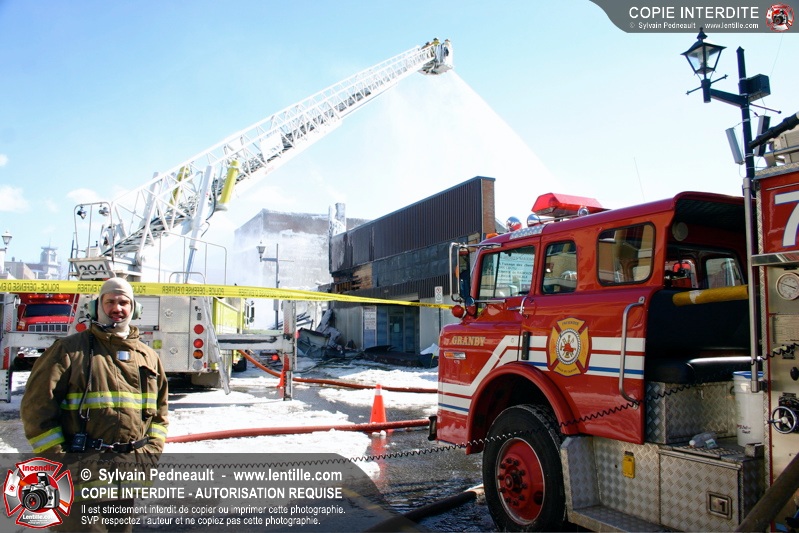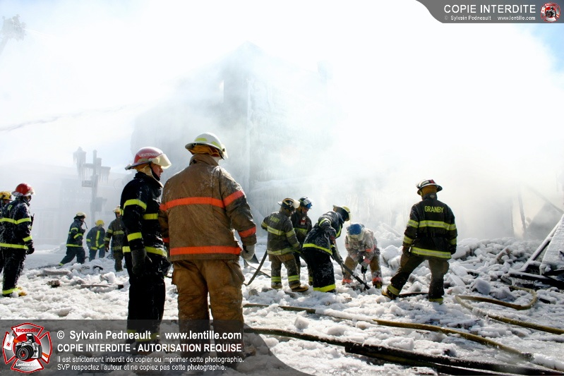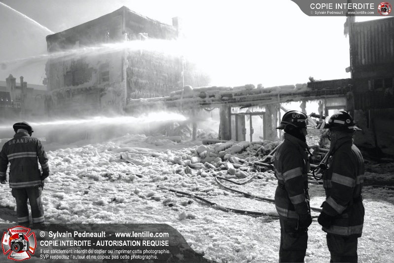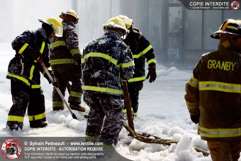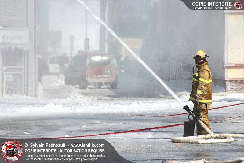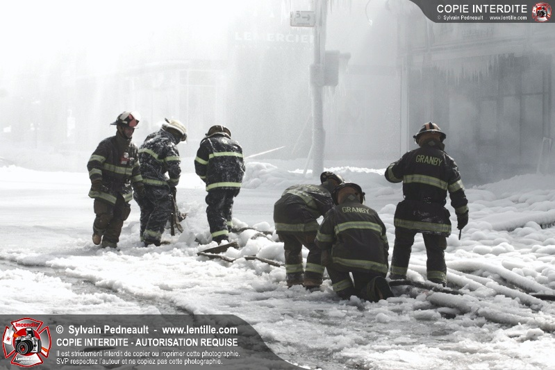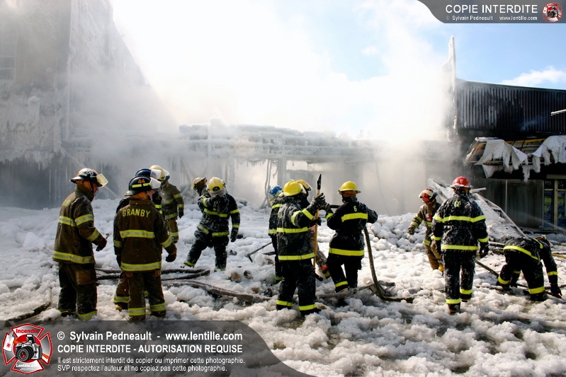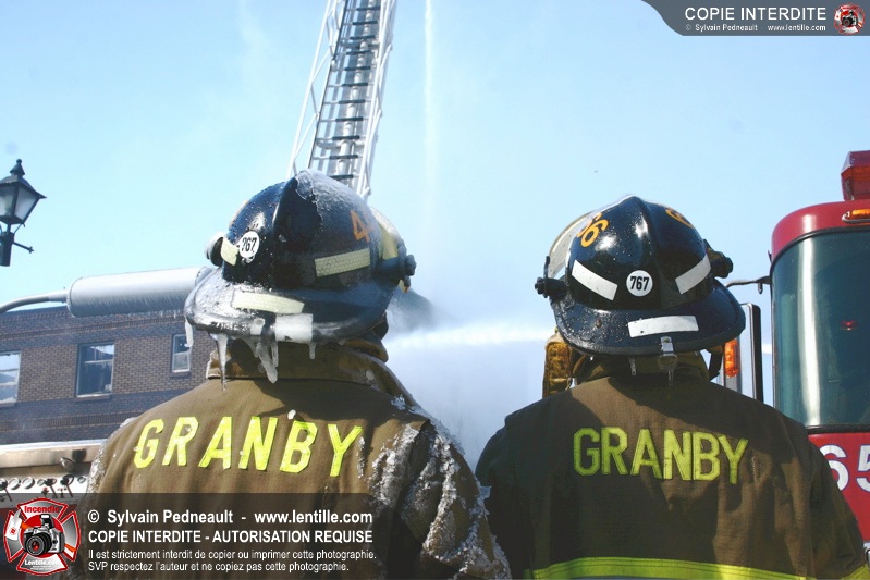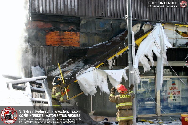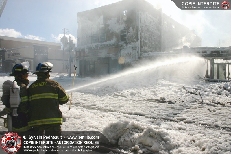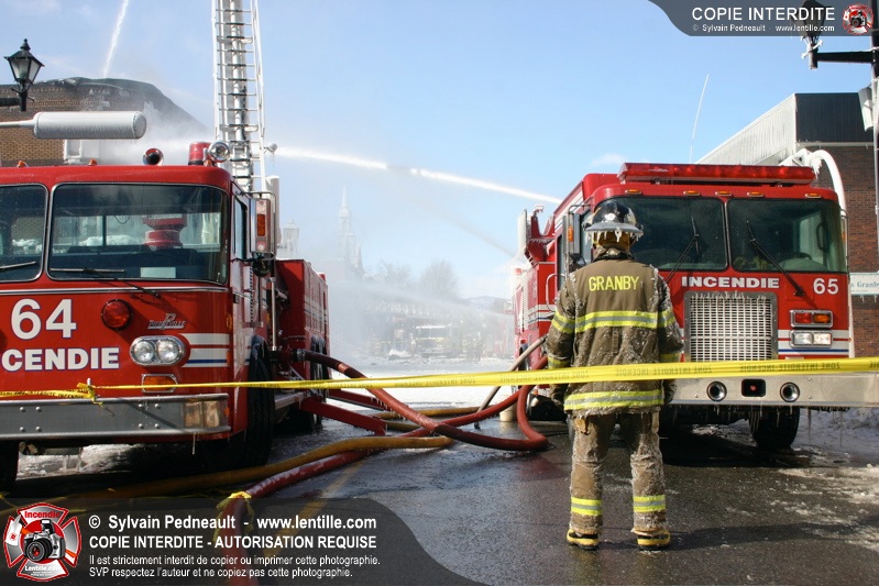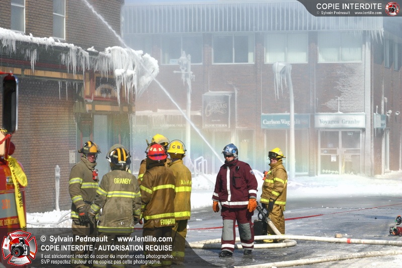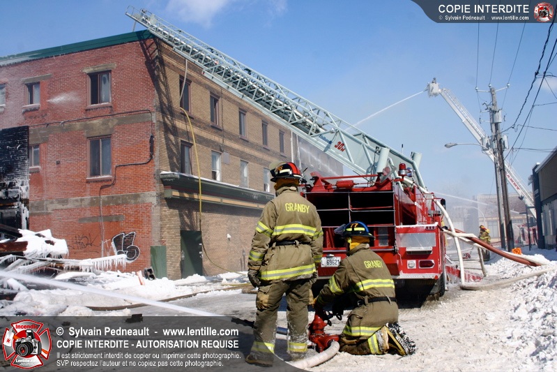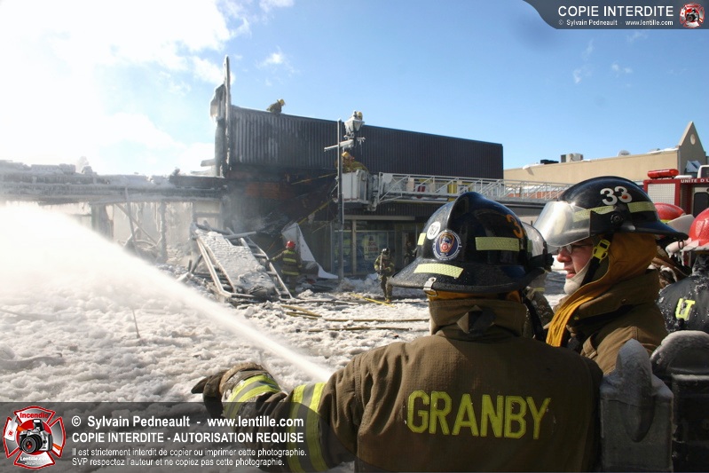Un incendie particulièrement violent a détruit plusieurs édifices d'un quadrilatère commercial à Granby. L'incendie a nécessité une 4ième alarme et plusieurs demandes d'entraide aux villes environnantes et à l'APAM. Quelques pompiers ont été blessés lorsqu'un mur de briques s'est effondré au secteur 5. -- Note aux pompiers en service sur cette intervention: vous pouvez commander vos photos au prix spécial Saint-Hyacinthe; elles seront livrées à la caserne de Granby à la fin mars