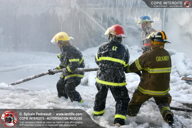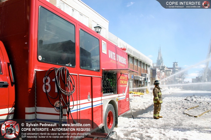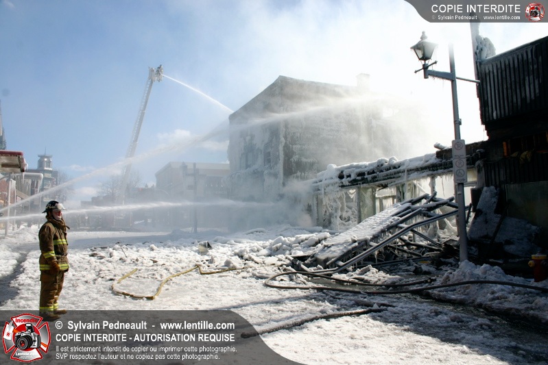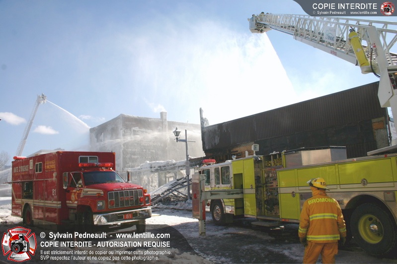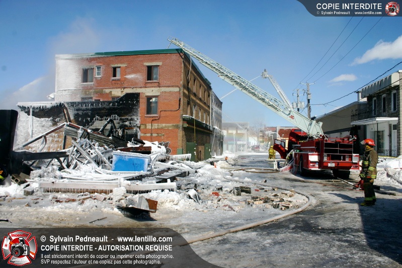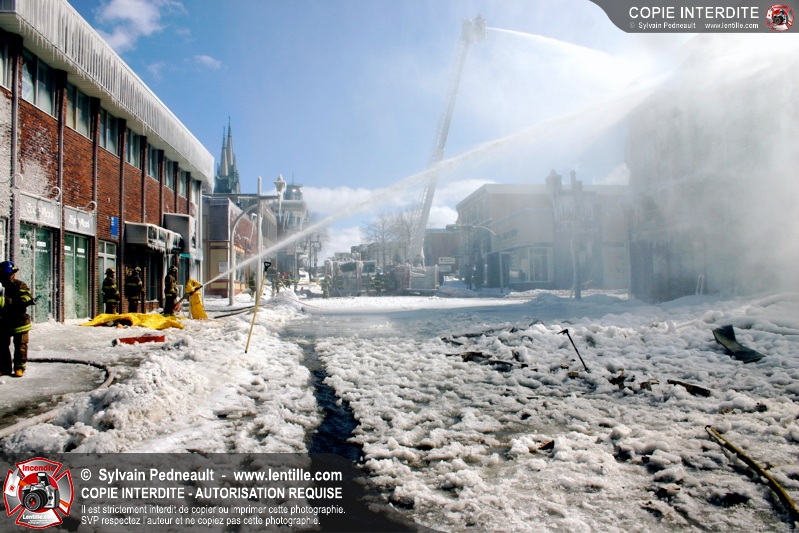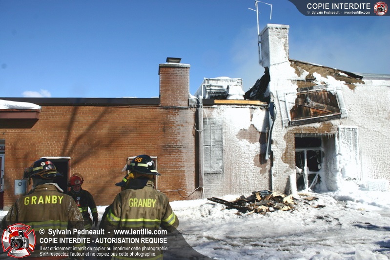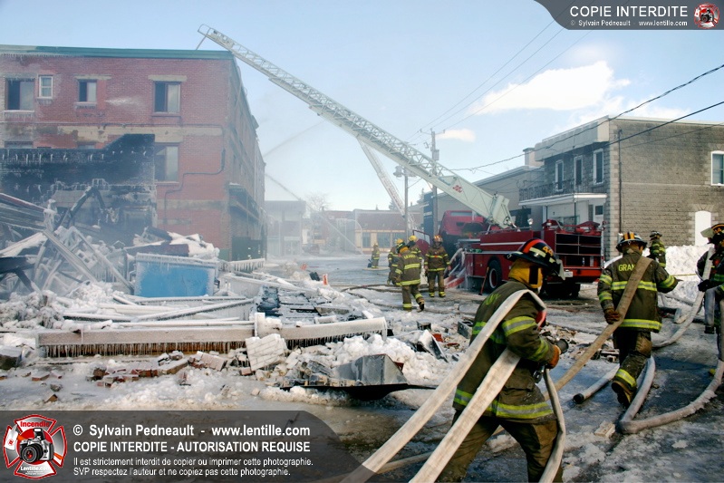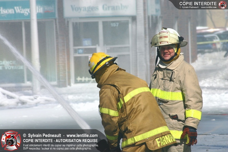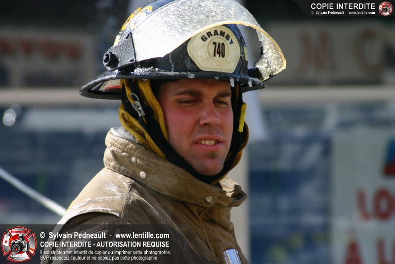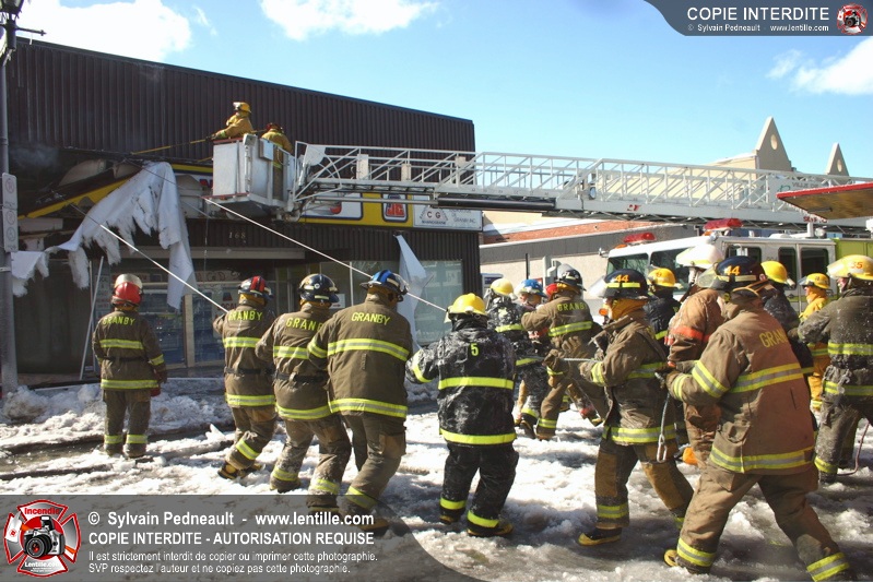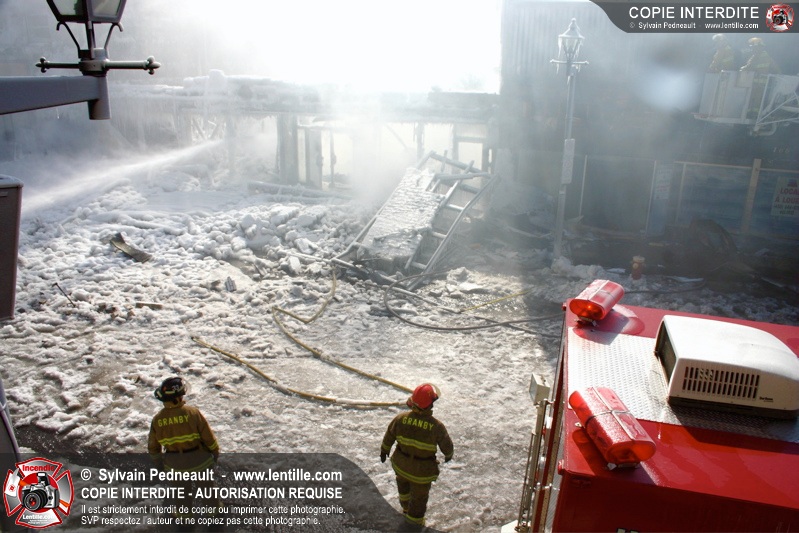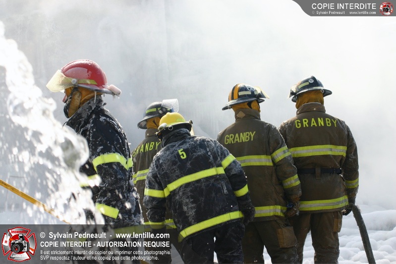 Un incendie particulièrement violent a détruit plusieurs édifices d'un quadrilatère commercial à Granby. L'incendie a nécessité une 4ième alarme et plusieurs demandes d'entraide aux villes environnantes et à l'APAM. Quelques pompiers ont été blessés lorsqu'un mur de briques s'est effondré au secteur 5. -- Note aux pompiers en service sur cette intervention: vous pouvez commander vos photos au prix spécial Saint-Hyacinthe; elles seront livrées à la caserne de Granby à la fin mars