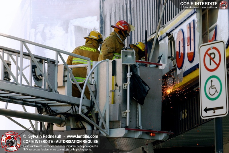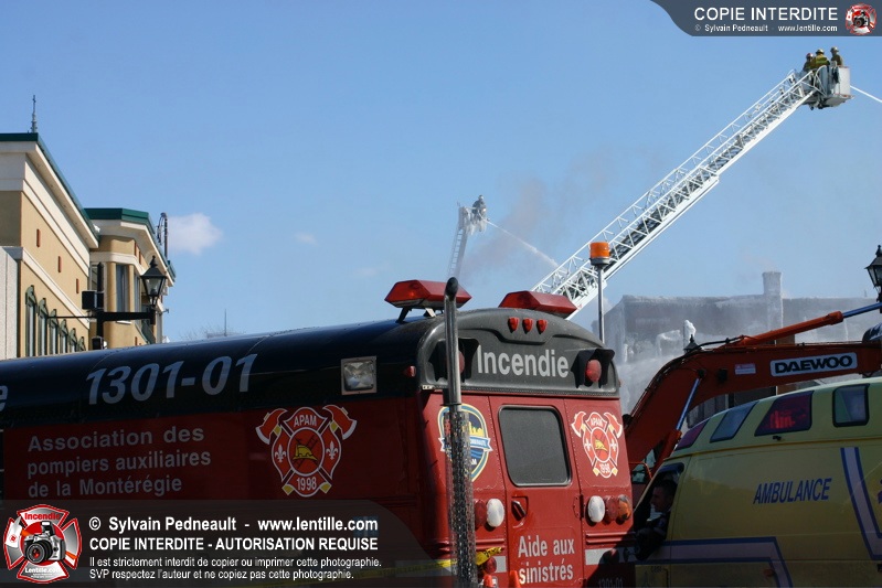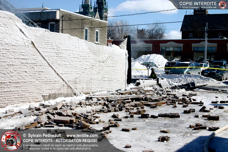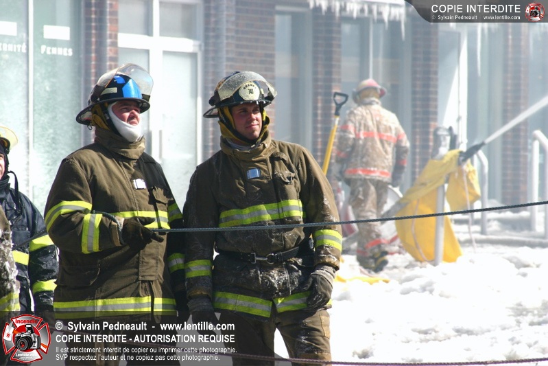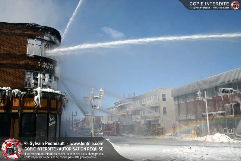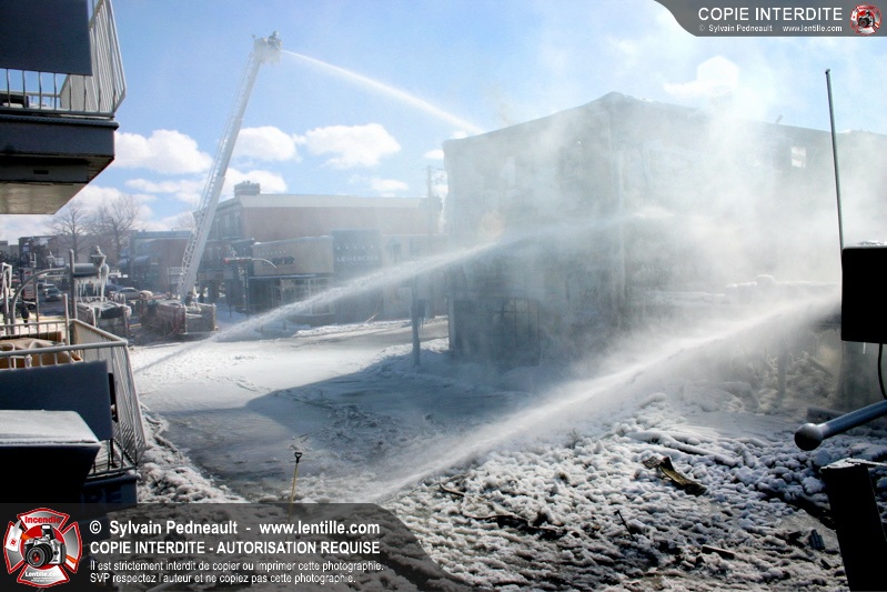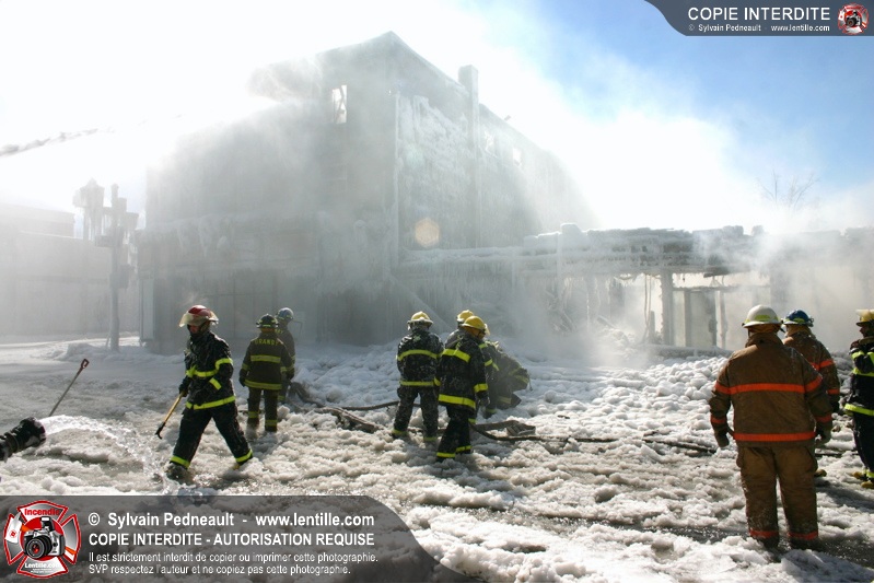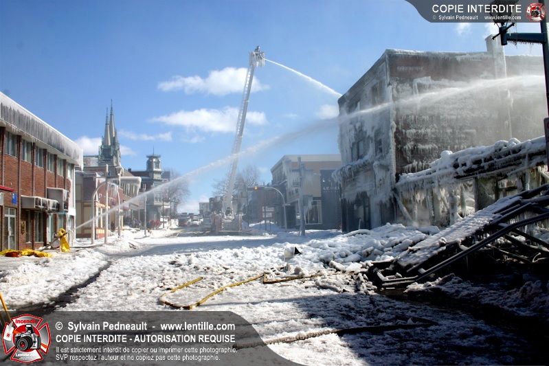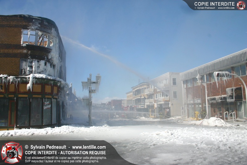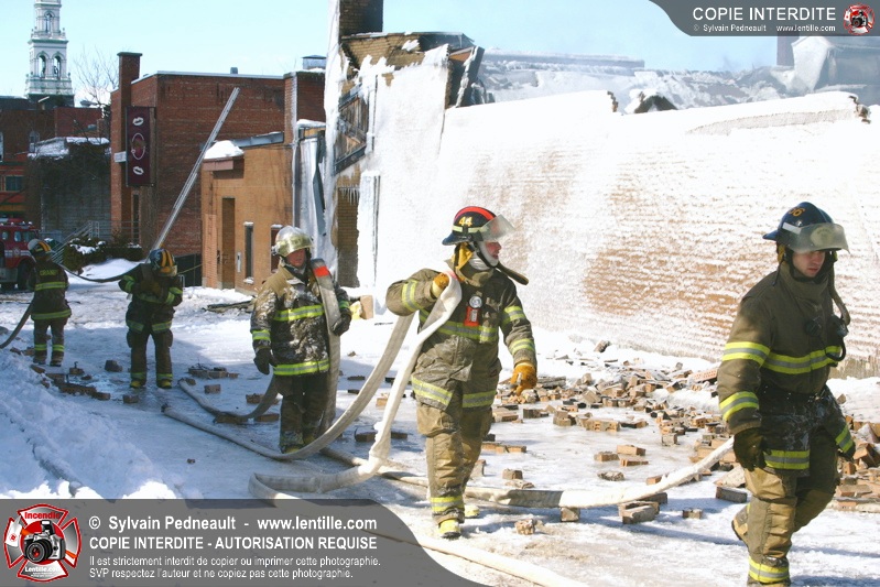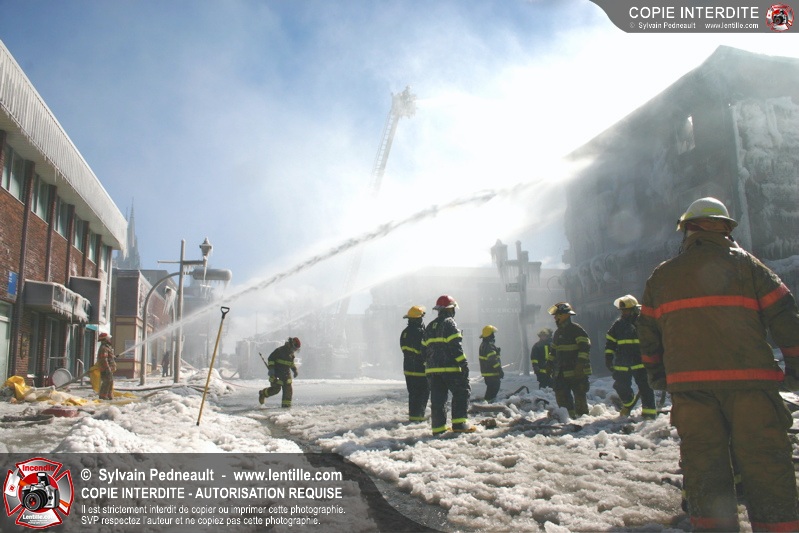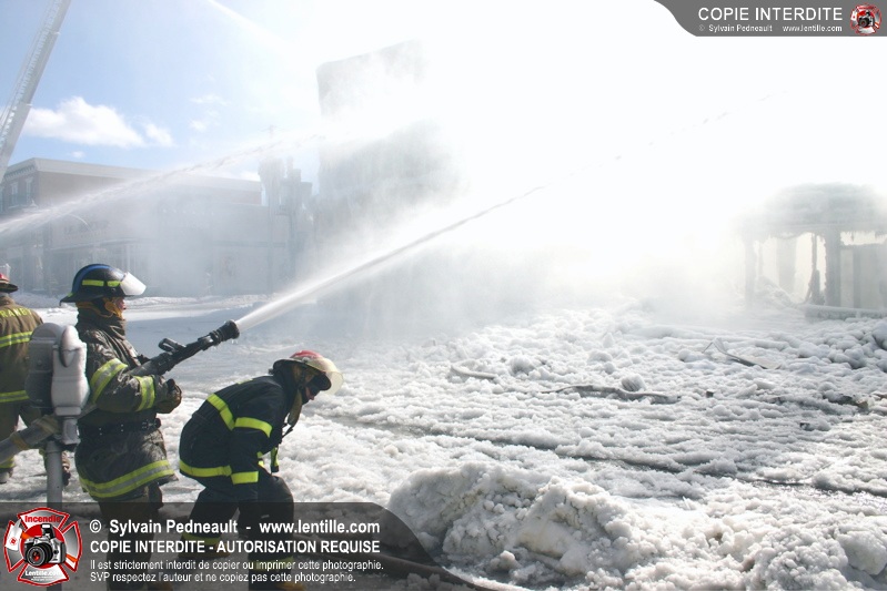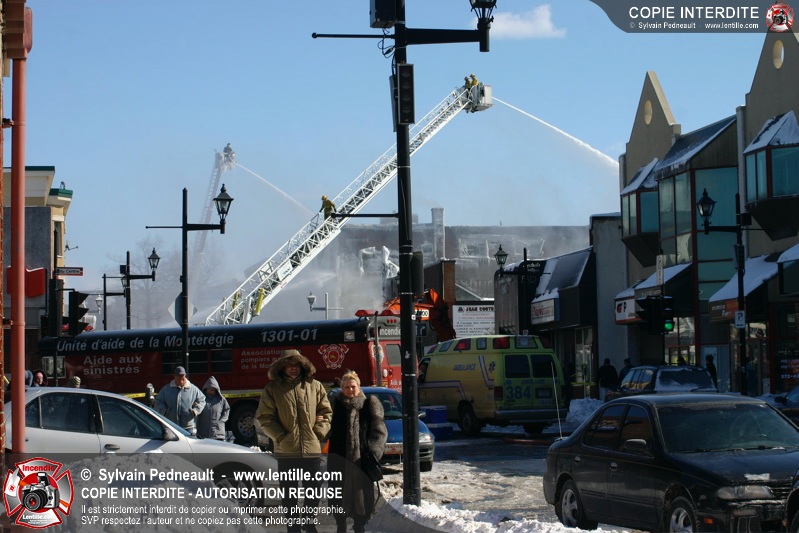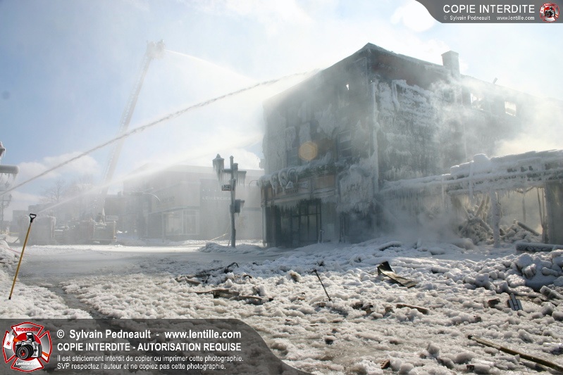 Un incendie particulièrement violent a détruit plusieurs édifices d'un quadrilatère commercial à Granby. L'incendie a nécessité une 4ième alarme et plusieurs demandes d'entraide aux villes environnantes et à l'APAM. Quelques pompiers ont été blessés lorsqu'un mur de briques s'est effondré au secteur 5. -- Note aux pompiers en service sur cette intervention: vous pouvez commander vos photos au prix spécial Saint-Hyacinthe; elles seront livrées à la caserne de Granby à la fin mars