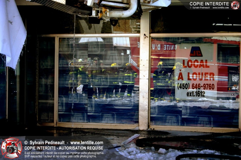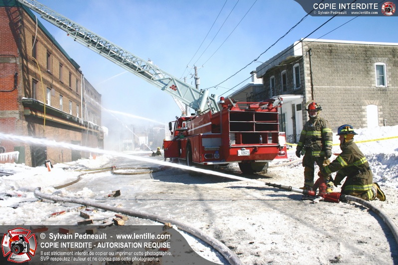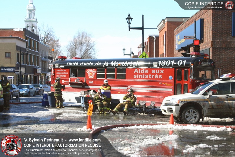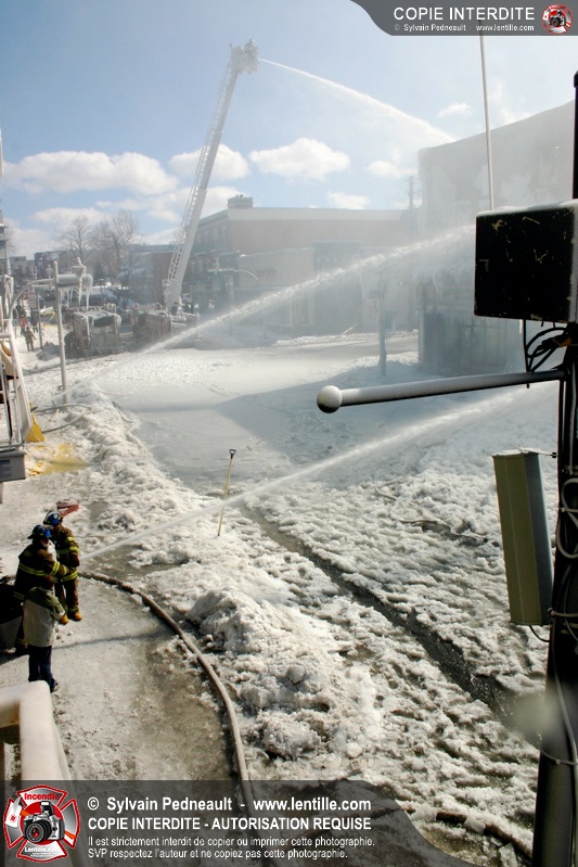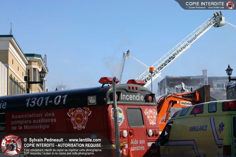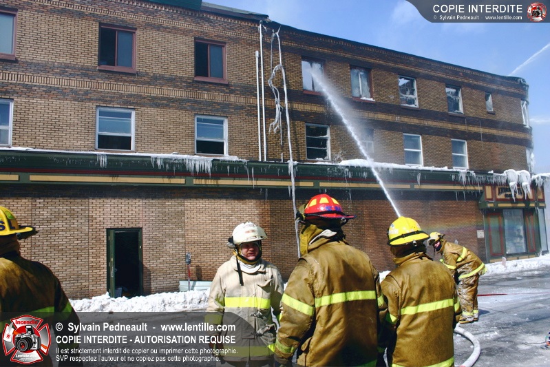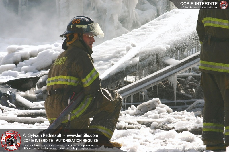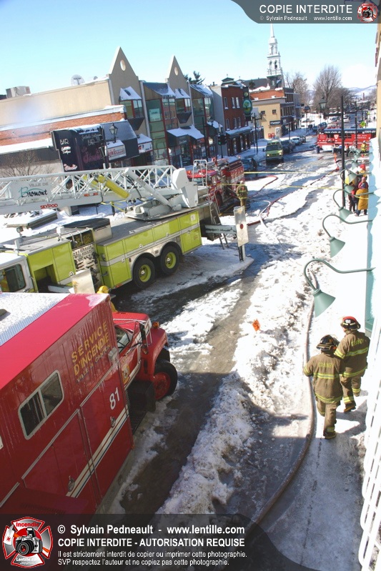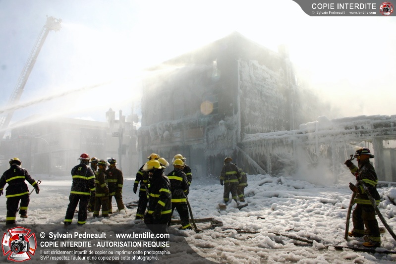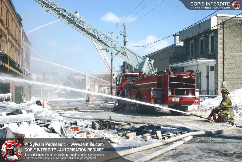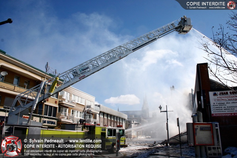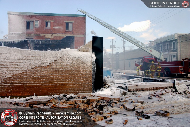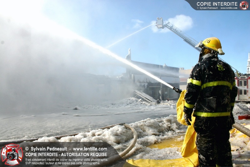 Un incendie particulièrement violent a détruit plusieurs édifices d'un quadrilatère commercial à Granby. L'incendie a nécessité une 4ième alarme et plusieurs demandes d'entraide aux villes environnantes et à l'APAM. Quelques pompiers ont été blessés lorsqu'un mur de briques s'est effondré au secteur 5. -- Note aux pompiers en service sur cette intervention: vous pouvez commander vos photos au prix spécial Saint-Hyacinthe; elles seront livrées à la caserne de Granby à la fin mars