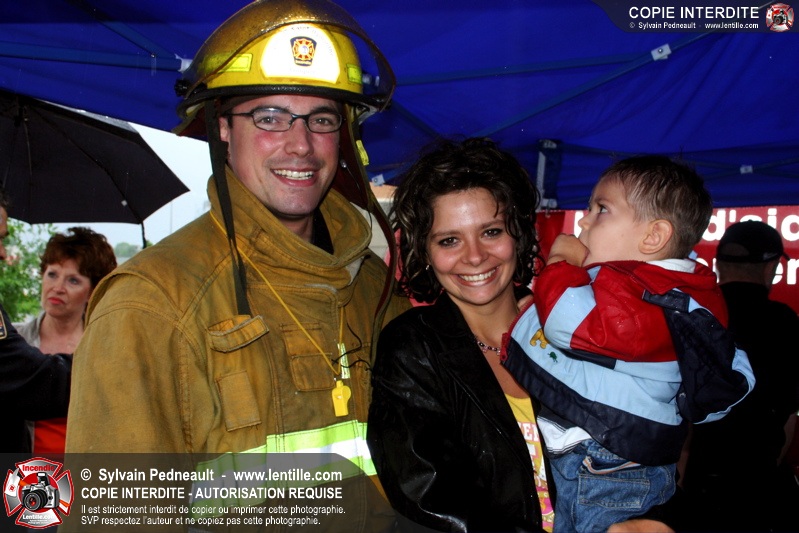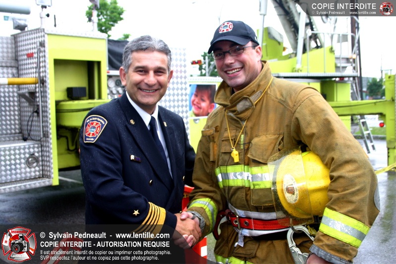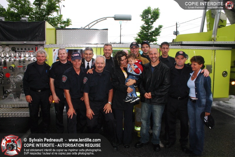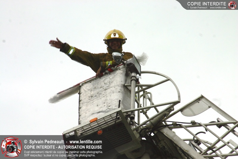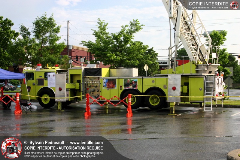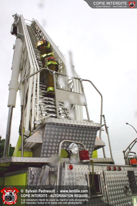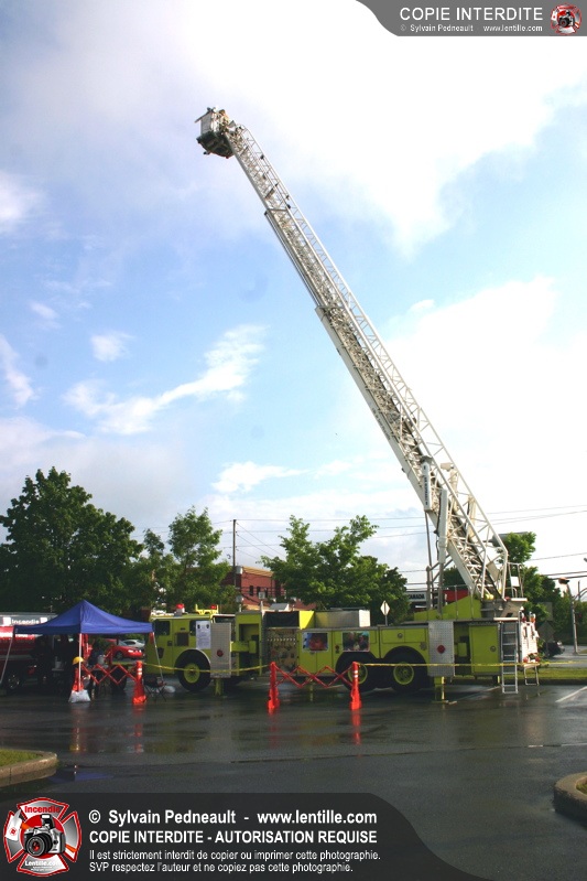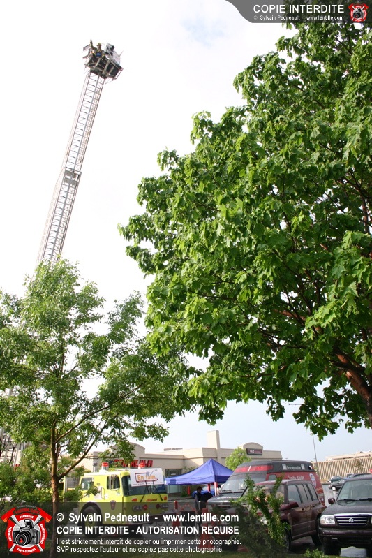 Bravant un violent orage, le pompier Sylvain Beauvais du Service de sécurité incendie de Saint-Hyacinthe a entammé un échelle-o-thon de 30 heures en ce 15 juin 2005 à midi.