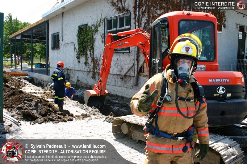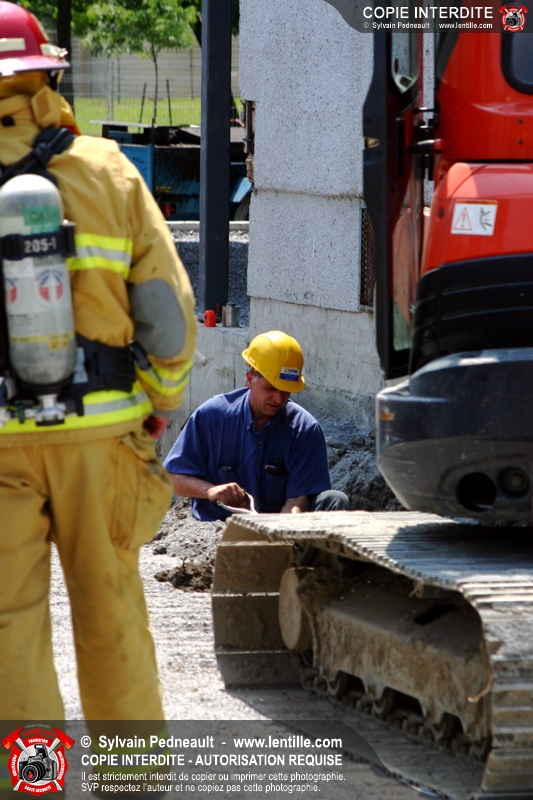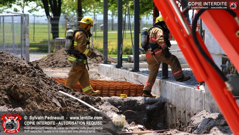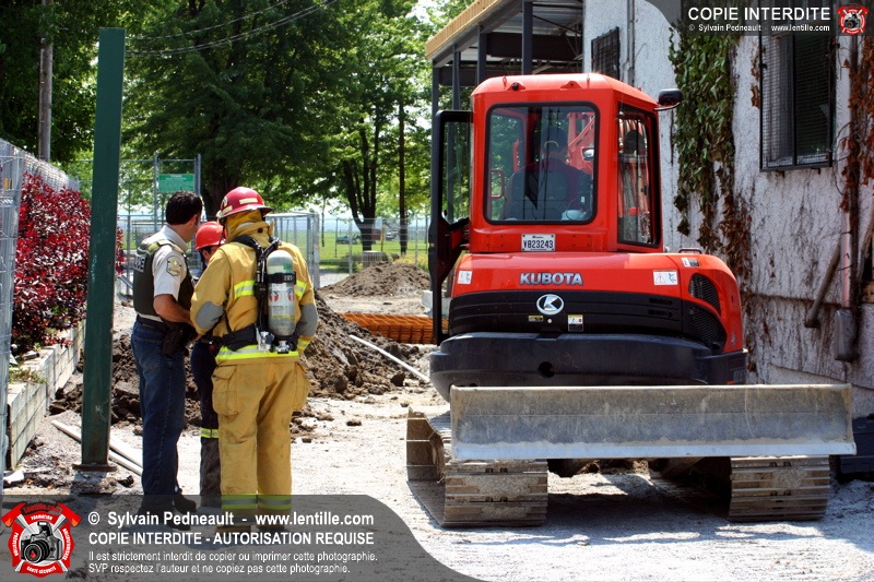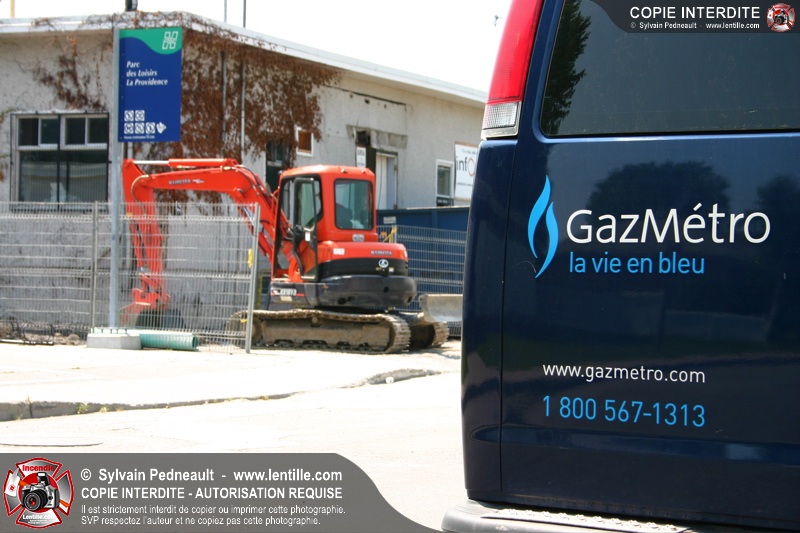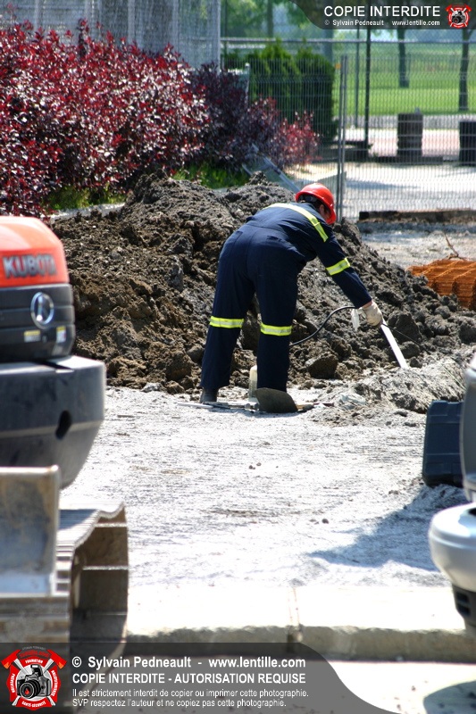 Pendant des travaux de construction, une conduite de gaz est brisée et une fuite survient. Les pompiers sont appelés pour sécuriser le périmètre, installer une lance de protection et relever les concentrations de gaz.
