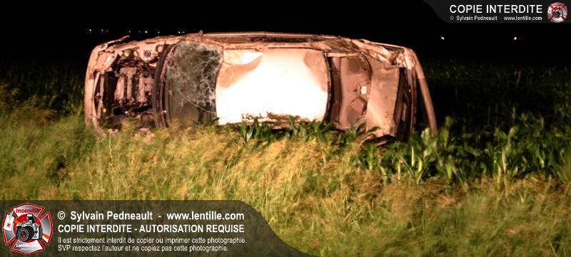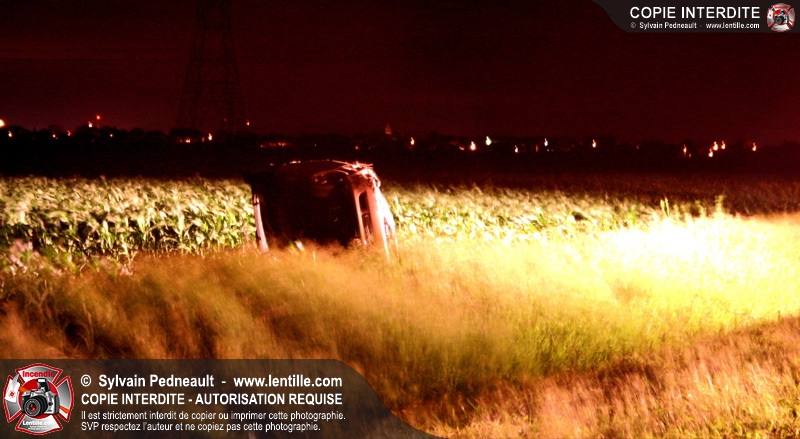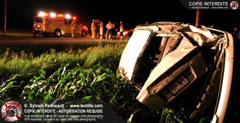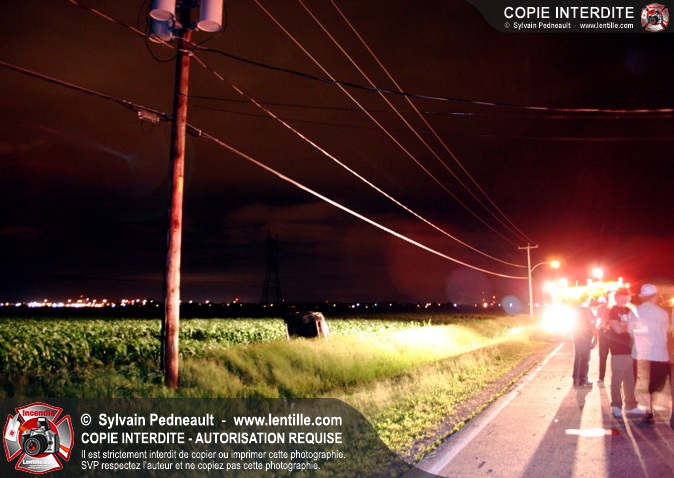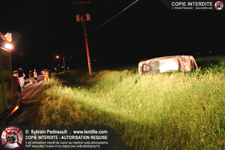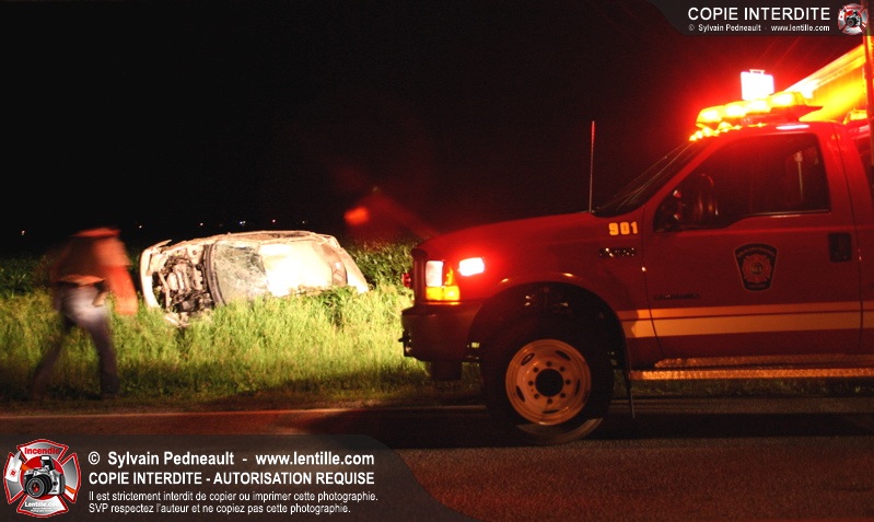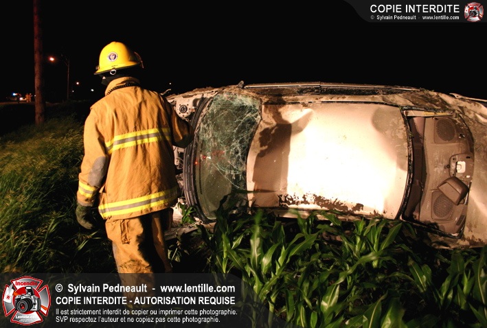 Suite à une perte de contrôle, un véhicule fait plusieurs tonneaux sur une distance de 75 mètres (250 pieds) et se retrouve sur le côté dans un champ de maïs. Les trois occupants ont été éjectés du véhicule par la force des multiples impacts avec le sol. Les pompiers de Saint-Hyacinthe ont répondu à l'appel.