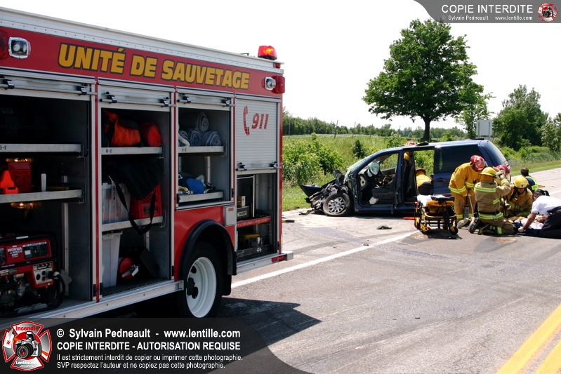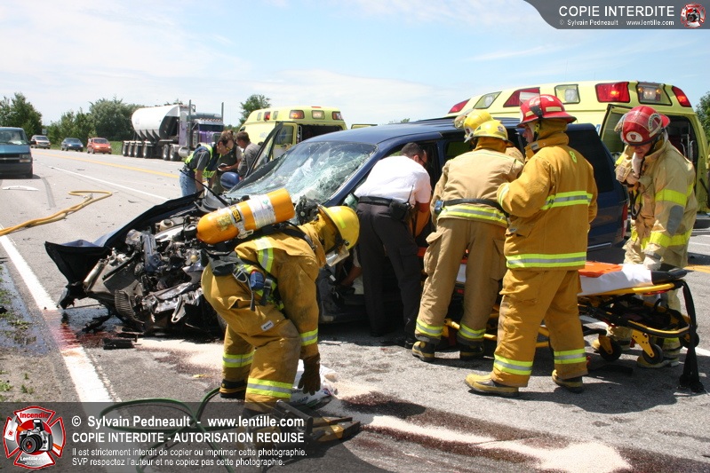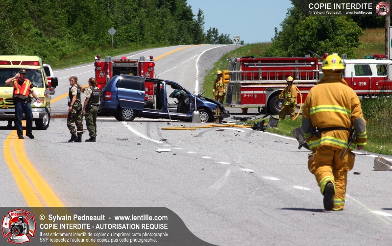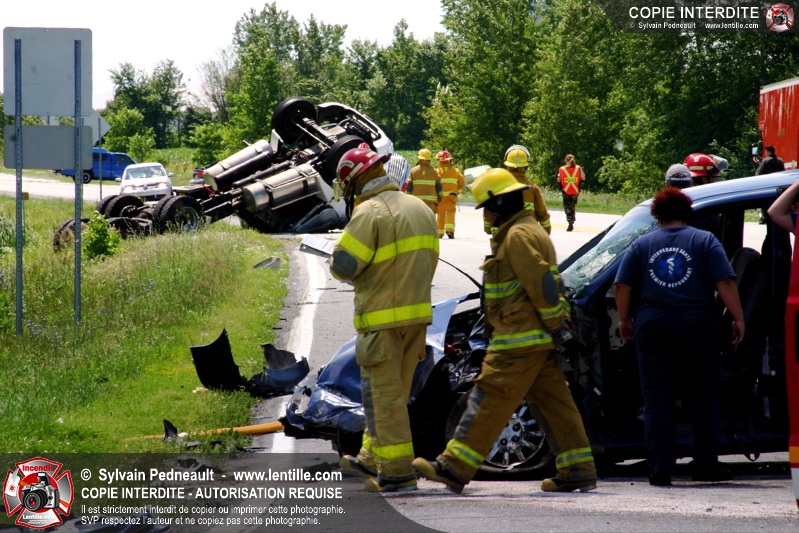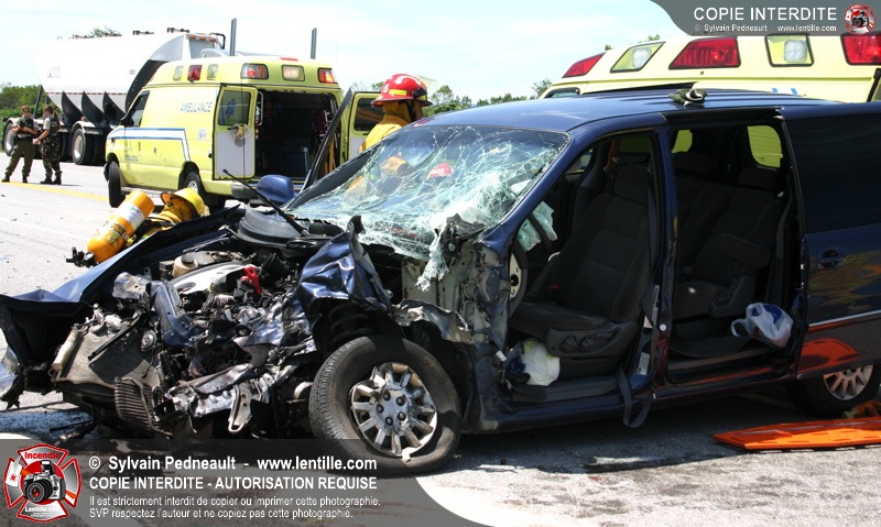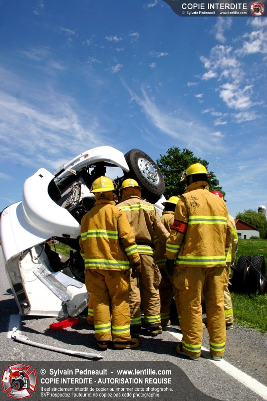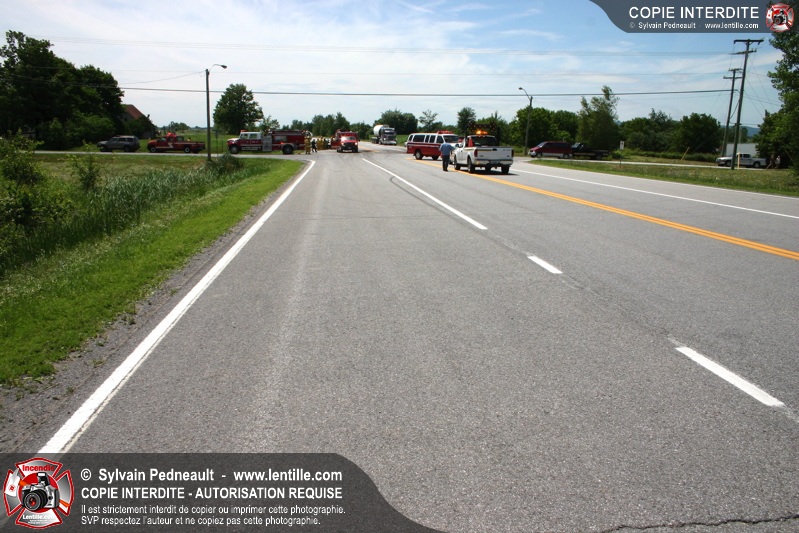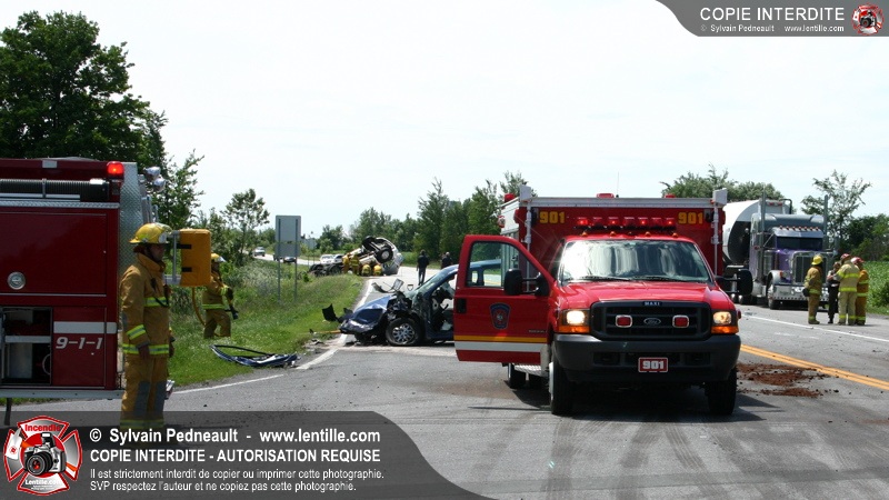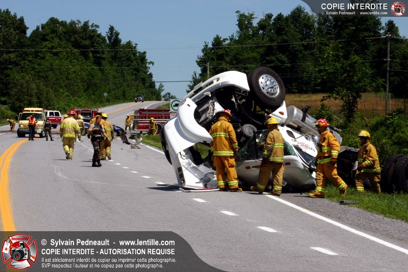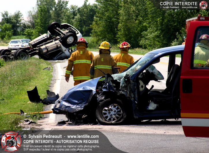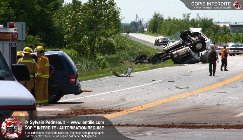 Peu après midi, un camion percute avec force une minifourgonette sur la route 235 à St-Pie. L'impact est si violent que le camion est projeté une centaine de mètres plus loin, à l'envers sur le bord de la route.