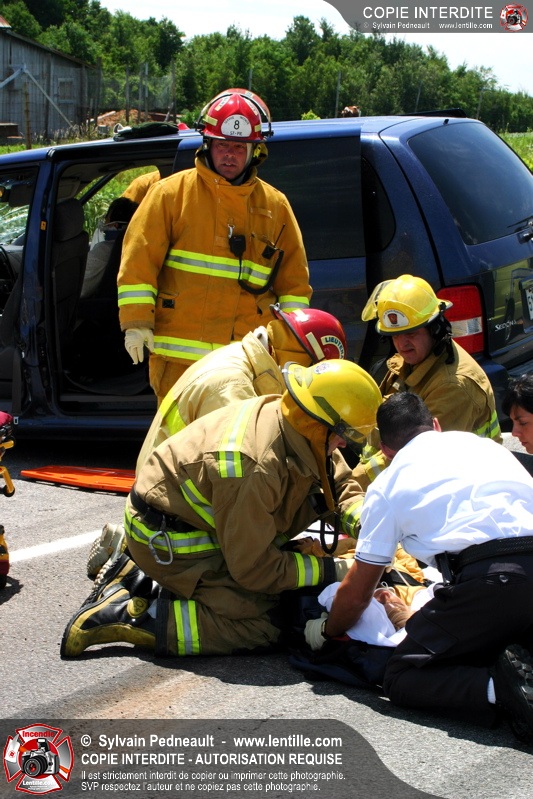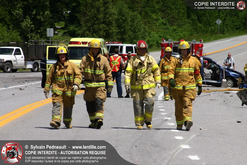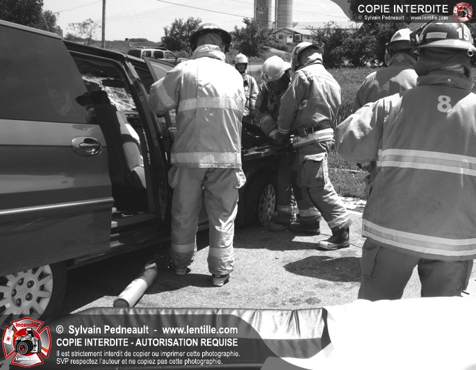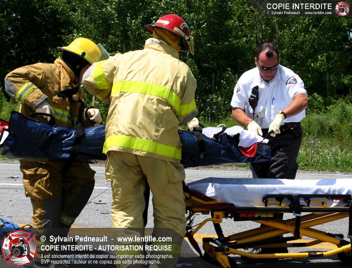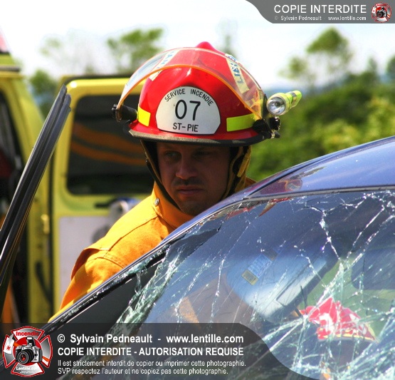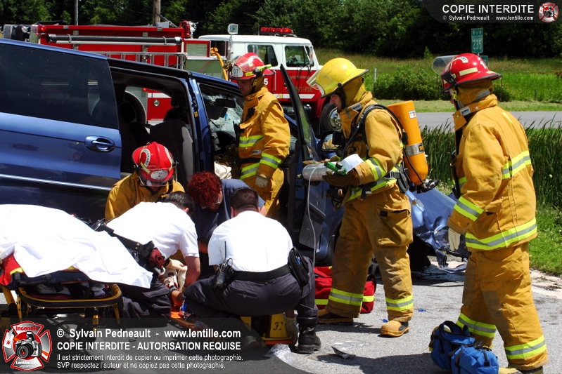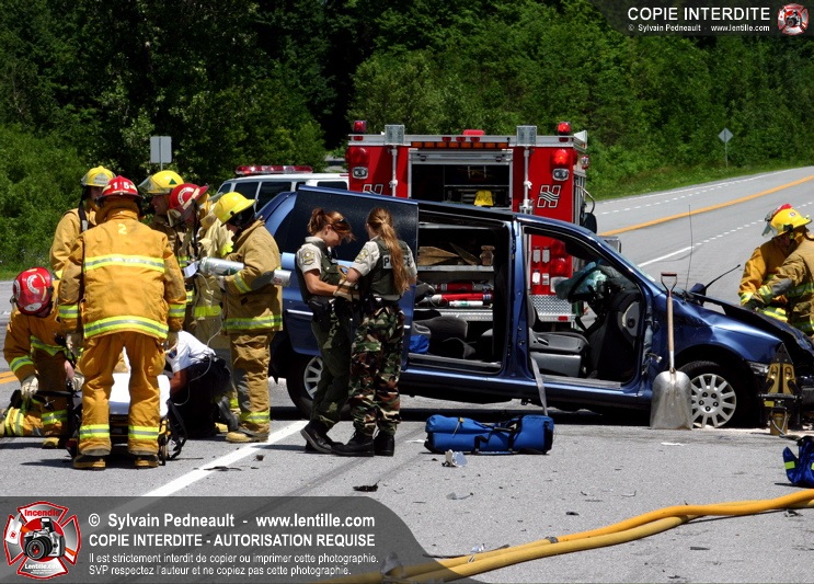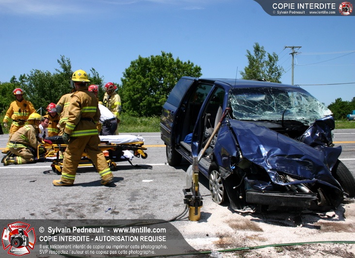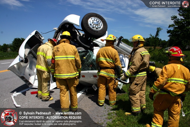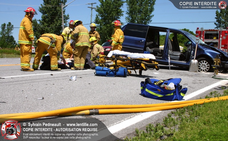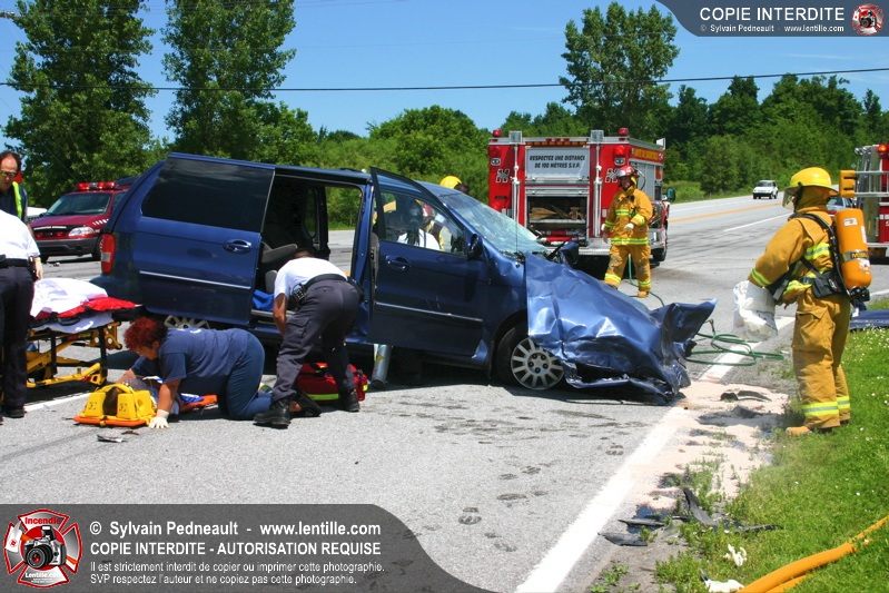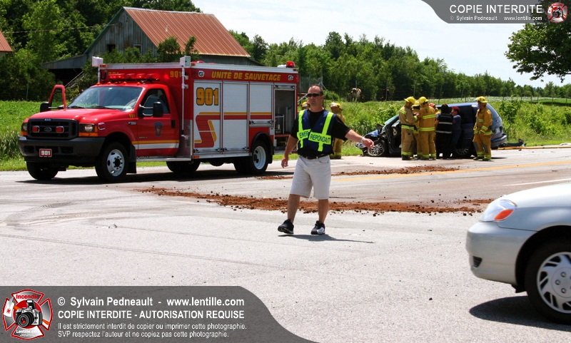Peu après midi, un camion percute avec force une minifourgonette sur la route 235 à St-Pie. L'impact est si violent que le camion est projeté une centaine de mètres plus loin, à l'envers sur le bord de la route.