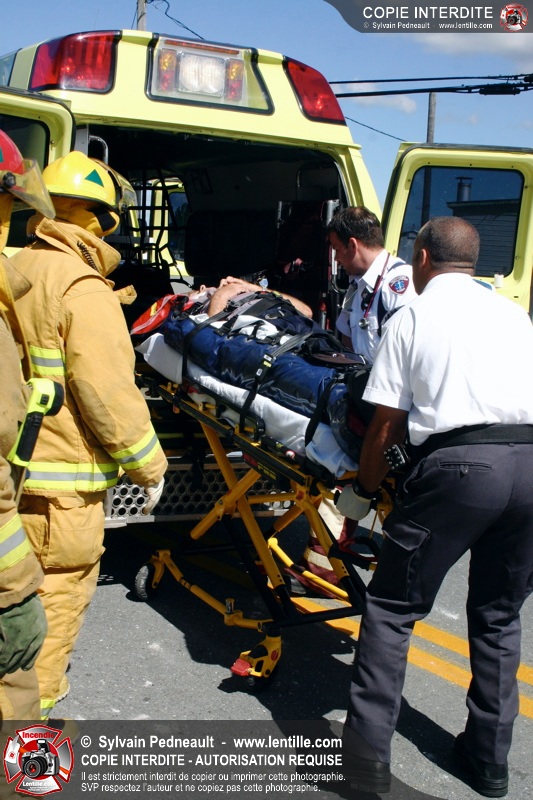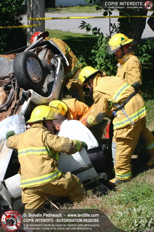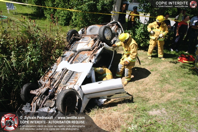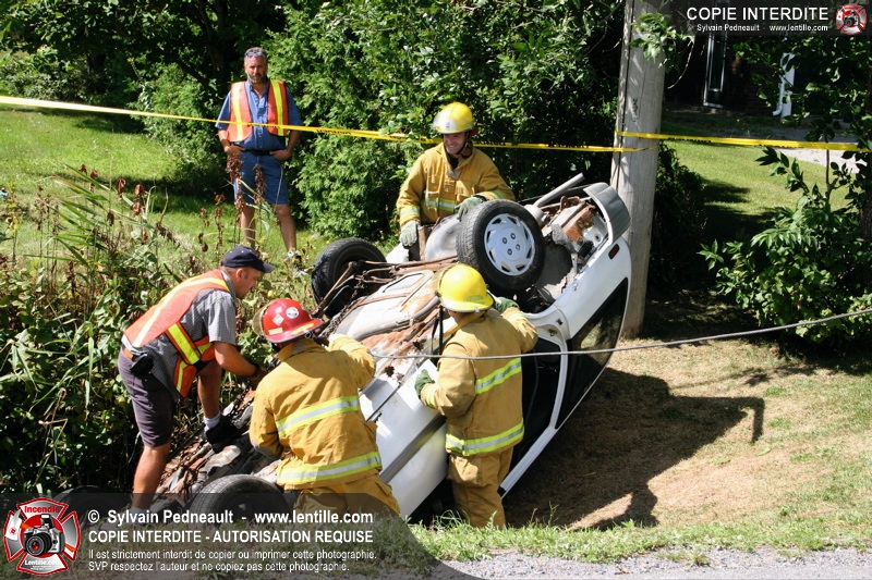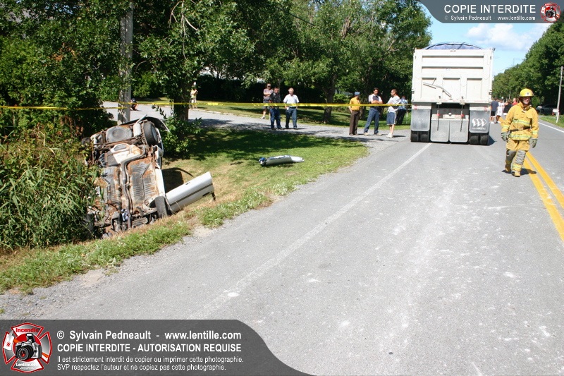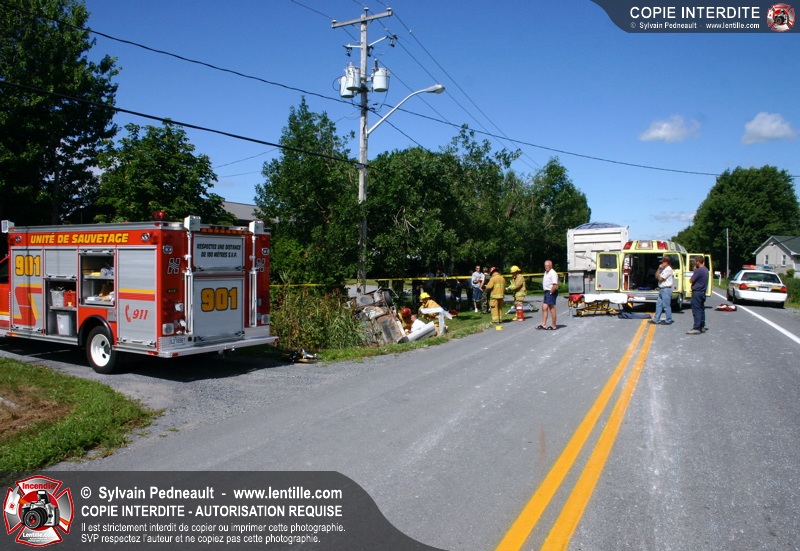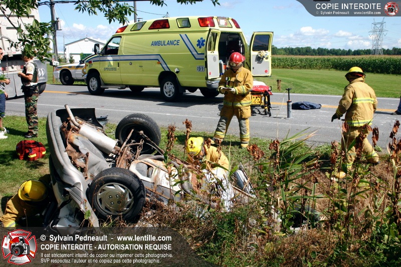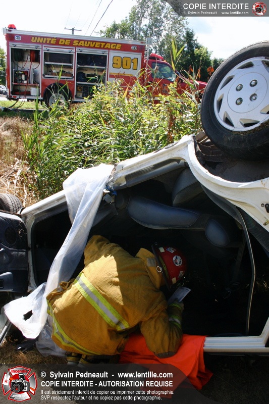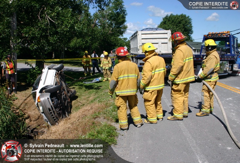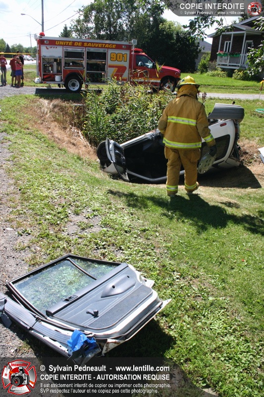 Une voiture percutée par un camion a quitté la route et s'est retrouvée à l'envers dans le fossé. Le Service de Sécurité Incendie de Saint-Hyacinthe a effectué la désincarcération.