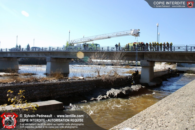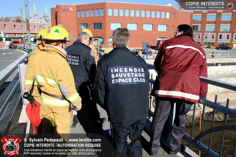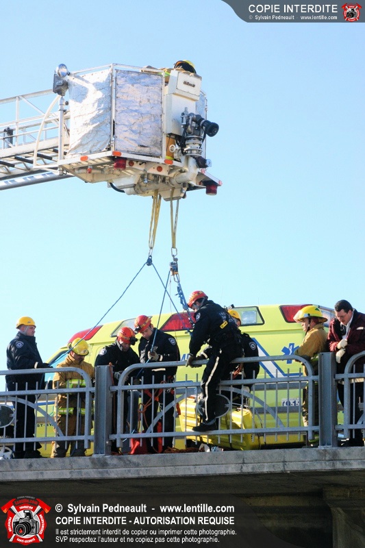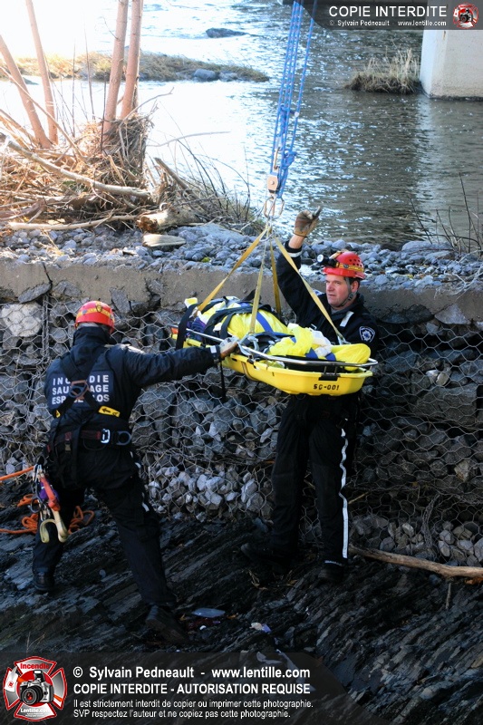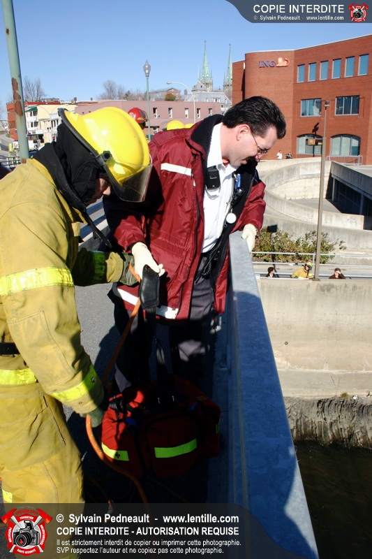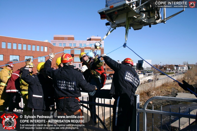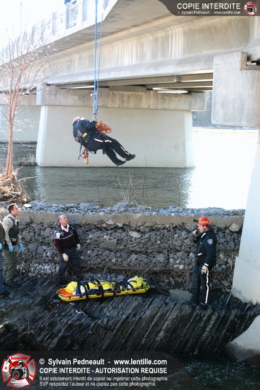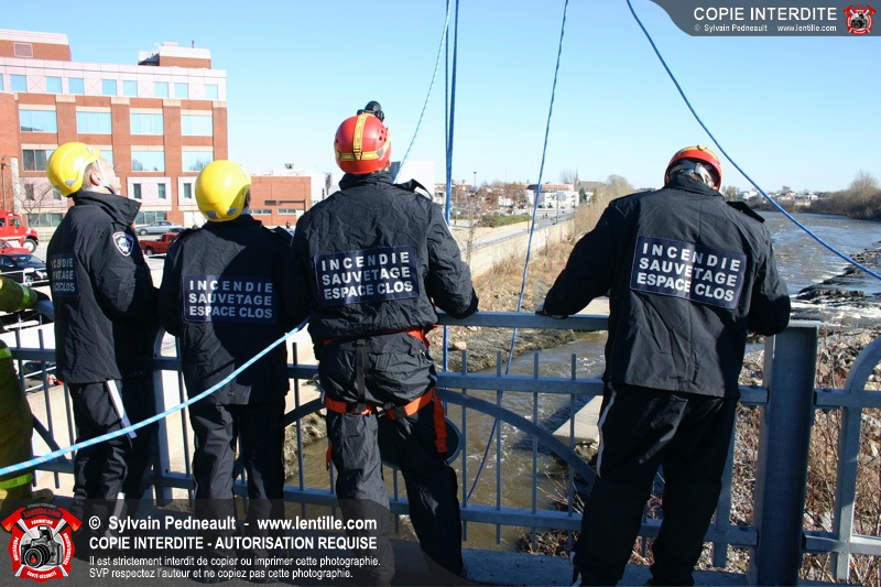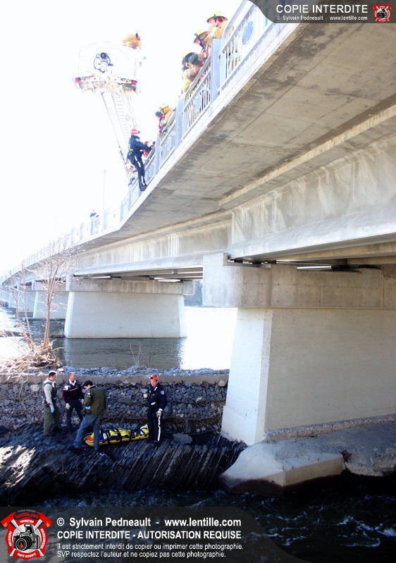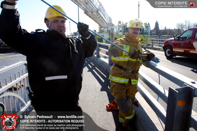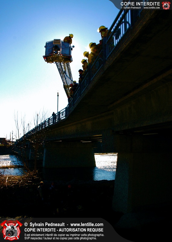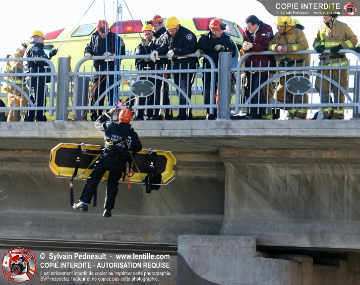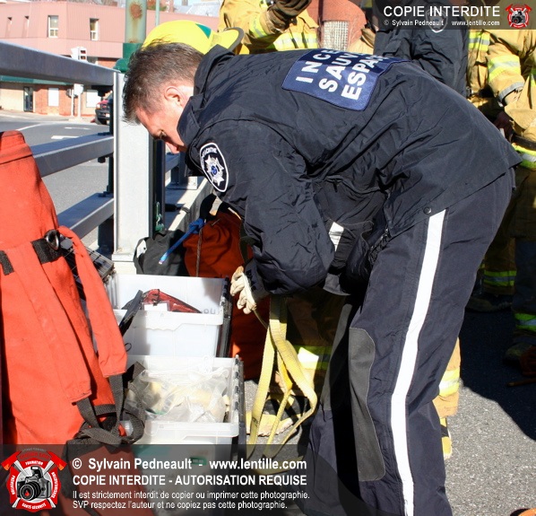 L'équipe de sauvetage en espace clos du Service de sécurité incendie de Saint-Hyacinthe intervient au pont Barsalou pour remonter le corps d'un homme gisant sur une surface rocheuse difficile d'accès sous le pont. L'intervention est suivie d'un debriefing et de la remise en état de l'équipement.