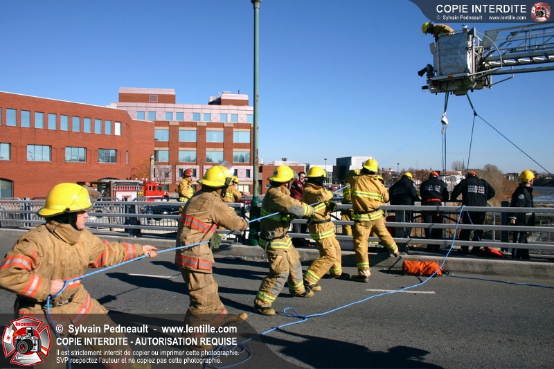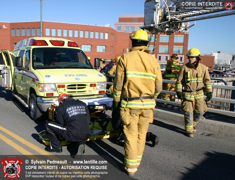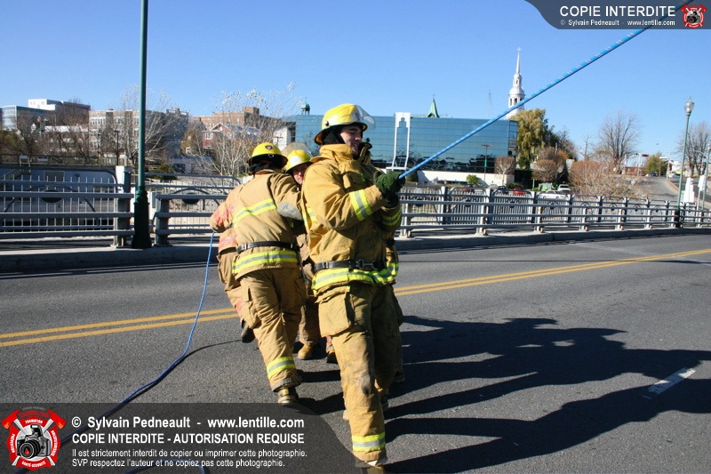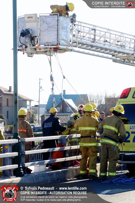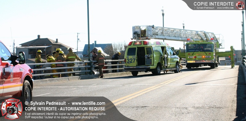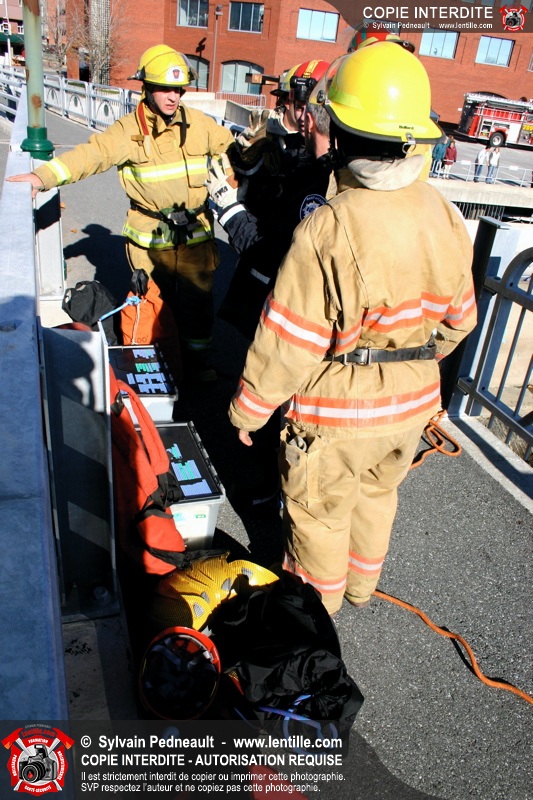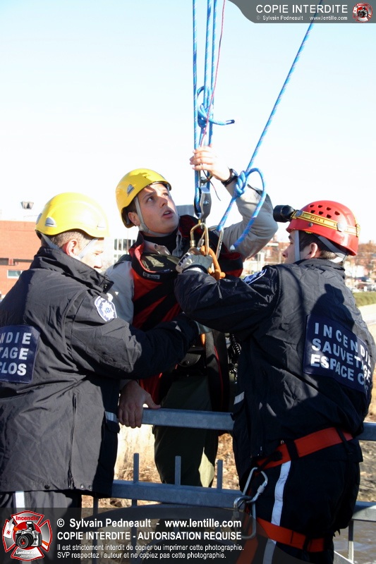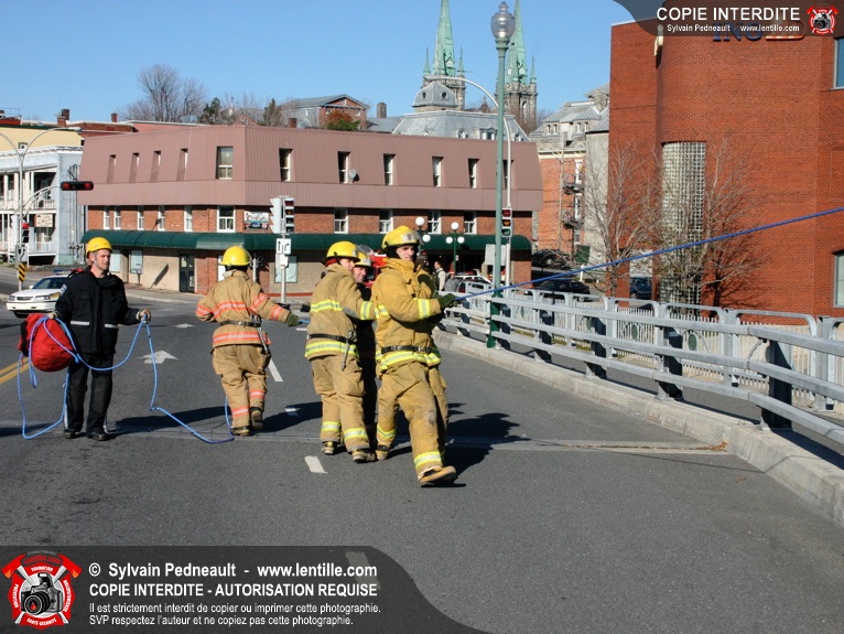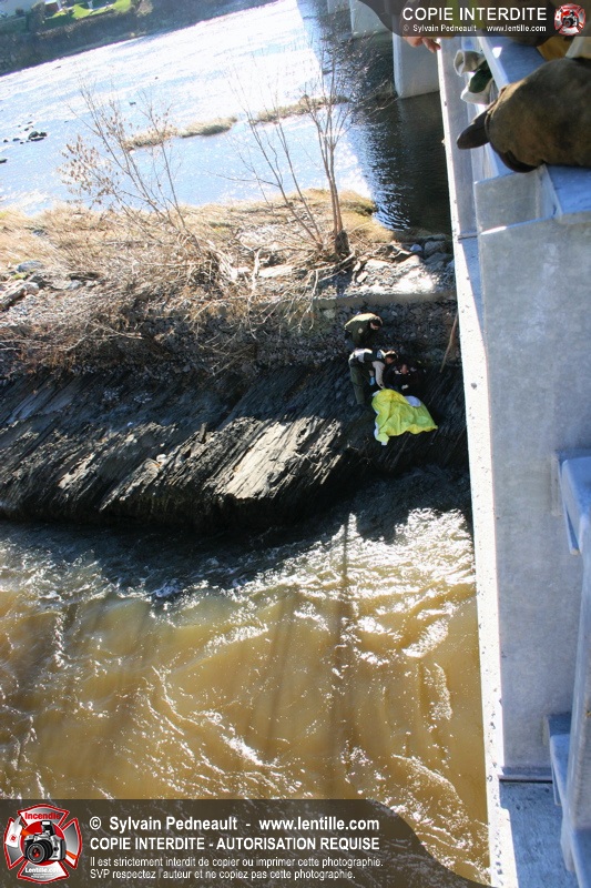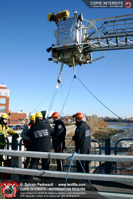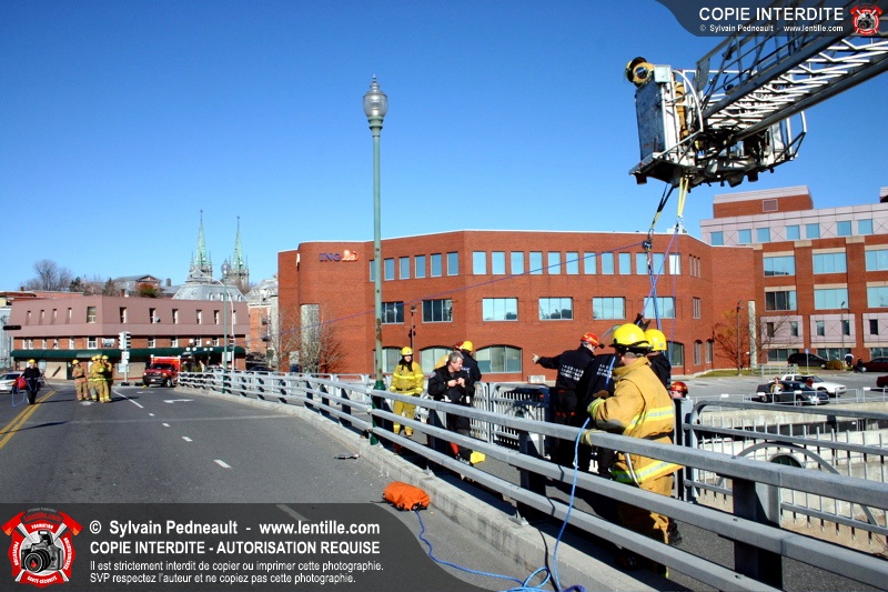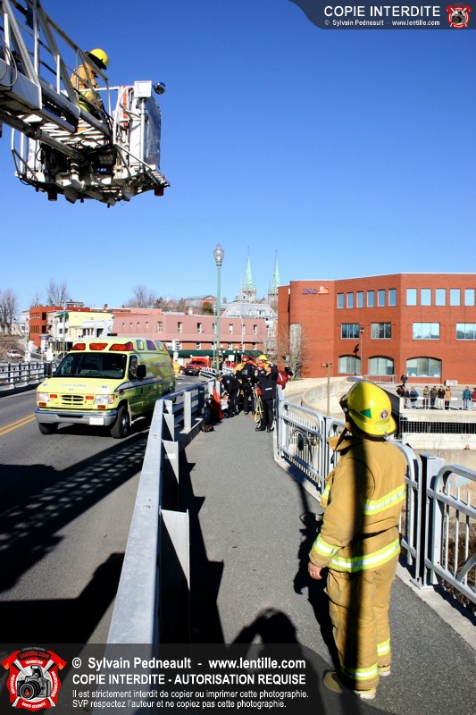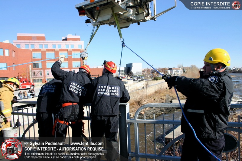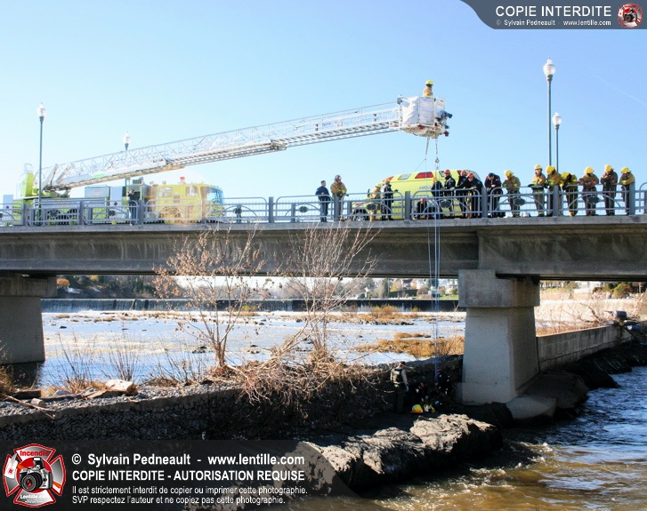 L'équipe de sauvetage en espace clos du Service de sécurité incendie de Saint-Hyacinthe intervient au pont Barsalou pour remonter le corps d'un homme gisant sur une surface rocheuse difficile d'accès sous le pont. L'intervention est suivie d'un debriefing et de la remise en état de l'équipement.
