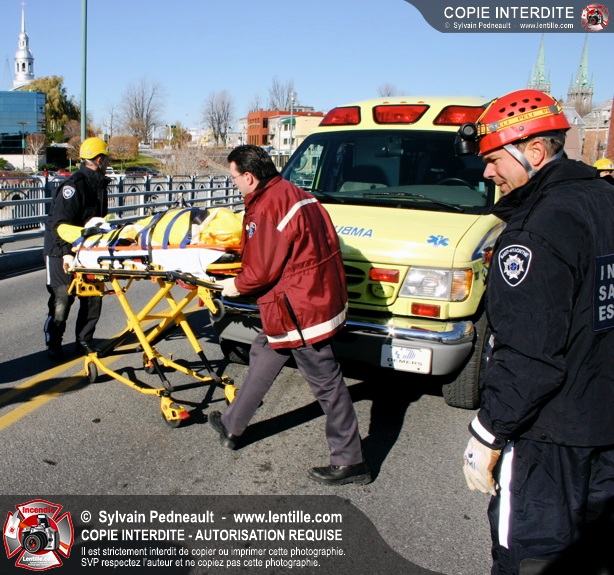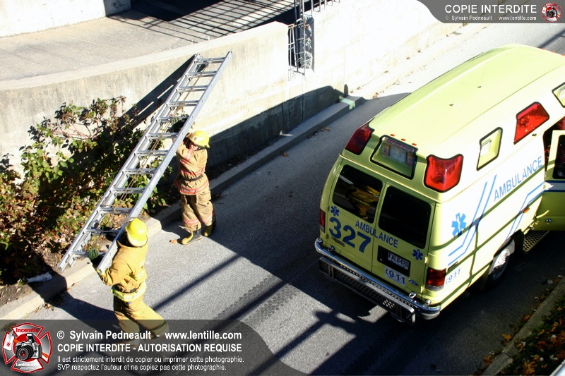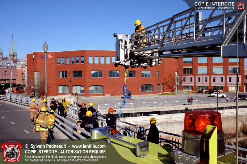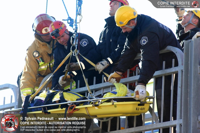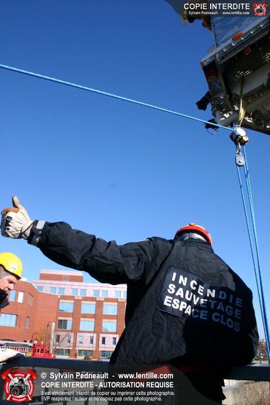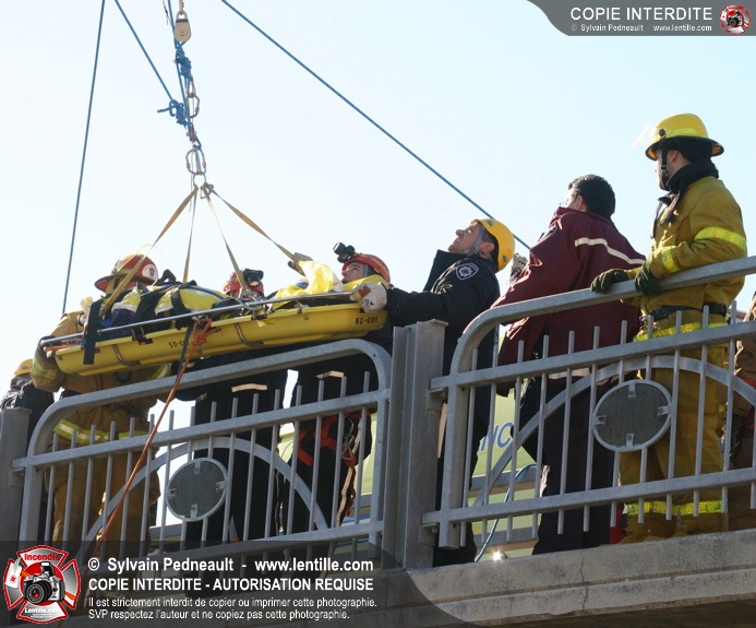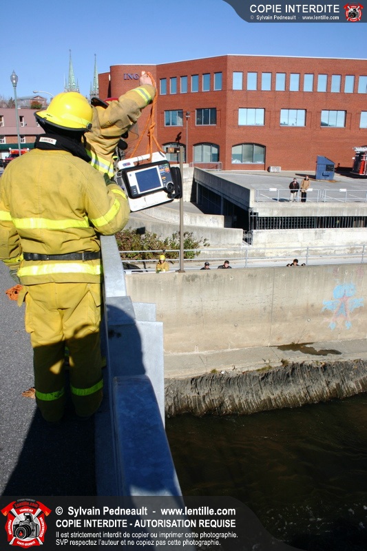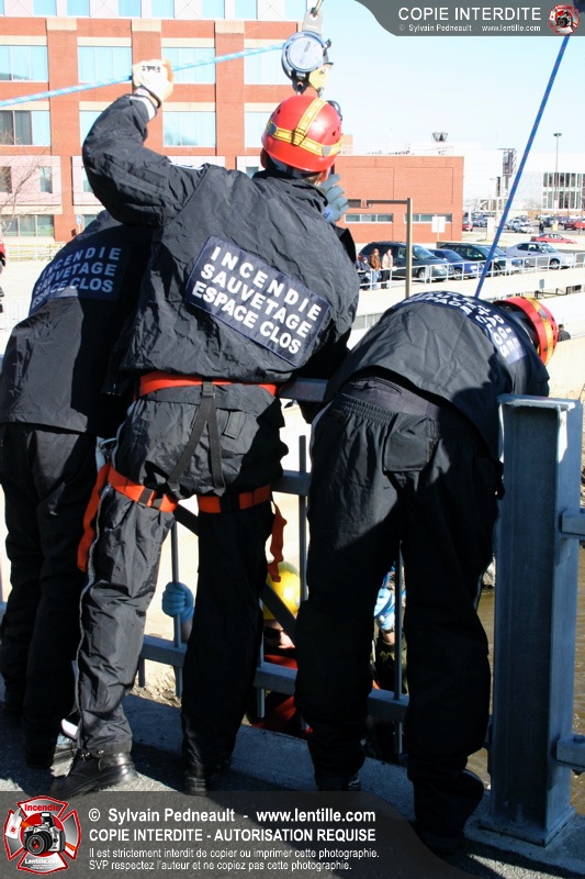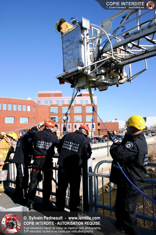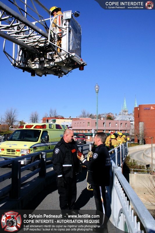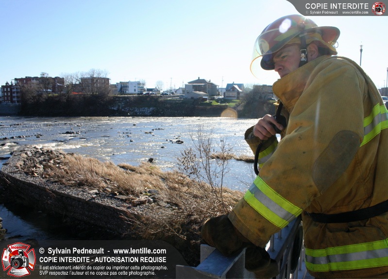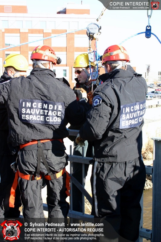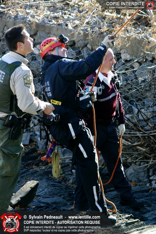 L'équipe de sauvetage en espace clos du Service de sécurité incendie de Saint-Hyacinthe intervient au pont Barsalou pour remonter le corps d'un homme gisant sur une surface rocheuse difficile d'accès sous le pont. L'intervention est suivie d'un debriefing et de la remise en état de l'équipement.