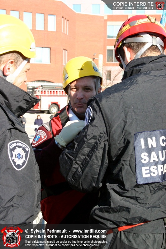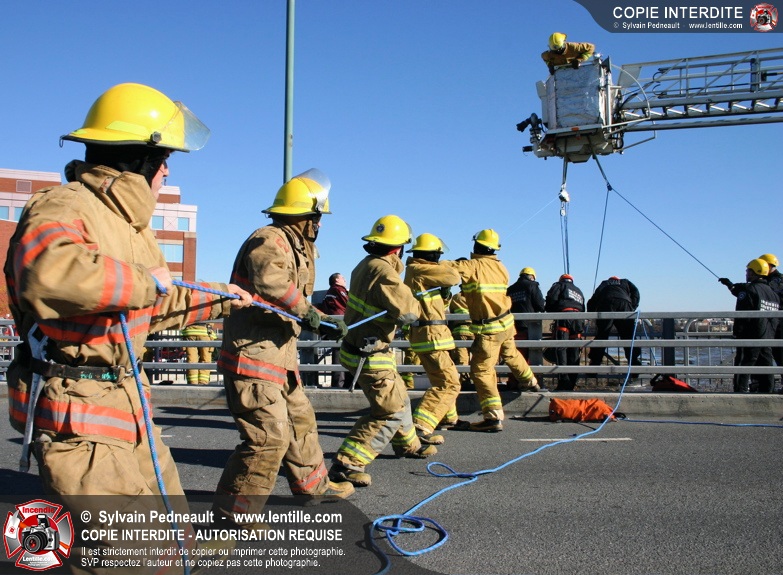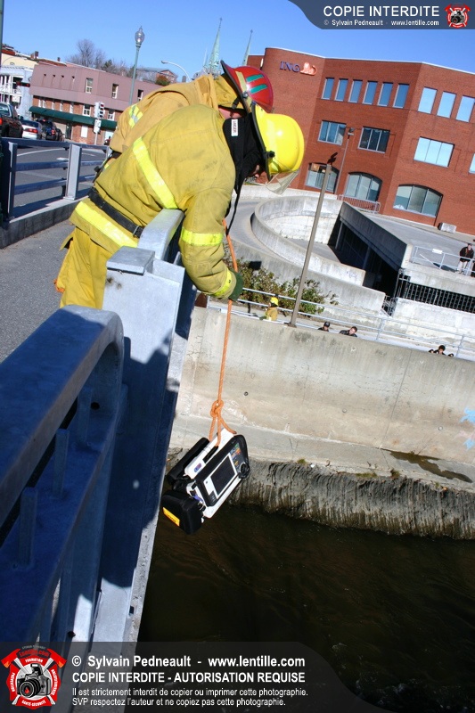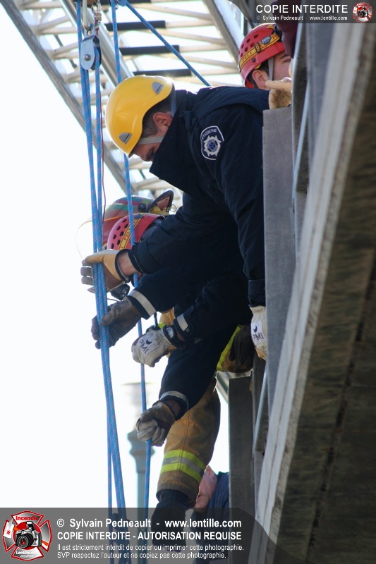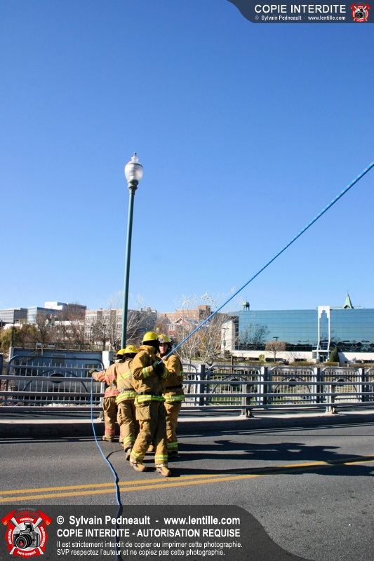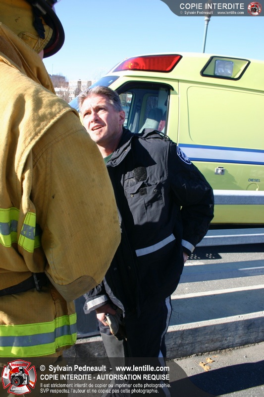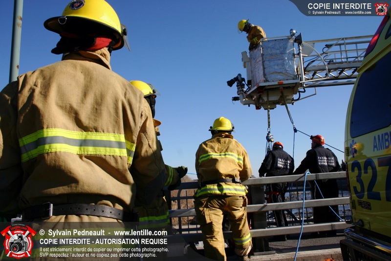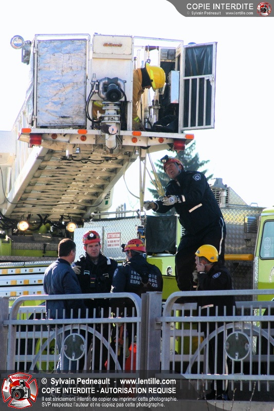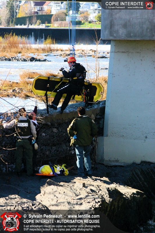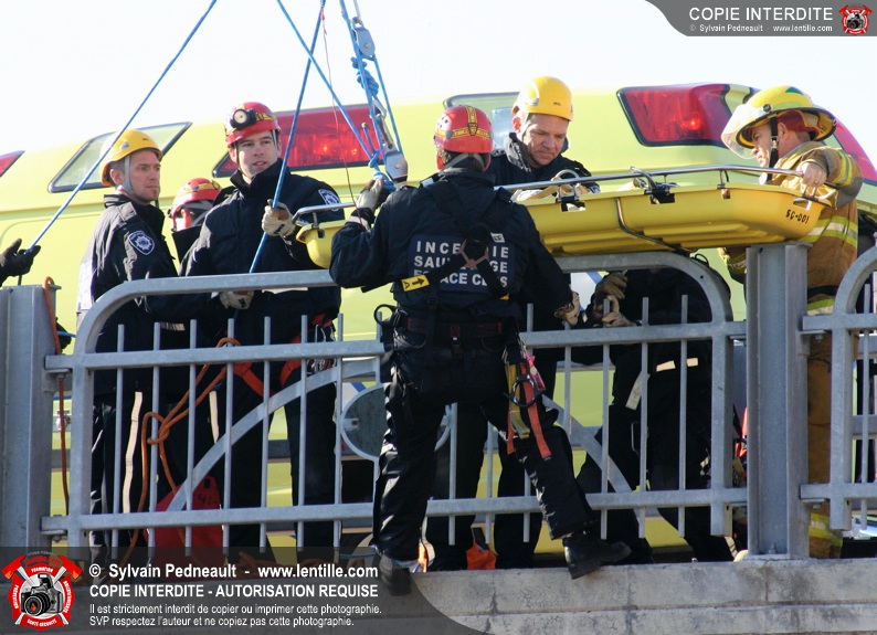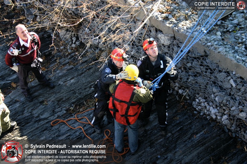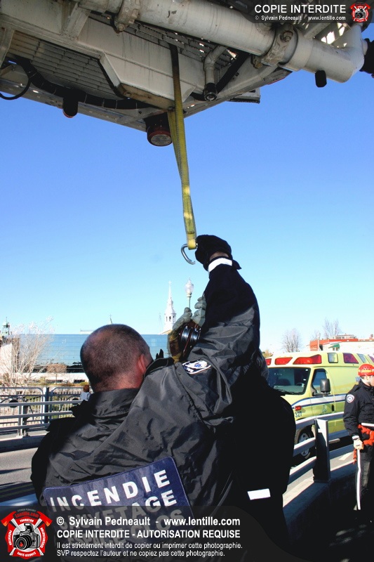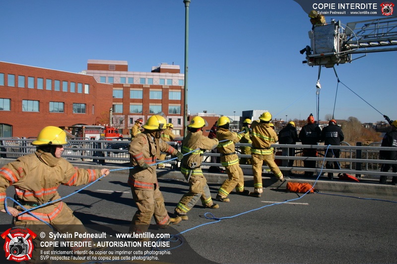L'équipe de sauvetage en espace clos du Service de sécurité incendie de Saint-Hyacinthe intervient au pont Barsalou pour remonter le corps d'un homme gisant sur une surface rocheuse difficile d'accès sous le pont. L'intervention est suivie d'un debriefing et de la remise en état de l'équipement.
