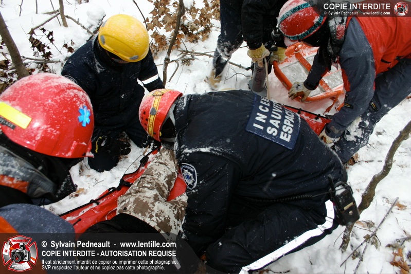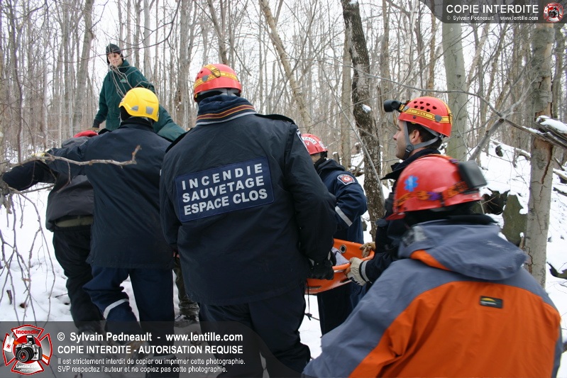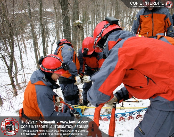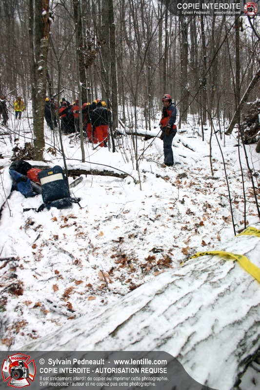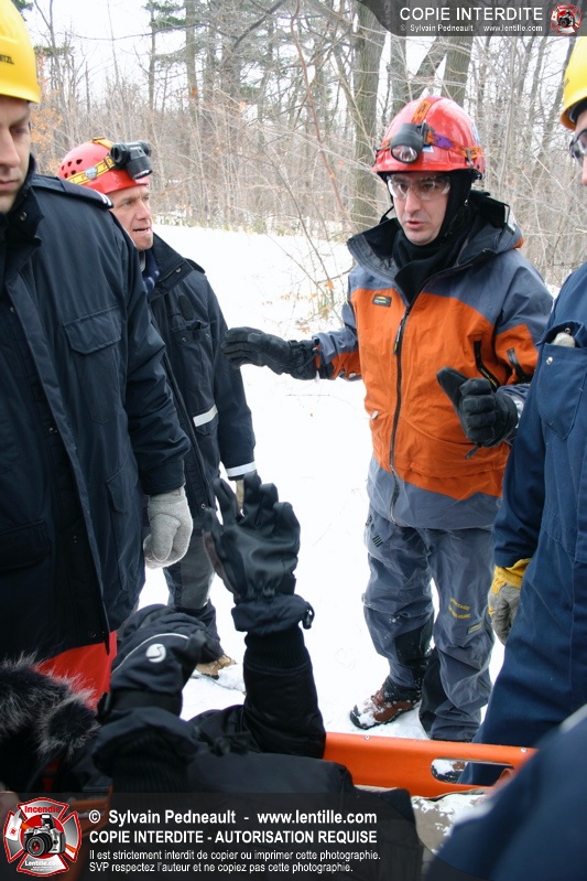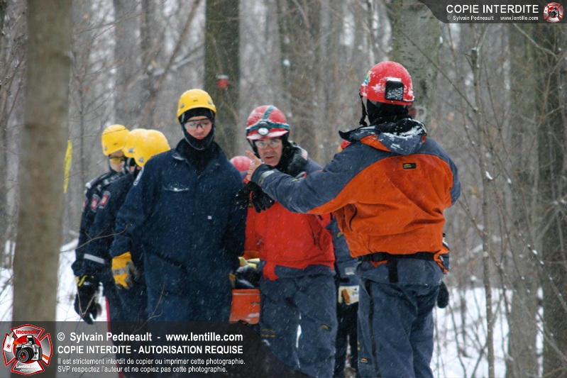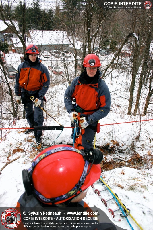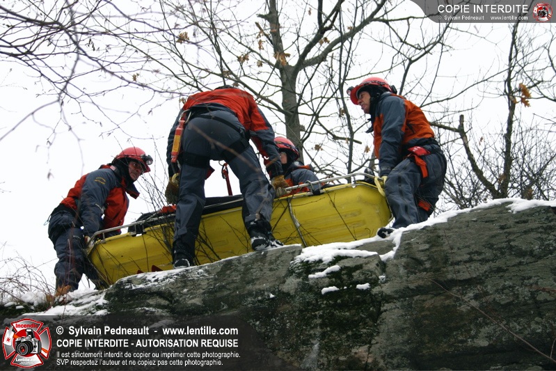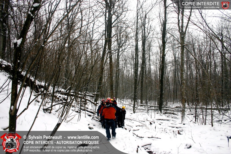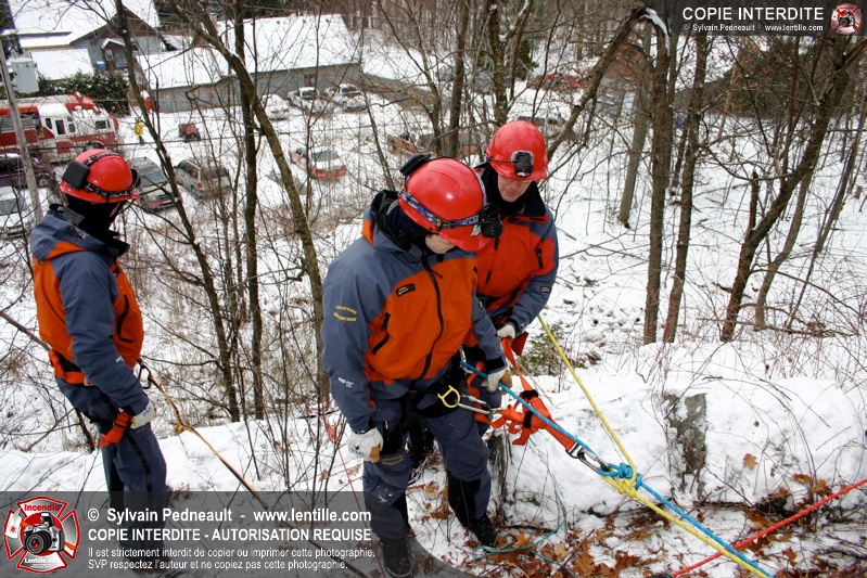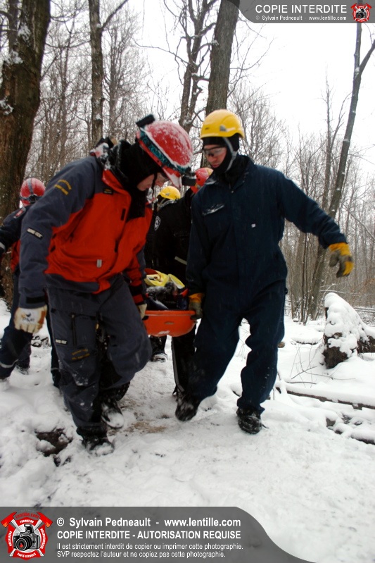 Les pompiers invités ont ensuite participé à une première pratique visant à transporter deux victimes en civière à travers la forêt, puis ont assisté à une démonstration d'intervention en paroi rocheuse verticale par l'équipe de St-Hilaire.