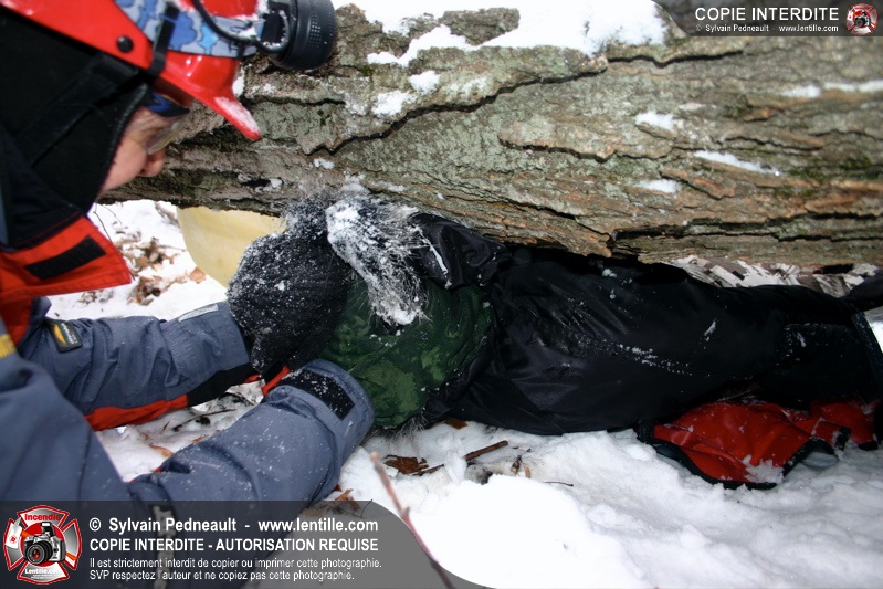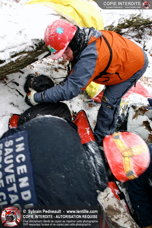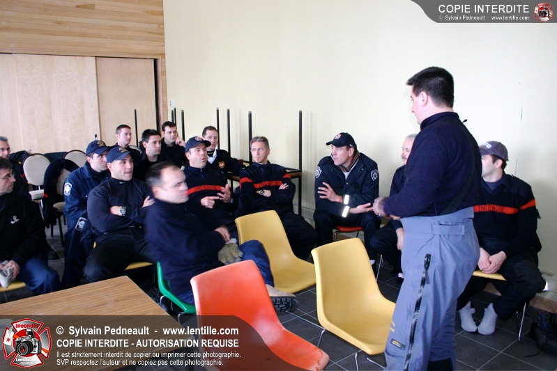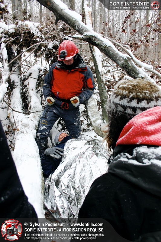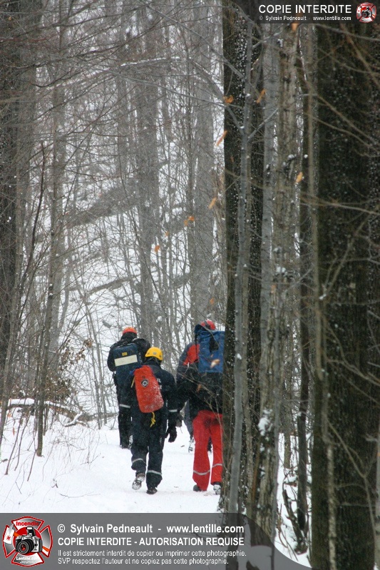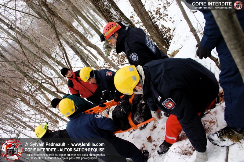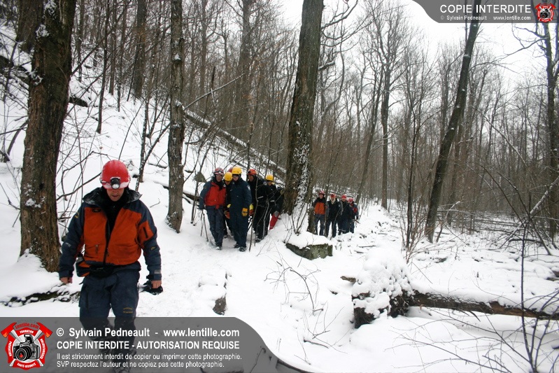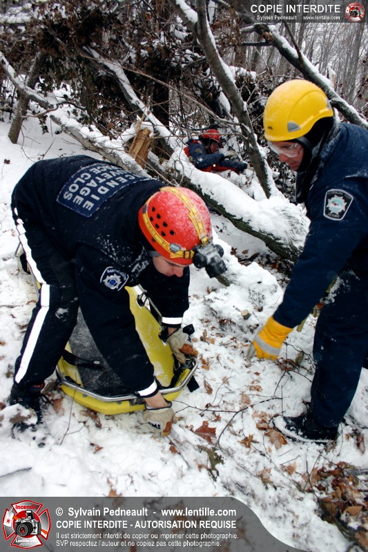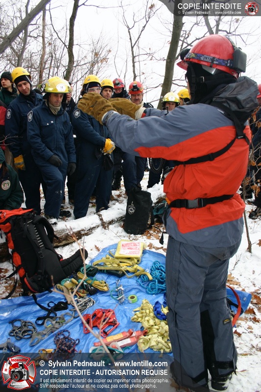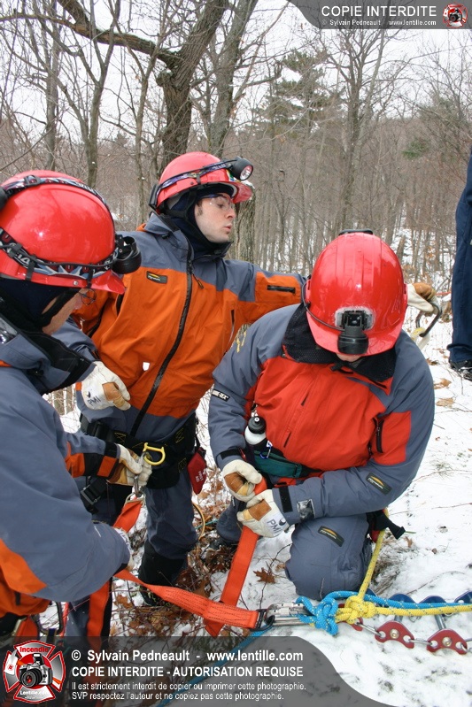 Les pompiers invités ont ensuite participé à une première pratique visant à transporter deux victimes en civière à travers la forêt, puis ont assisté à une démonstration d'intervention en paroi rocheuse verticale par l'équipe de St-Hilaire.