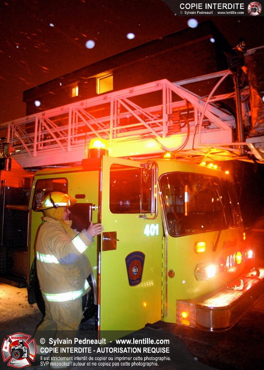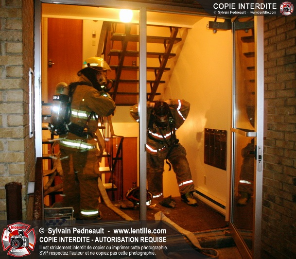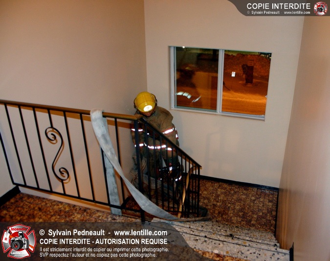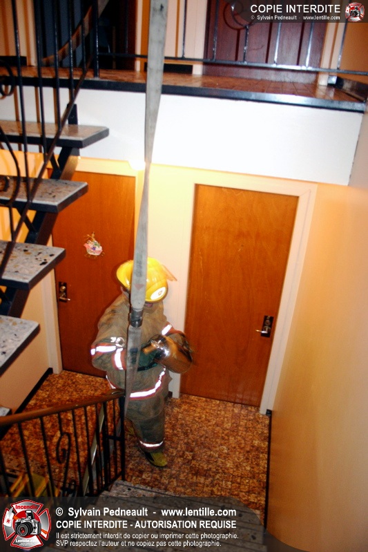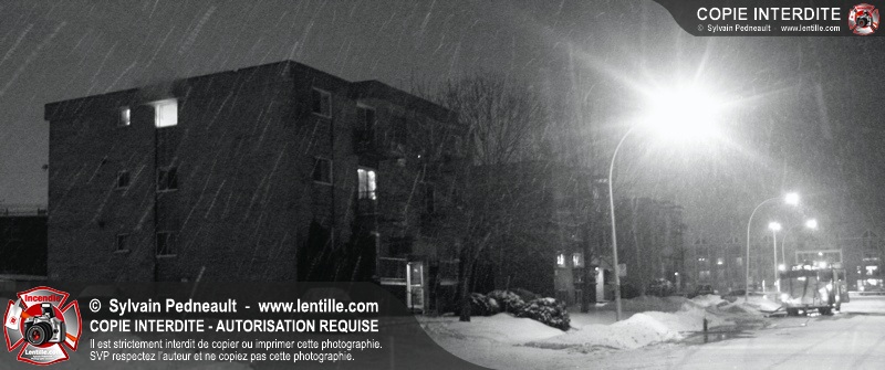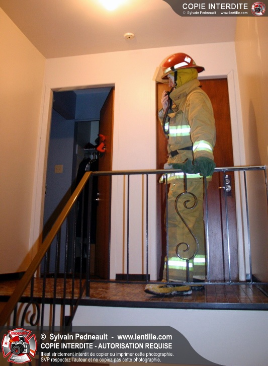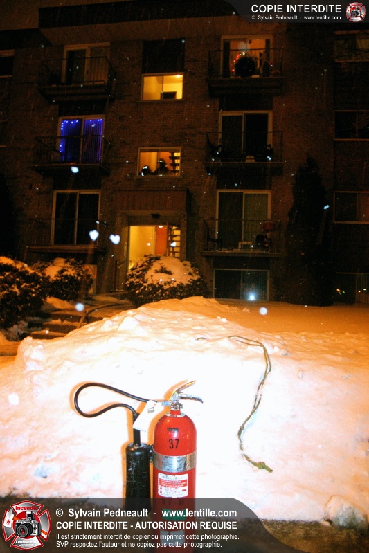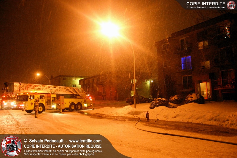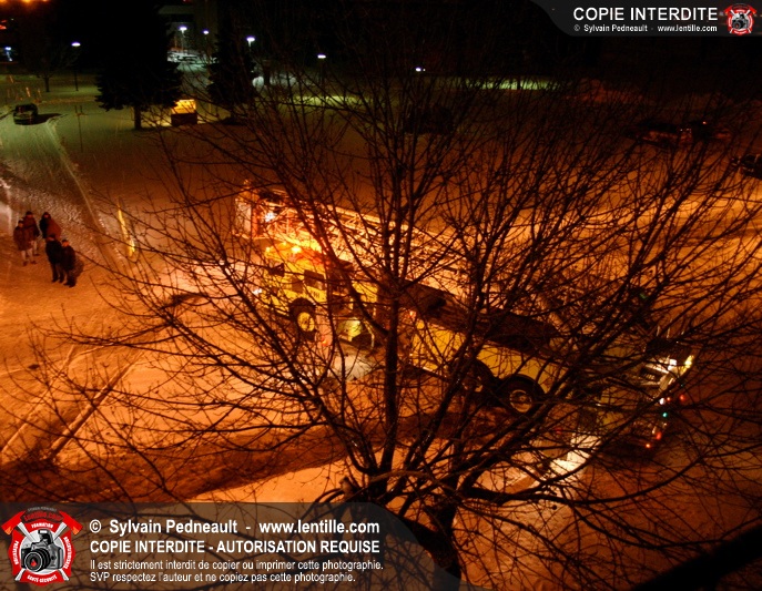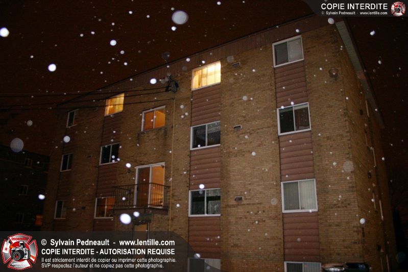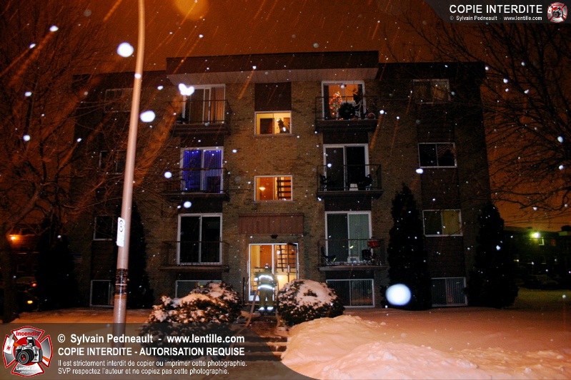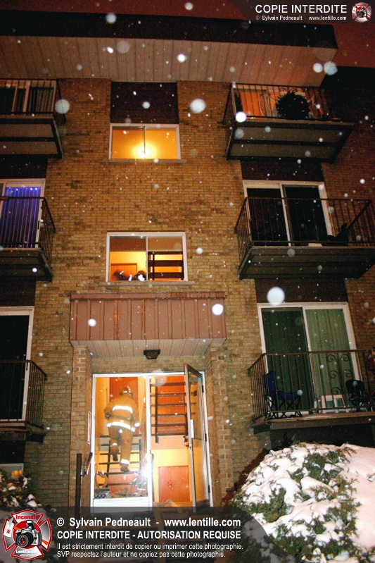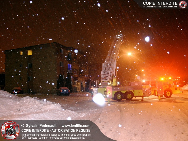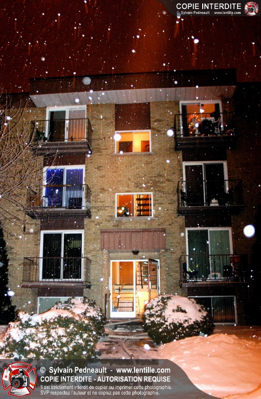 En soirée du premier jour de l'an, les pompiers sont appelés pour un incendie dans un édifice à logements. Arrivé sur les lieux, le PC confirme l'incendie et déclenche une première alarme. L'intervention très rapide des pompiers permet cependant de limiter les dégâts à la chambre où l'incendie a débuté. Un enquêteur de la Sûreté du Québec a été dépêché sur les lieux étant donné la présence d'une petite serre artisanale dans le garde-robe de la chambre incendiée.