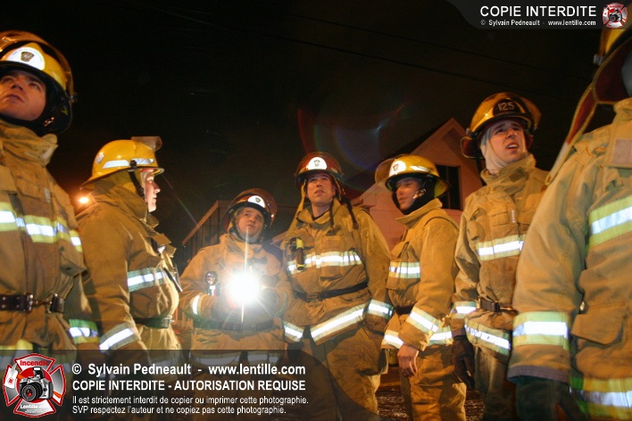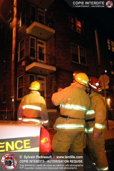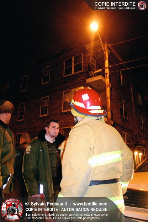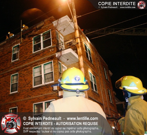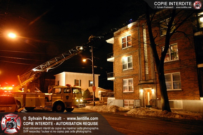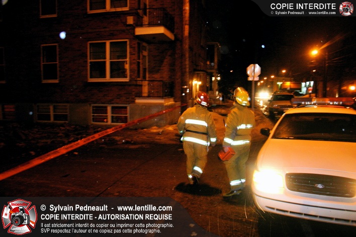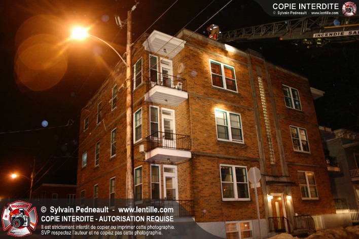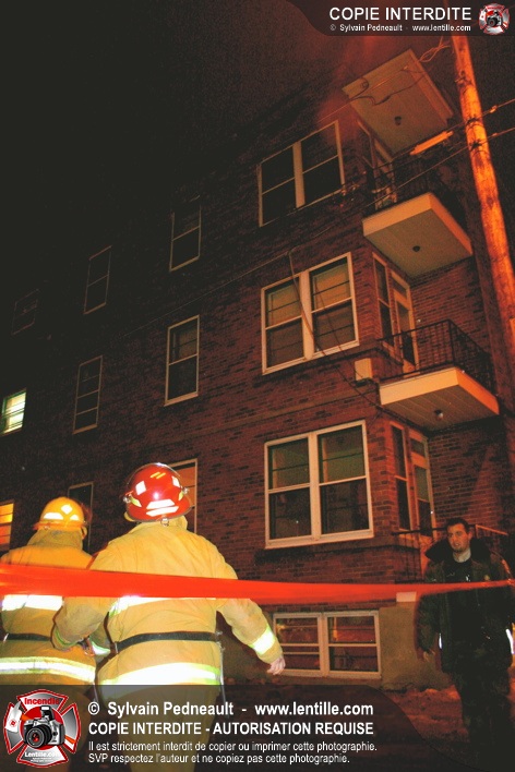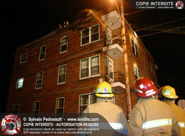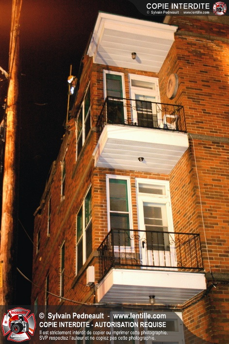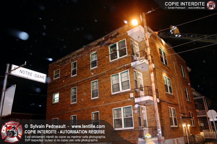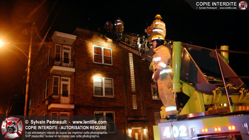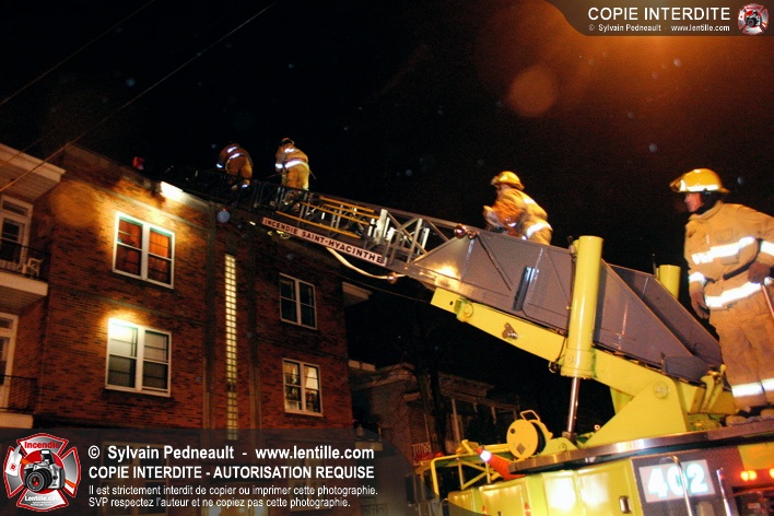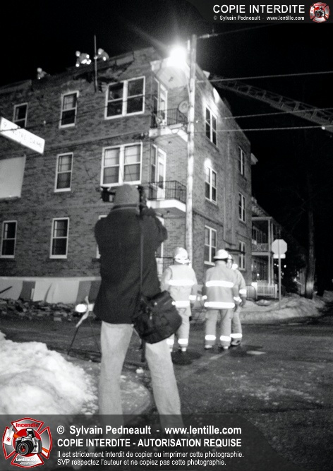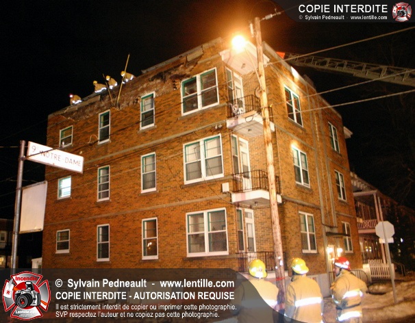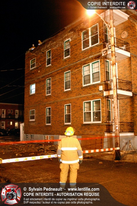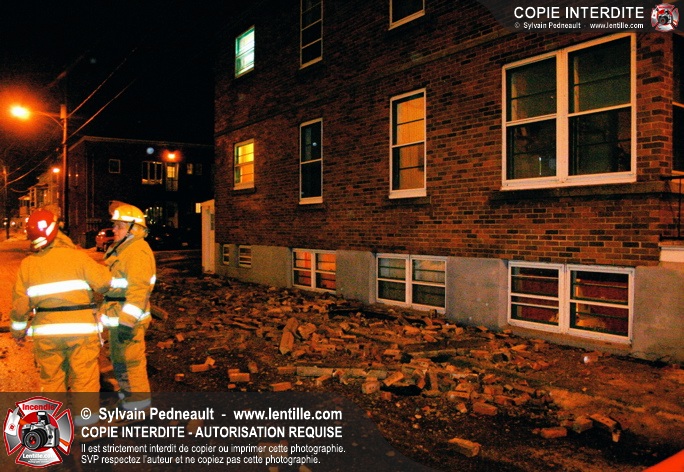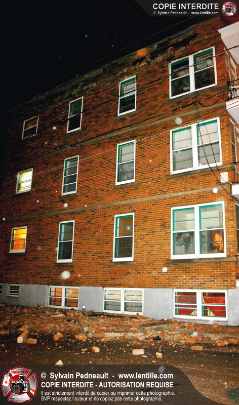 Pendant une soirée de forts vents à Saint-Hyacinthe, une partie du mur de briques au secteur 2 d'un grand immeuble s'effondre. Les pompiers positionnent le 402 pour accéder au toit et sécuriser la partie restante du mur.