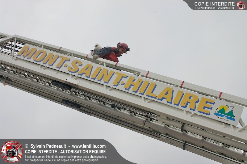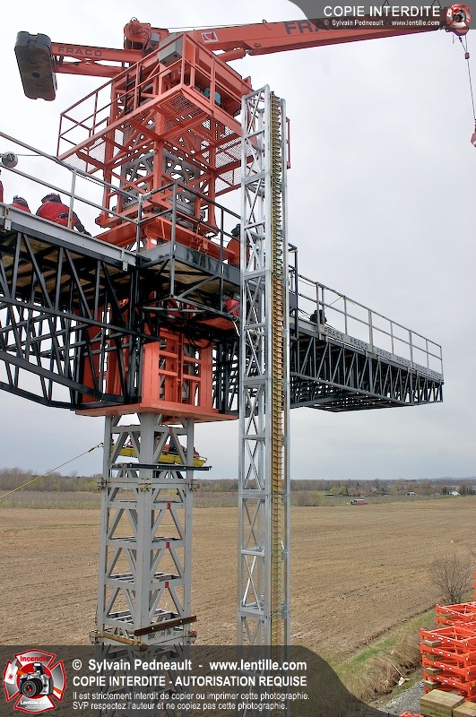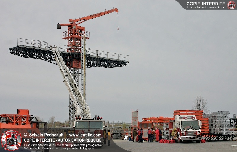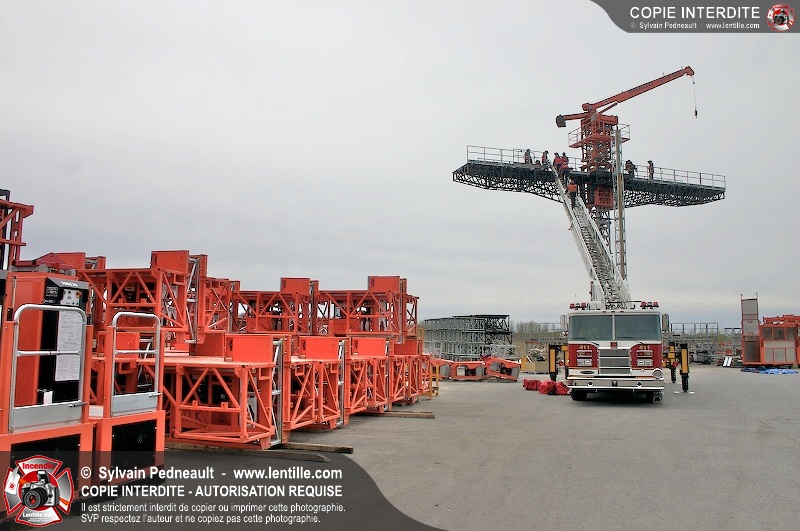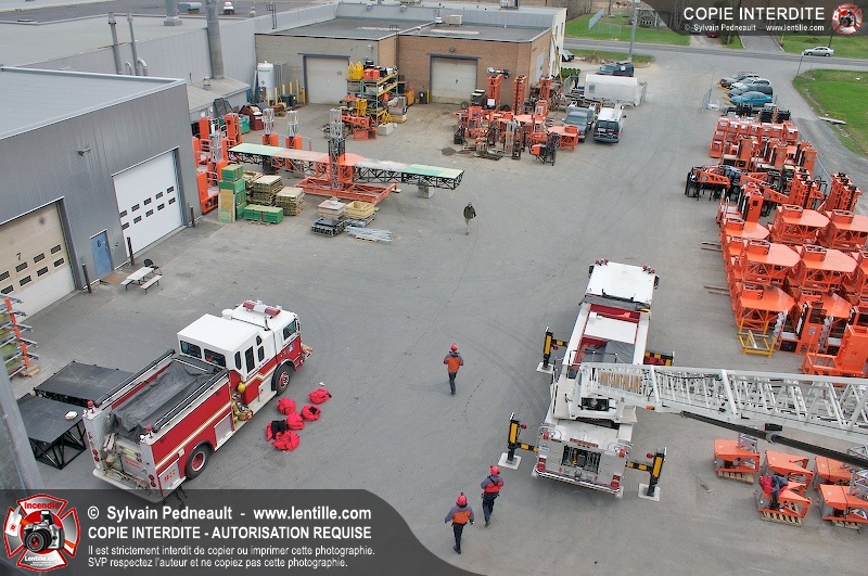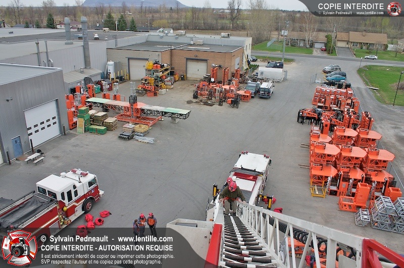 Le Service de sécurité incendie de Mont-Saint-Hilaire a organisé une très belle journée de pratique de sauvetage en hauteur sur une plate-forme de travail élévatrice géante de l'entreprise multi-nationale FRACO située à St-Mathias.