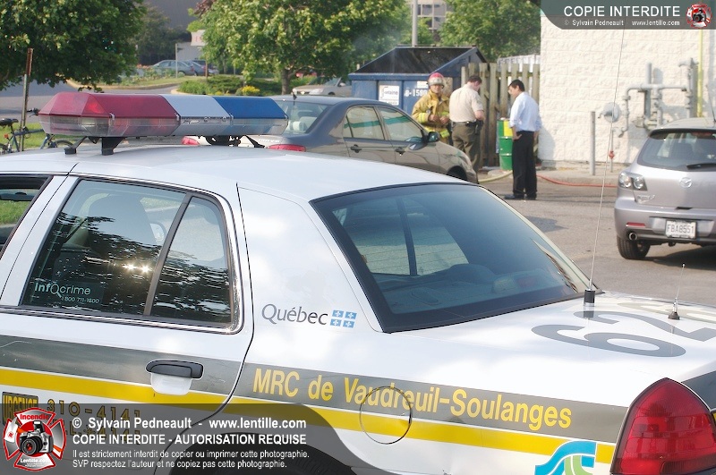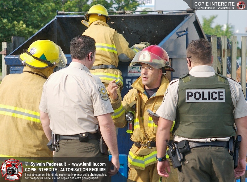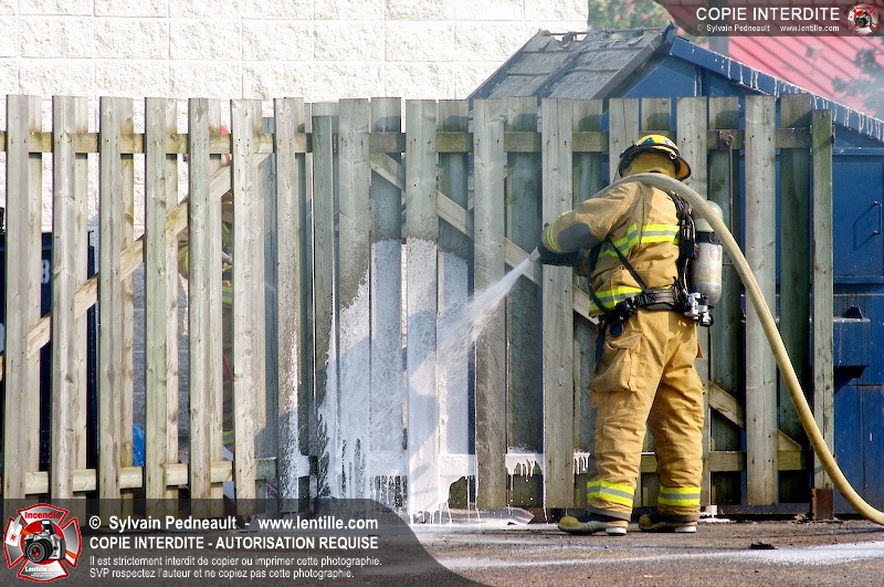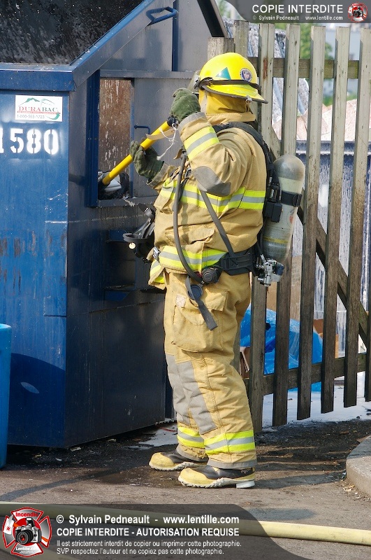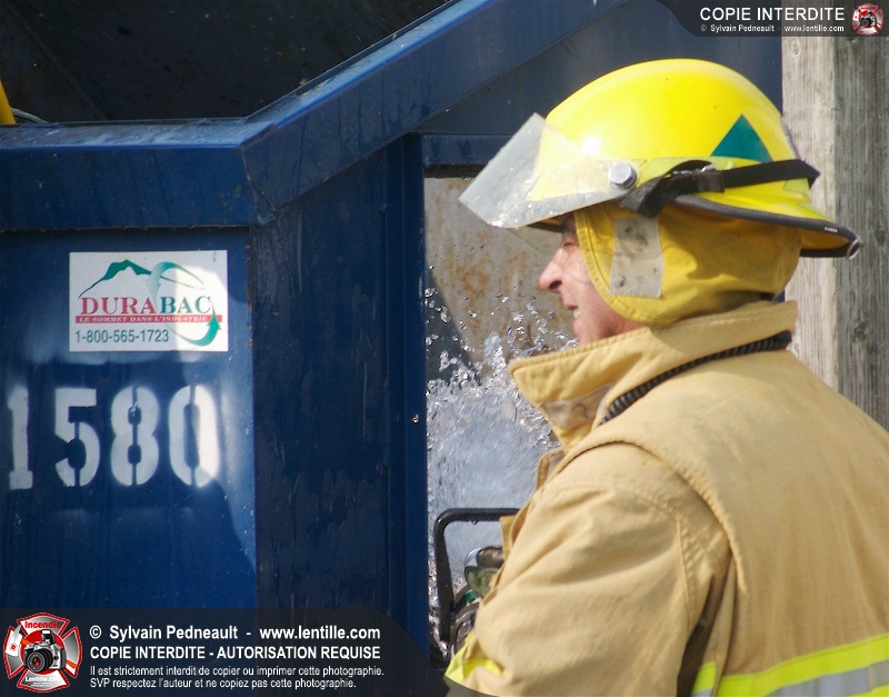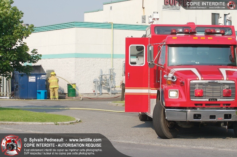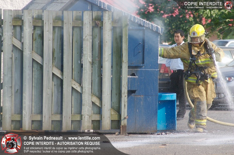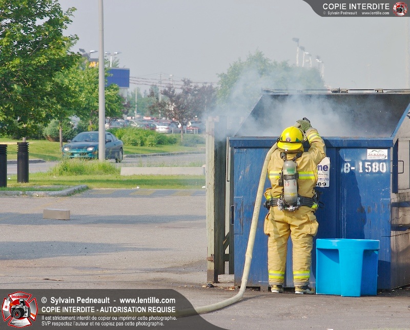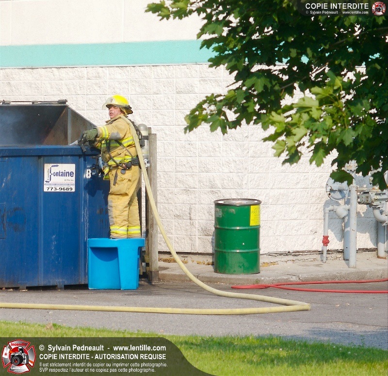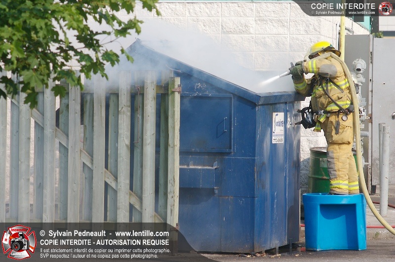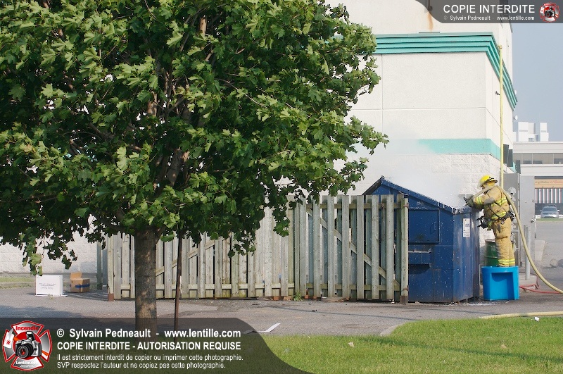 Feu de conteneur derrière un restaurant près de l'autoroute 20 à Saint-Hyacinthe. Selon les premières constatations, du verre jeté dans le conteneur plus tôt en journée auraît pu causer l'incendie.