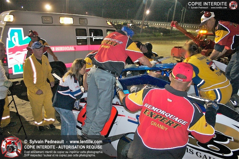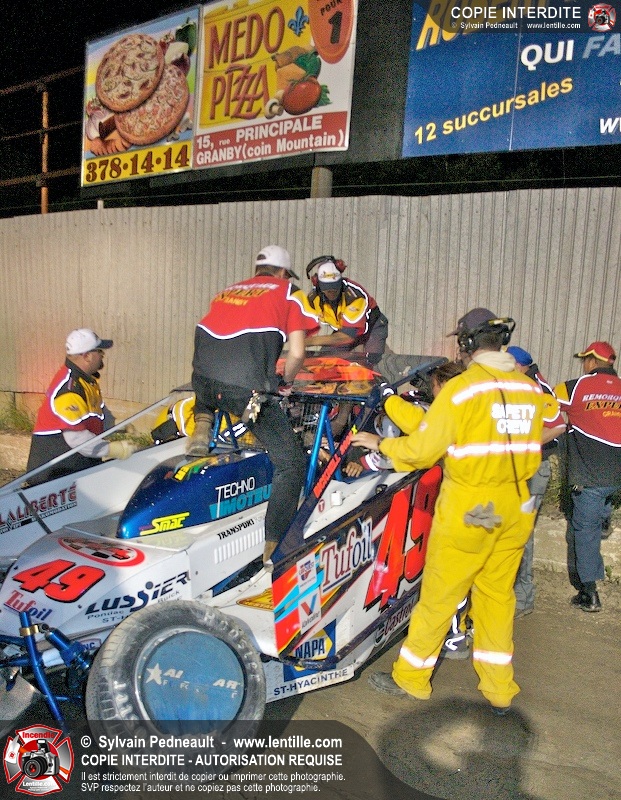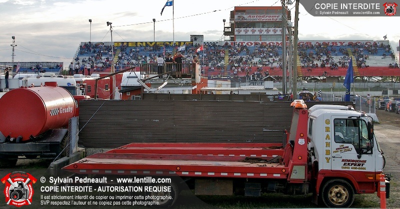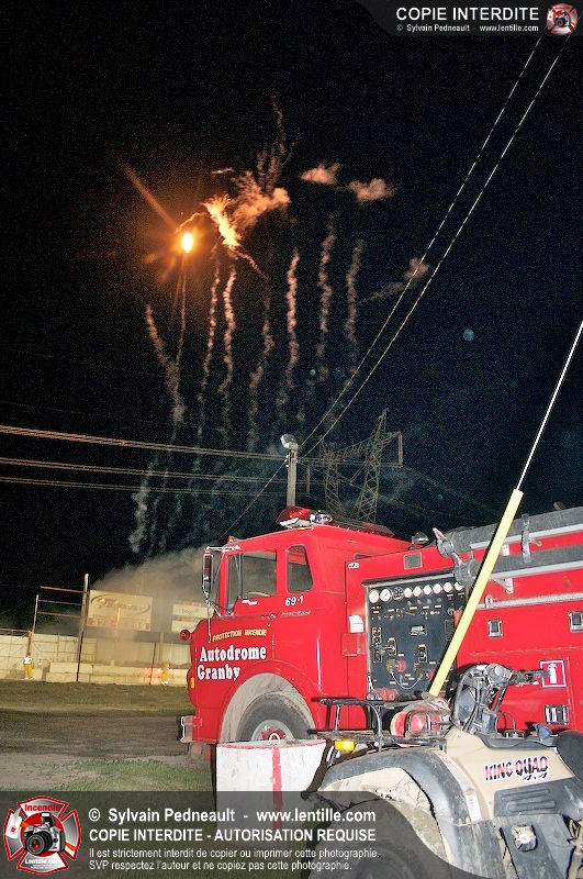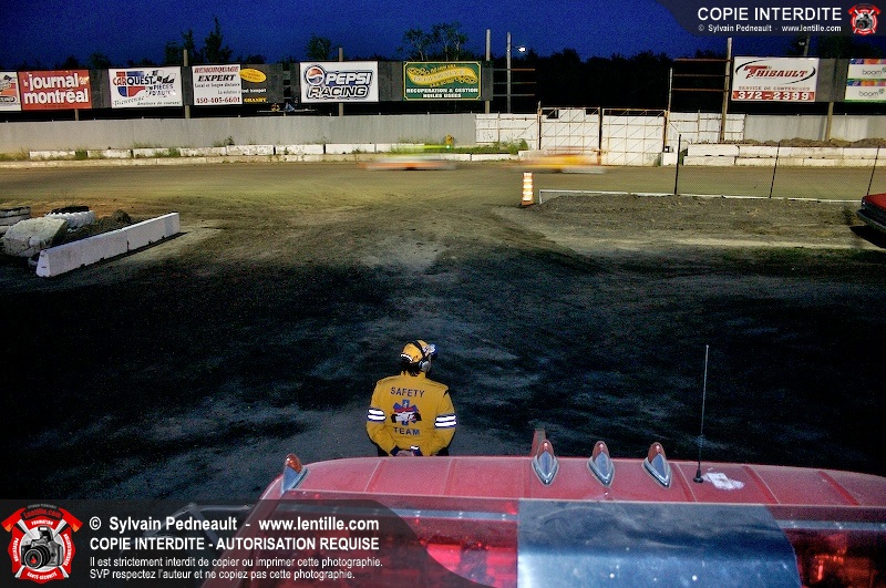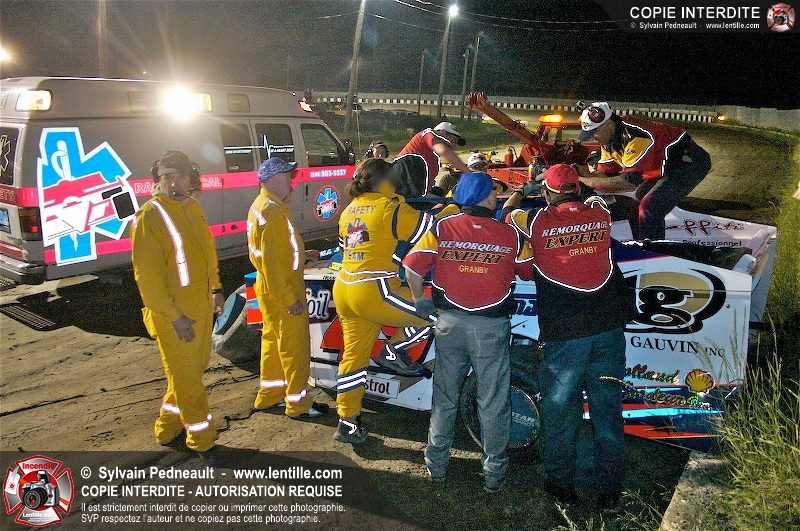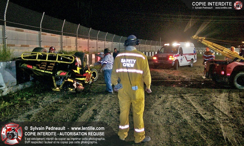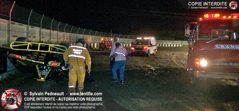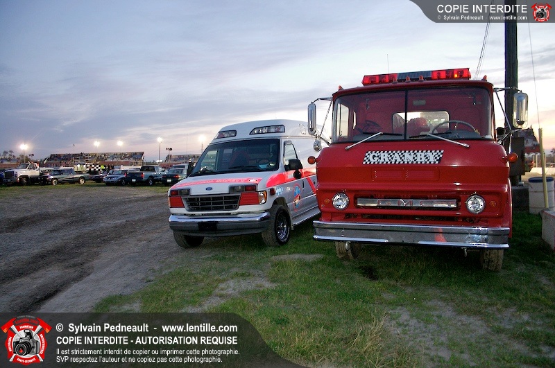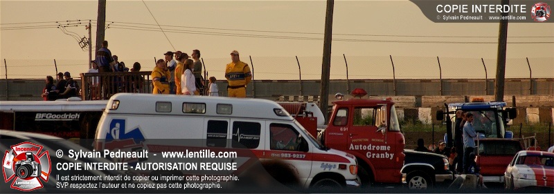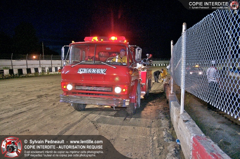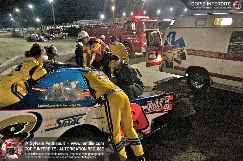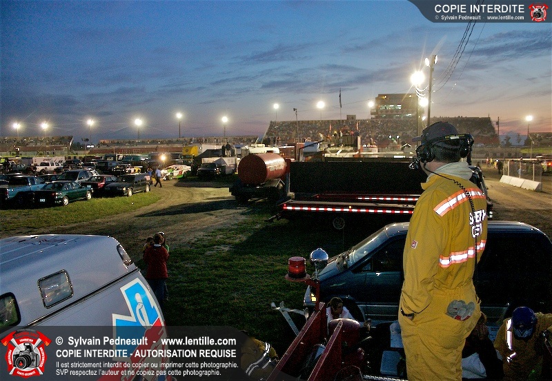 L'équipe de protection incendie et l'équipe médicale de courses interviennent lors des courses automobiles à l'autodrome de Granby. Une soirée remplie d'action, autant pour les spectateurs, les pilotes, les remorqueurs, ET les intervenants d'urgence!