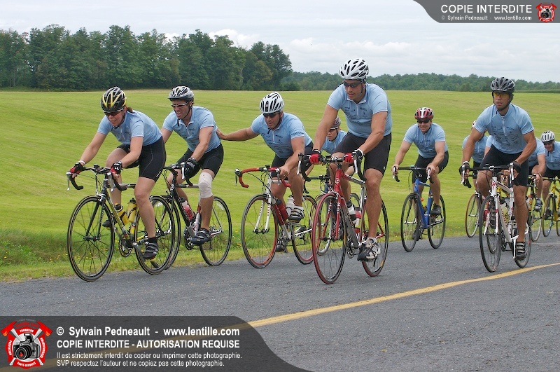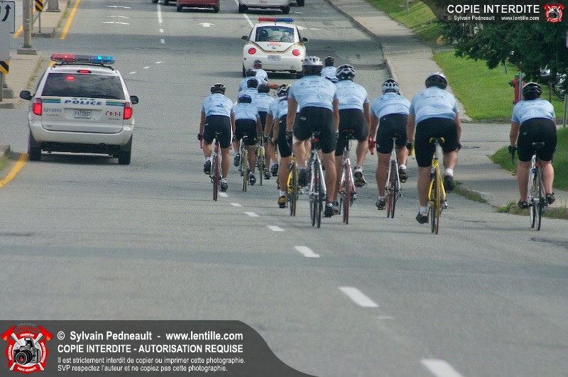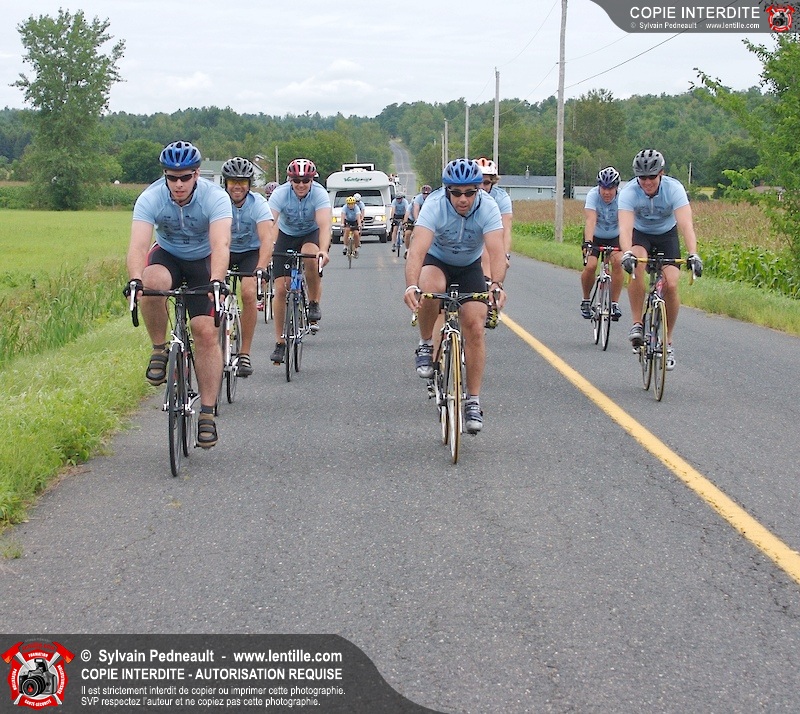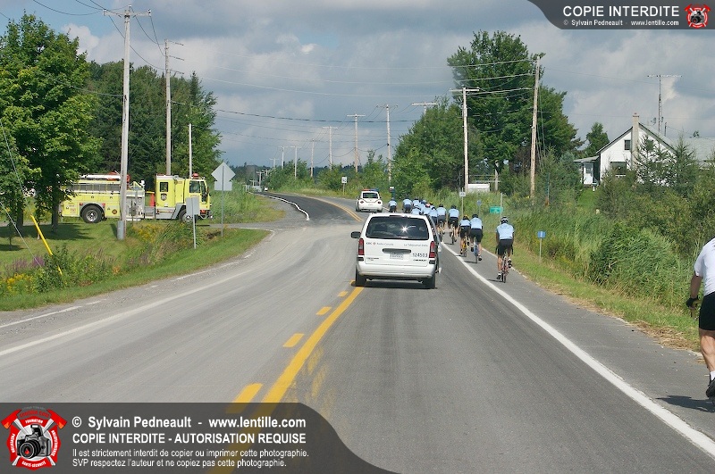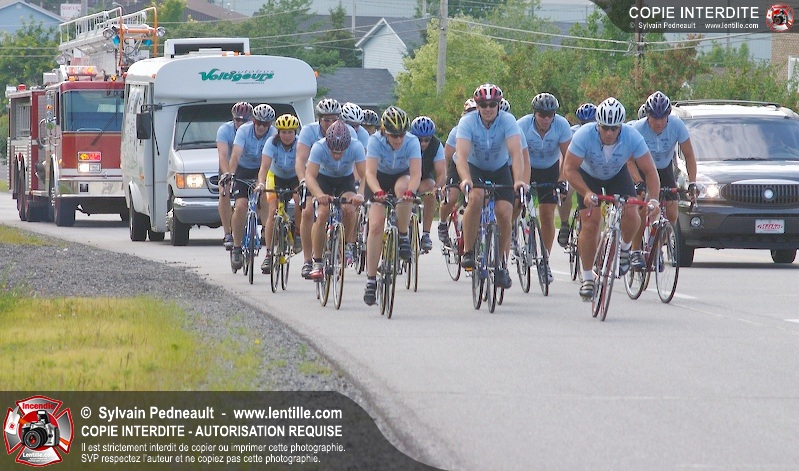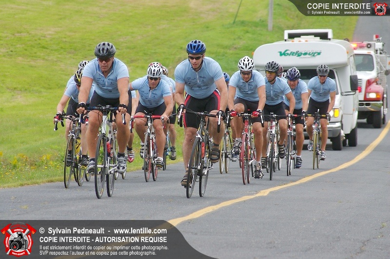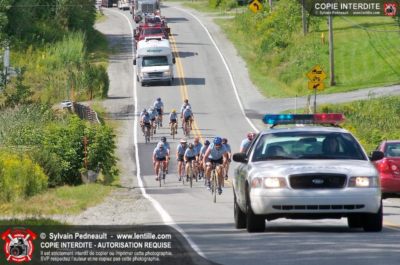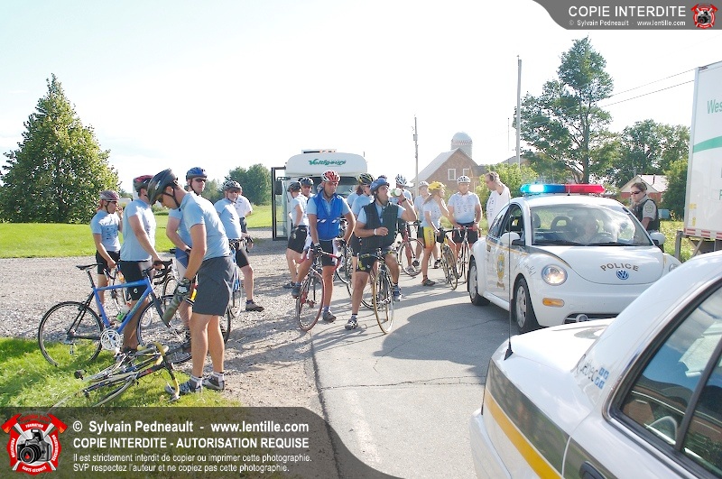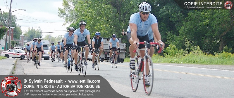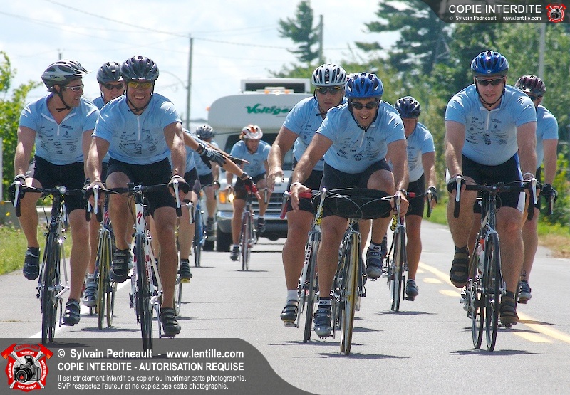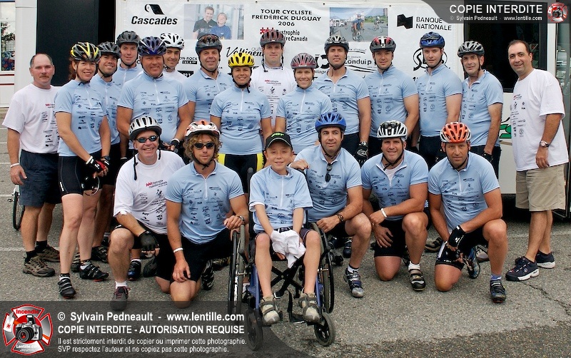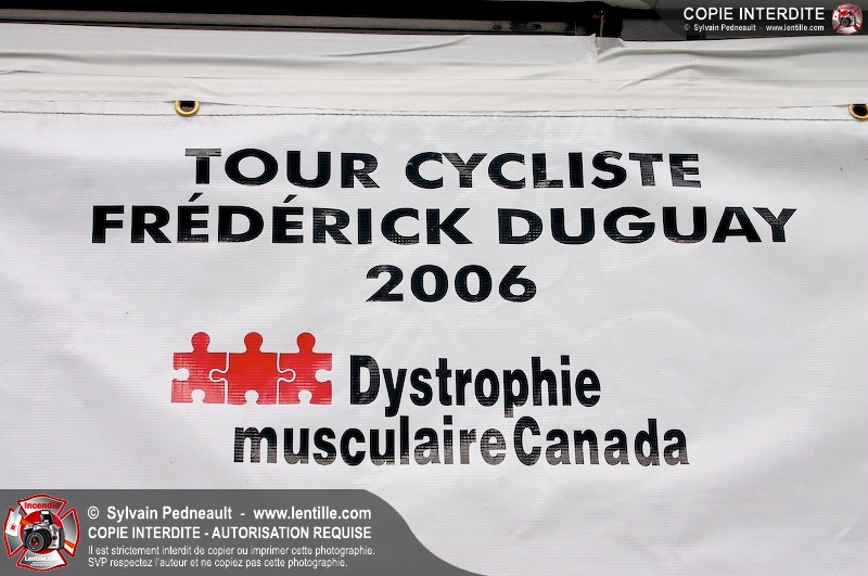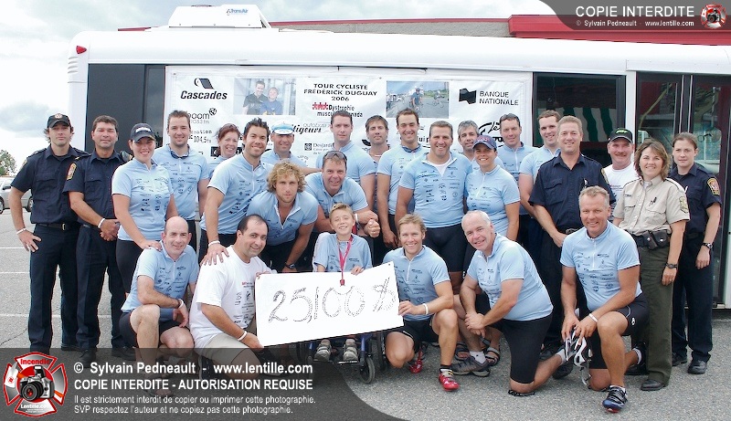 Dix-neuf policiers et pompiers ont roulé sur plus de 260 kilomčtres en deux jours ŕ l'occasion du Tour cycliste Frédéric Duguay 2006 de Dystrophie musculaire Canada. L'activité qui visait cette année ŕ amasser 15 000$ a plutôt récolté plus de 25 000$ pour la dystrophie musculaire! Photographie de l'événement: une commandite de Lentille.com!