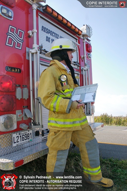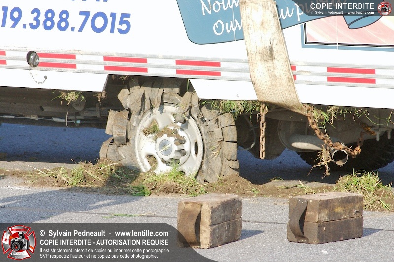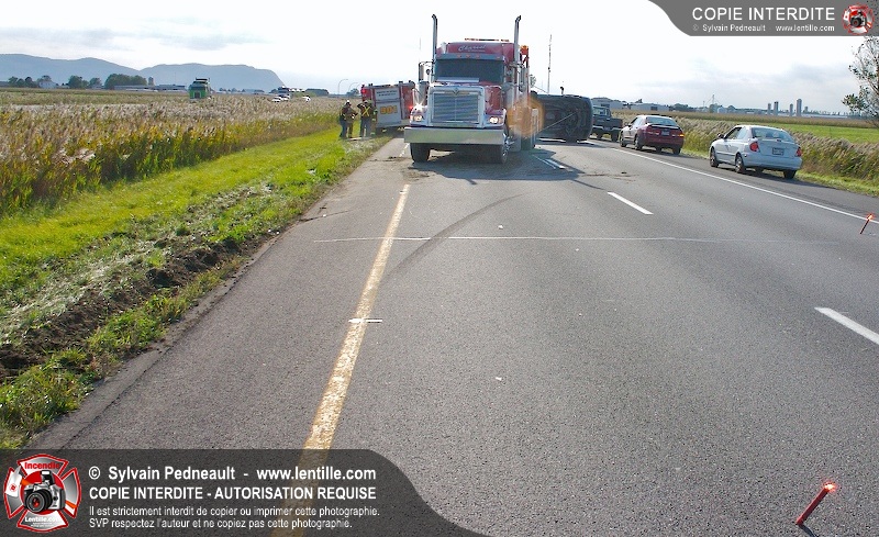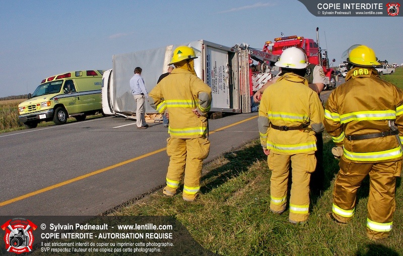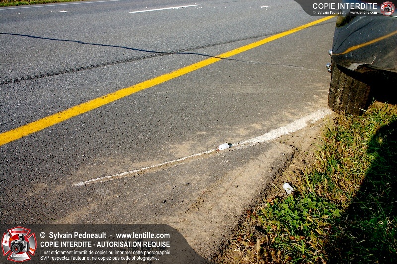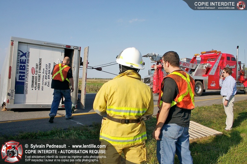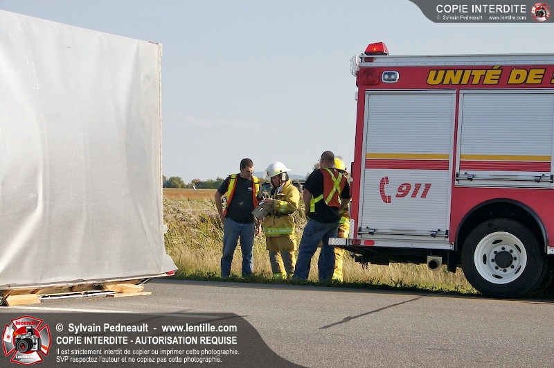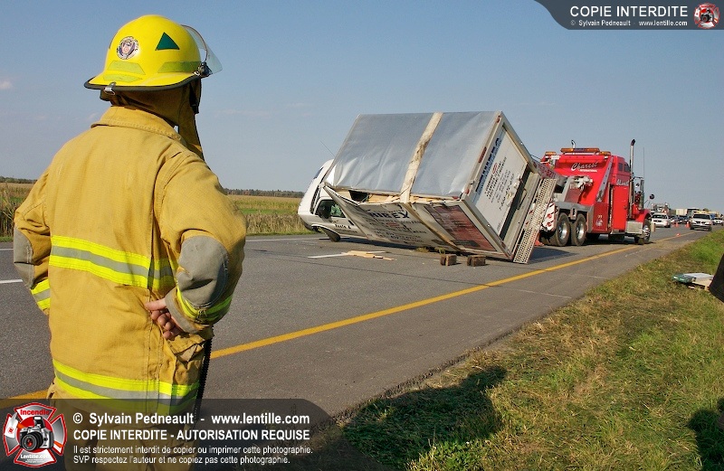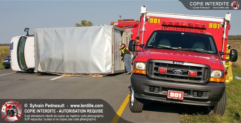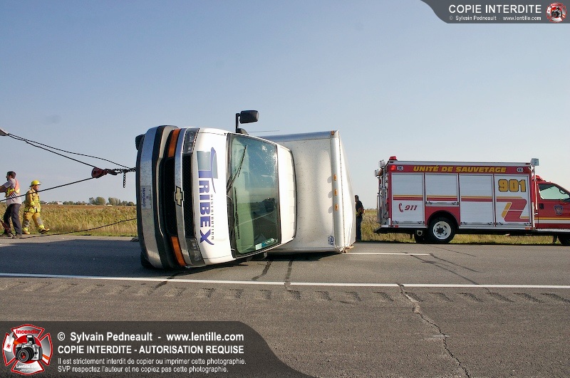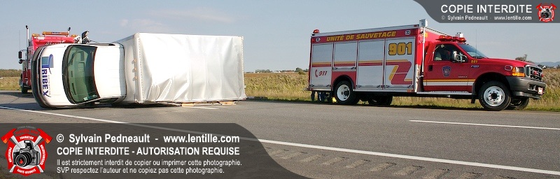 Un camion cube a subit une crevaison sur l'autoroute 20 au kilomètre 124, provoquant une perte de contrôle et projetant le véhicule sur le côté. Puisque l'appel initial faisait état d'une personne incarcérée, le 901 s'est rendu sur les lieux. L'intervention était cependant 10-03 à son arrivée.