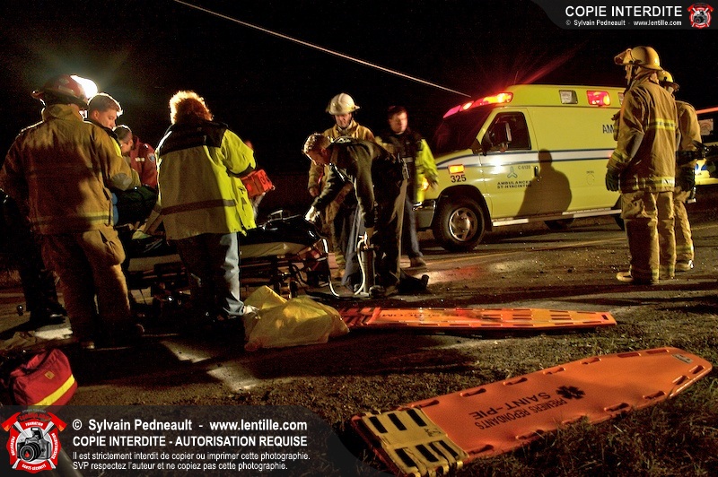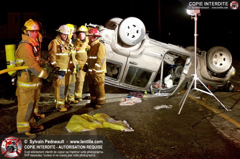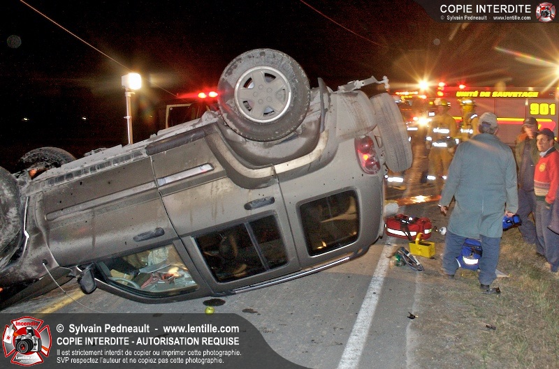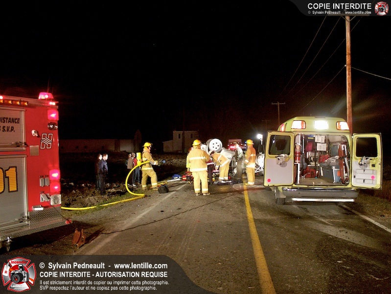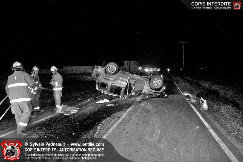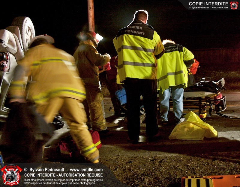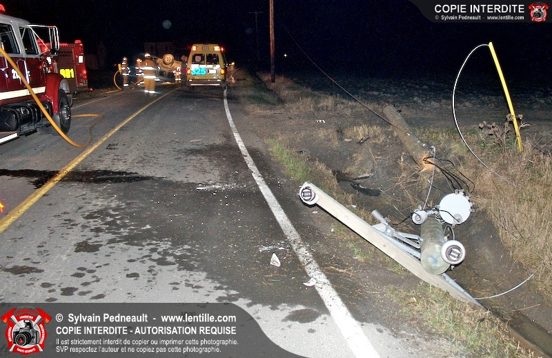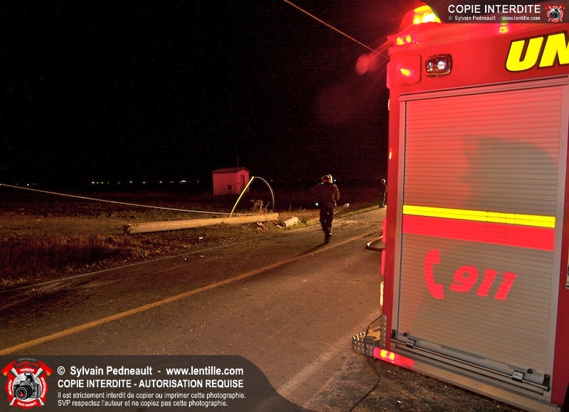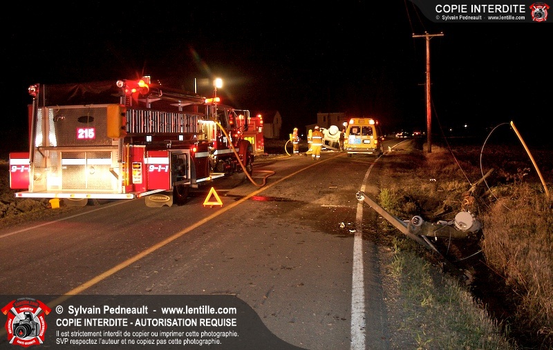 Les pompiers et les premiers répondants de St-Pie, l'unité de désincarcération de Saint-Hyacinthe, les paramédics de Saint-Hyacinthe et les policiers de la Sûreté du Québec ont convergé vers le rang St-Ours à St-Pie où un véhicule a frappé un poteau électrique et s'est retrouvé à l'envers sur la chaussée.