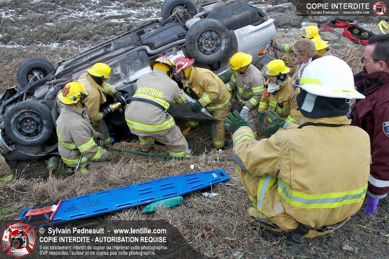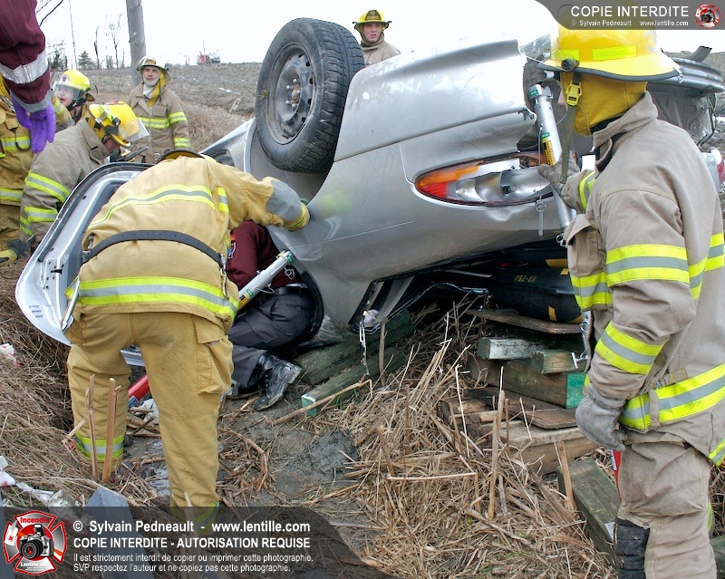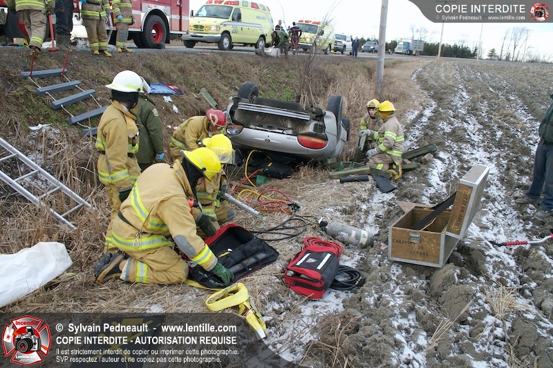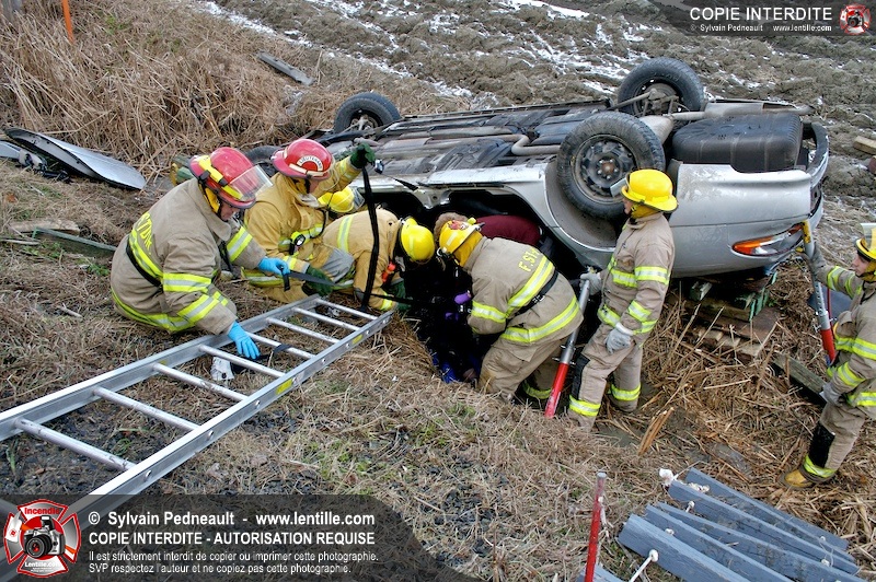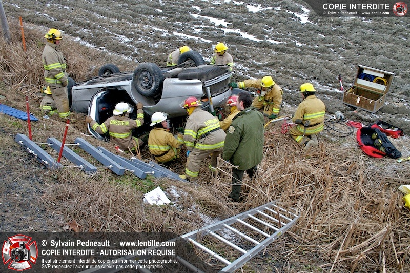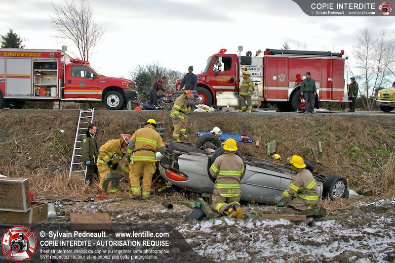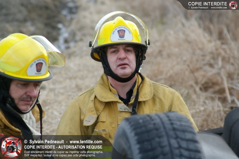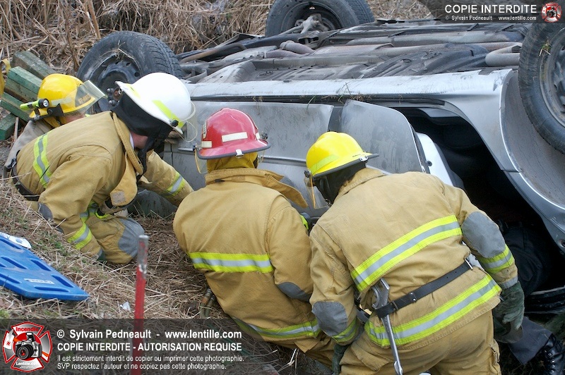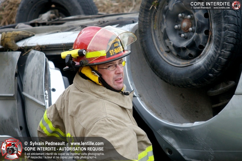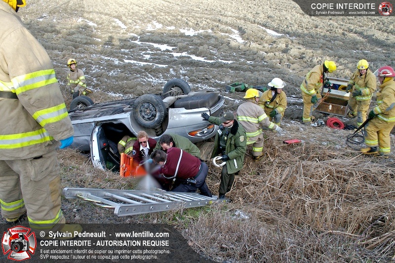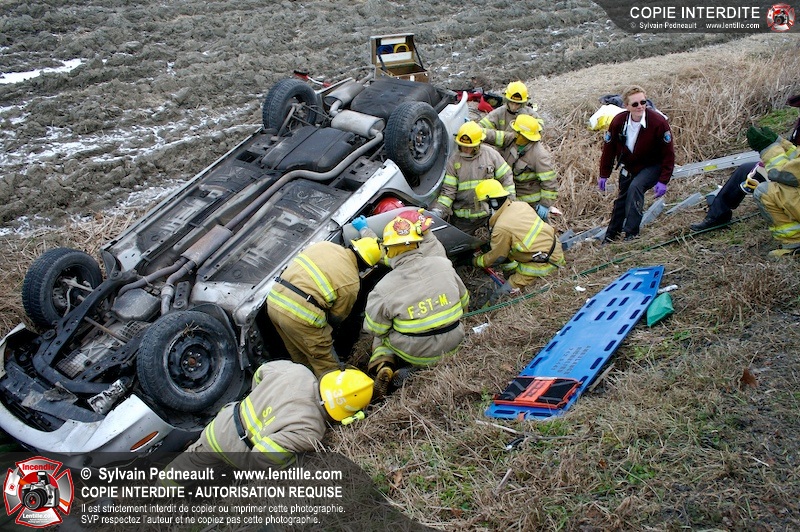 Une complexe opération de désincarcération a eu lieu sur la route 239 près du Rang Ste-Julie à St-Marcel. Puisque le véhicule était renversé sur le toit et qu'il présentait des risques de glissement multi-directionnel pendant les manoeuvres, les pompiers spécialisés du SSI de Saint-Hyacinthe, assistés des pompiers de St-Marcel, ont réalisé la délicate désincarcération de 35 minutes en combinant tout un évantail de techniques et d'équipements.