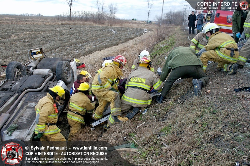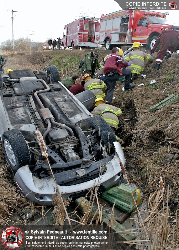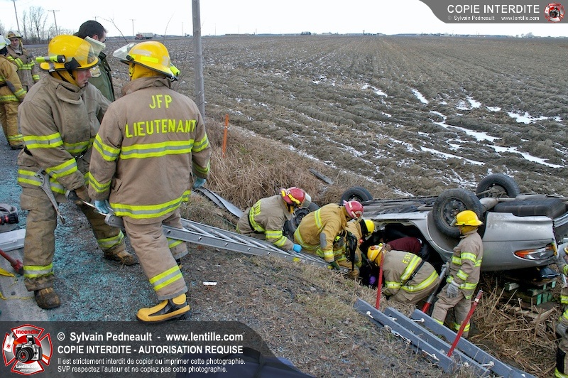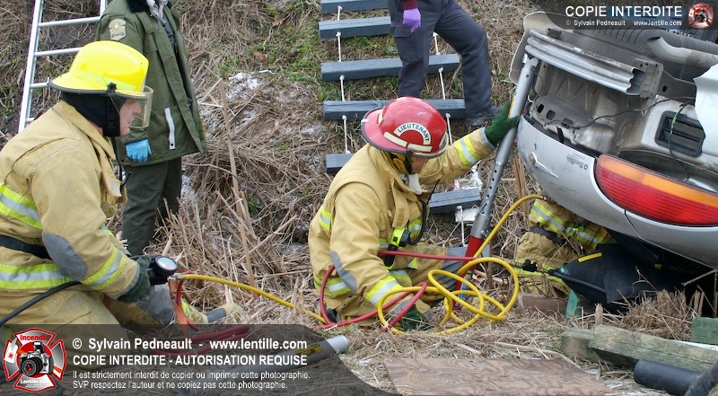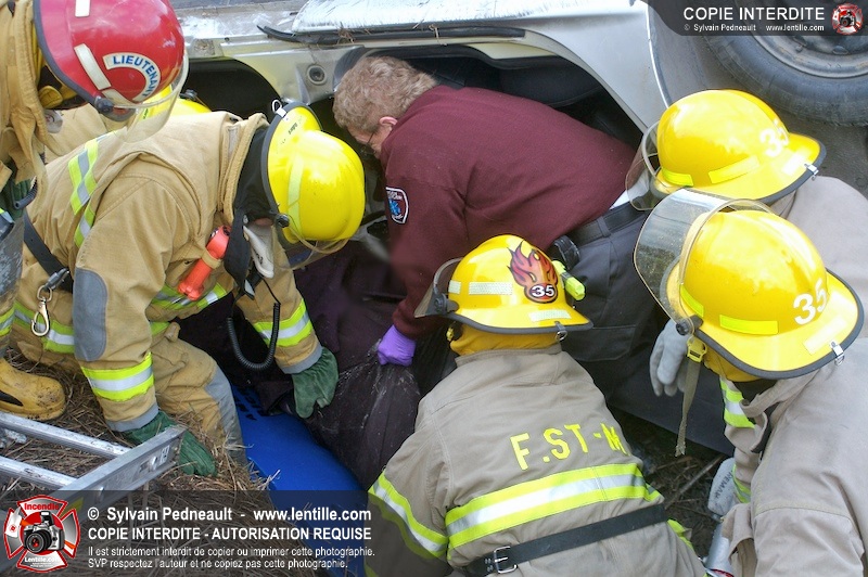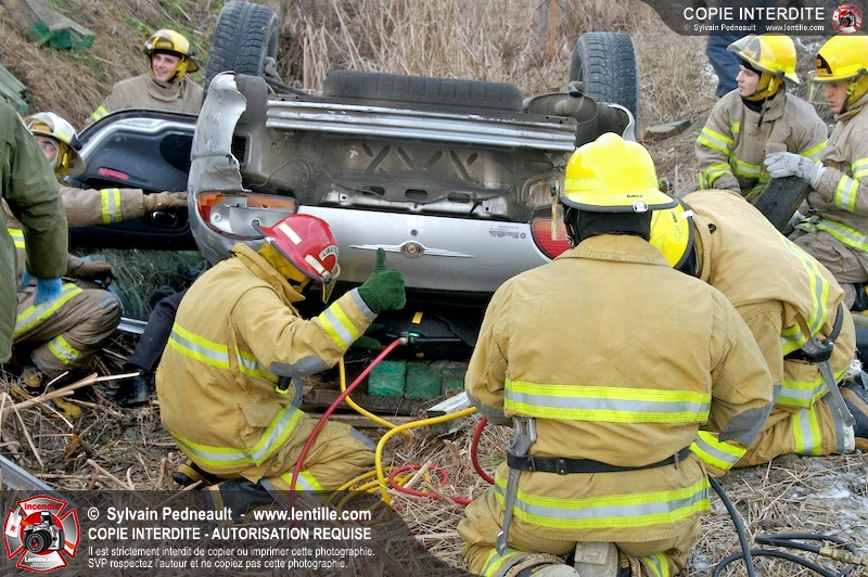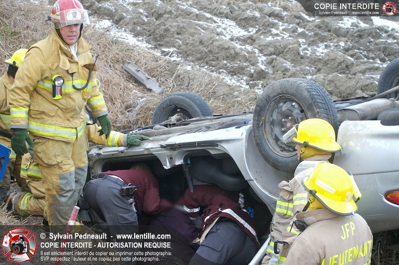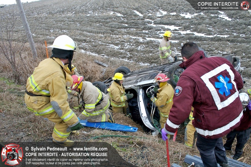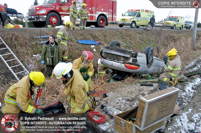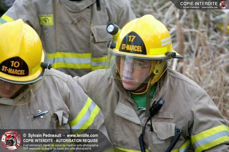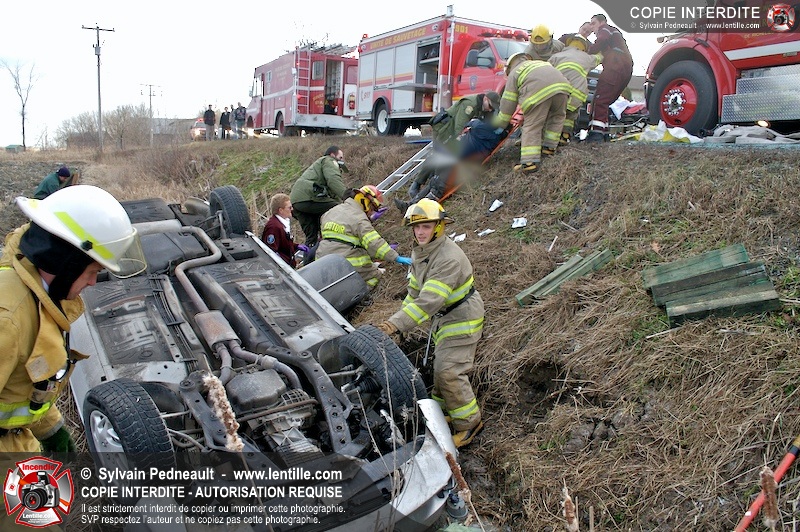 Une complexe opération de désincarcération a eu lieu sur la route 239 près du Rang Ste-Julie à St-Marcel. Puisque le véhicule était renversé sur le toit et qu'il présentait des risques de glissement multi-directionnel pendant les manoeuvres, les pompiers spécialisés du SSI de Saint-Hyacinthe, assistés des pompiers de St-Marcel, ont réalisé la délicate désincarcération de 35 minutes en combinant tout un évantail de techniques et d'équipements.