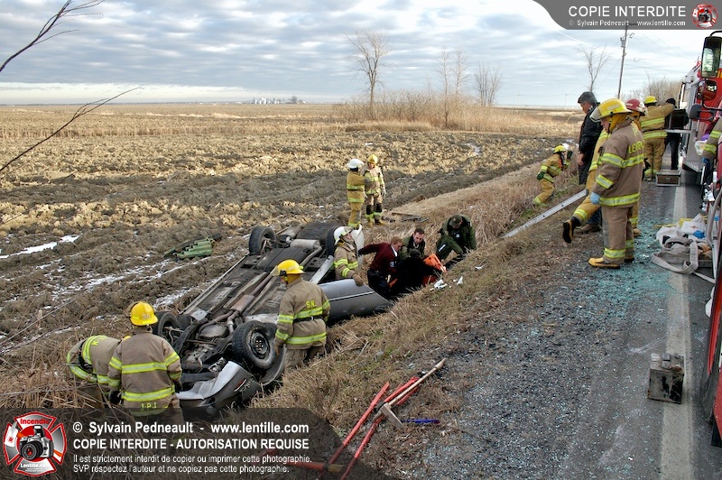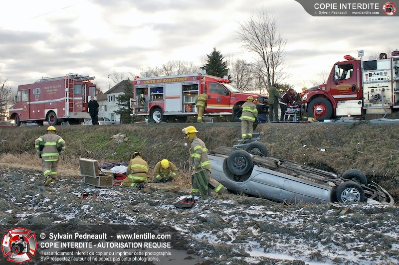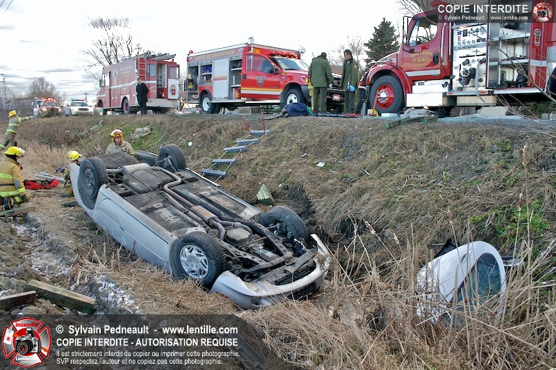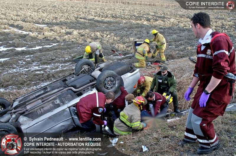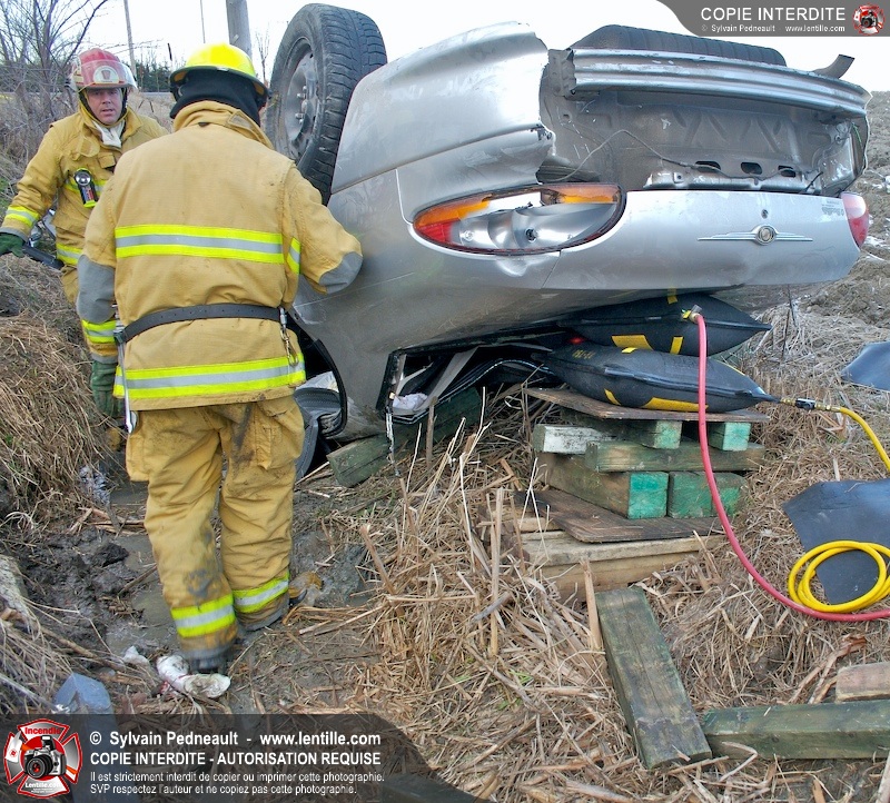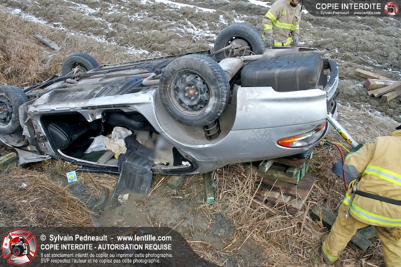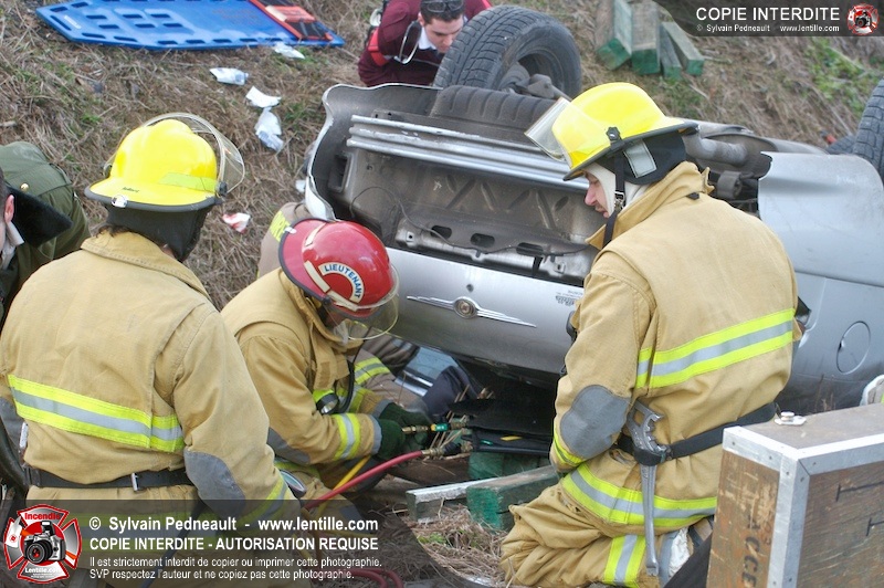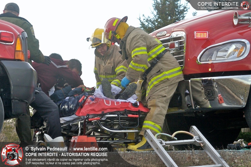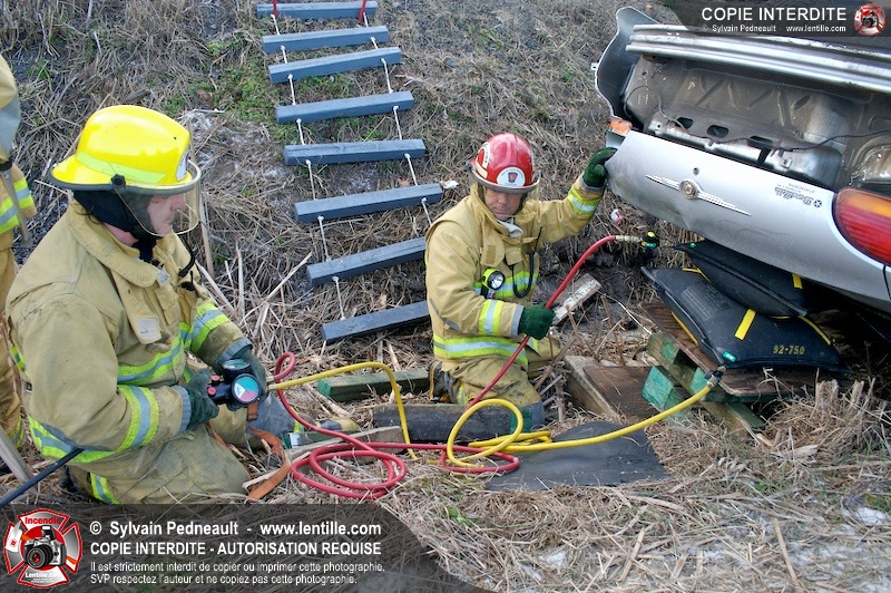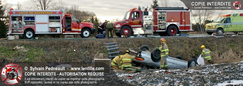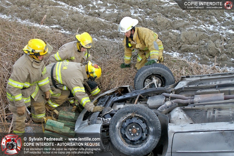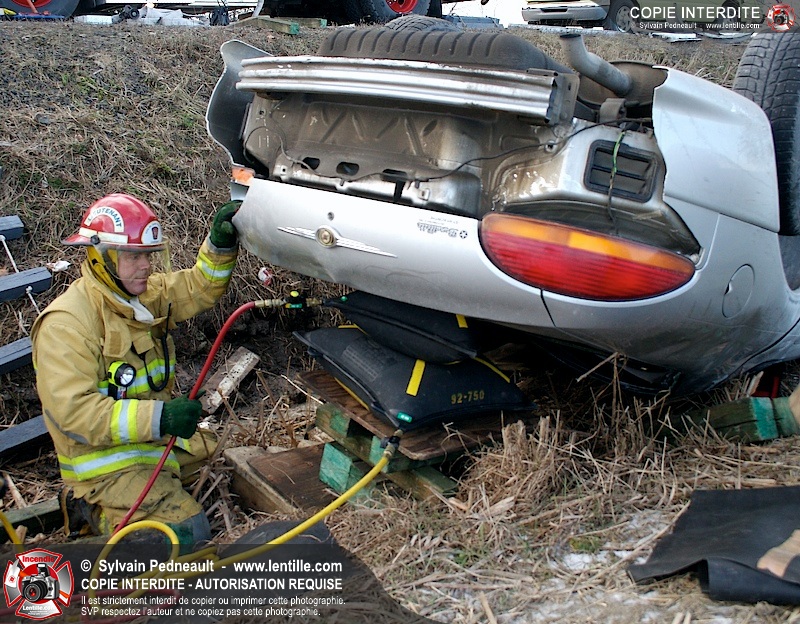 Une complexe opération de désincarcération a eu lieu sur la route 239 près du Rang Ste-Julie à St-Marcel. Puisque le véhicule était renversé sur le toit et qu'il présentait des risques de glissement multi-directionnel pendant les manoeuvres, les pompiers spécialisés du SSI de Saint-Hyacinthe, assistés des pompiers de St-Marcel, ont réalisé la délicate désincarcération de 35 minutes en combinant tout un évantail de techniques et d'équipements.
