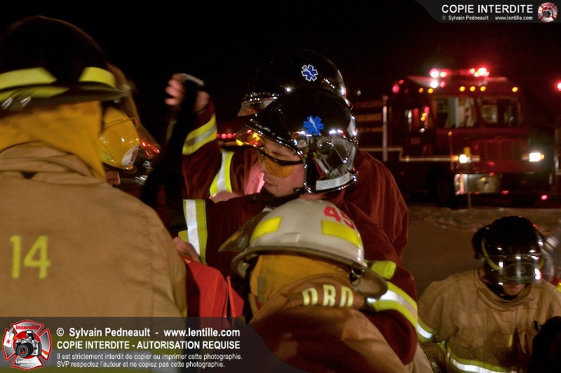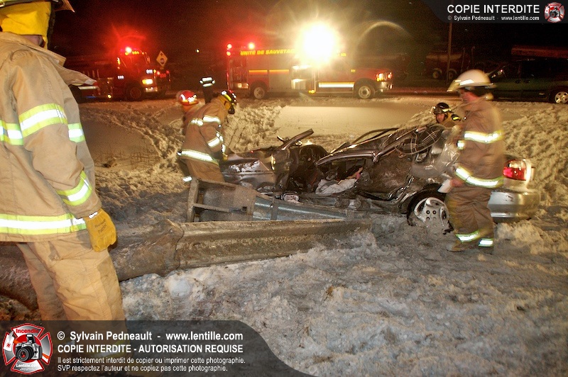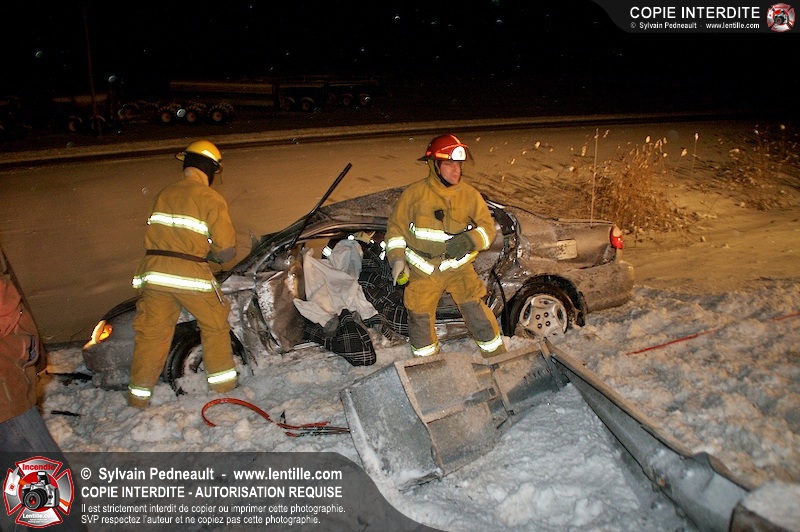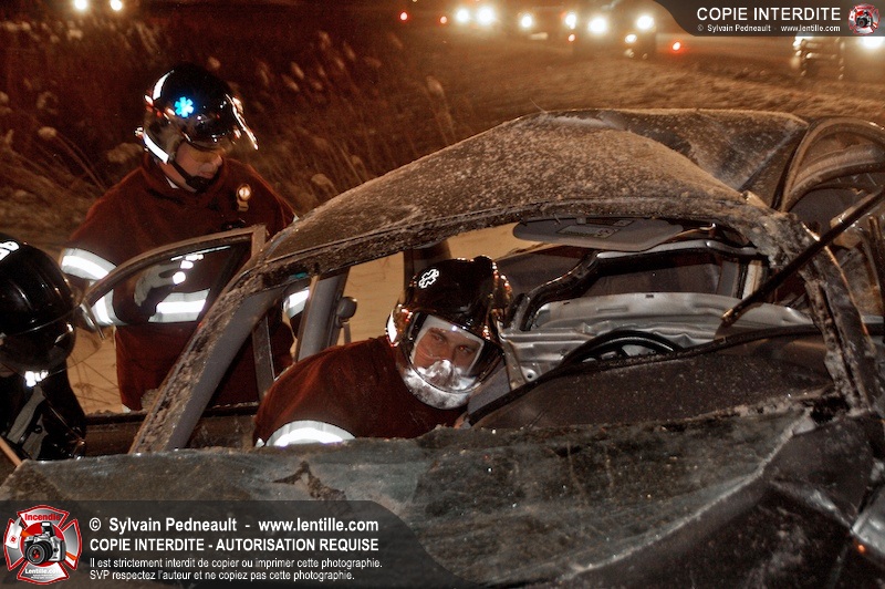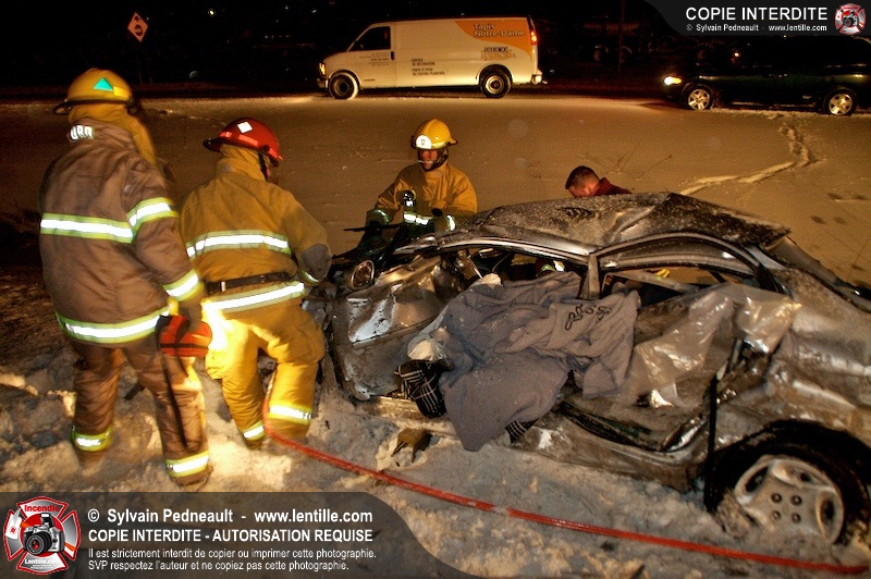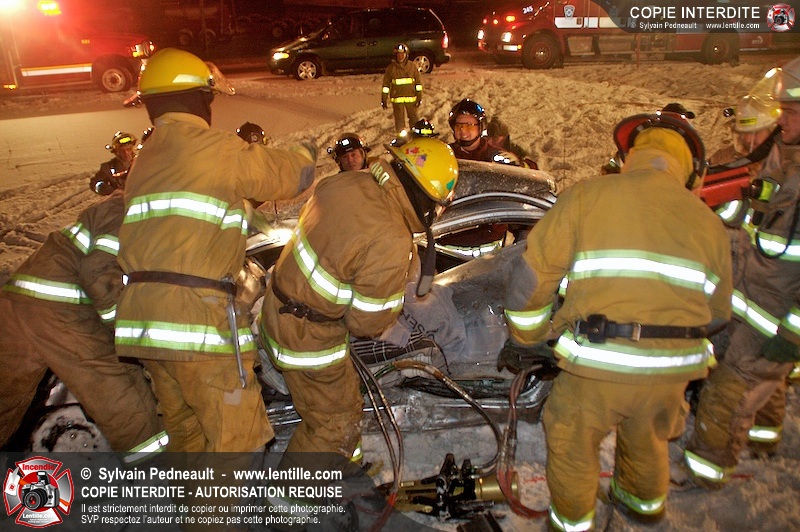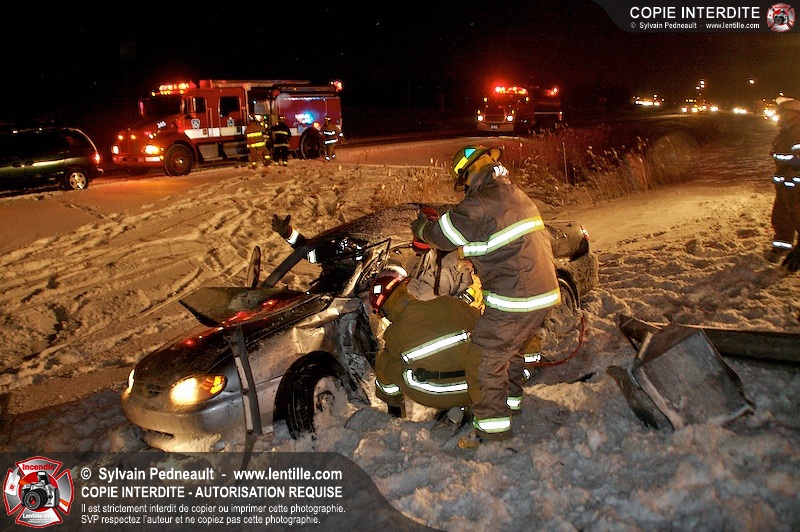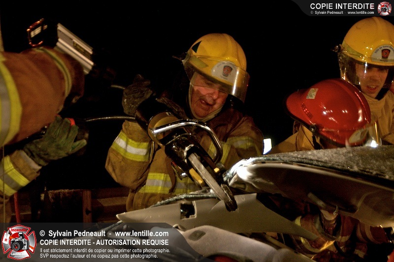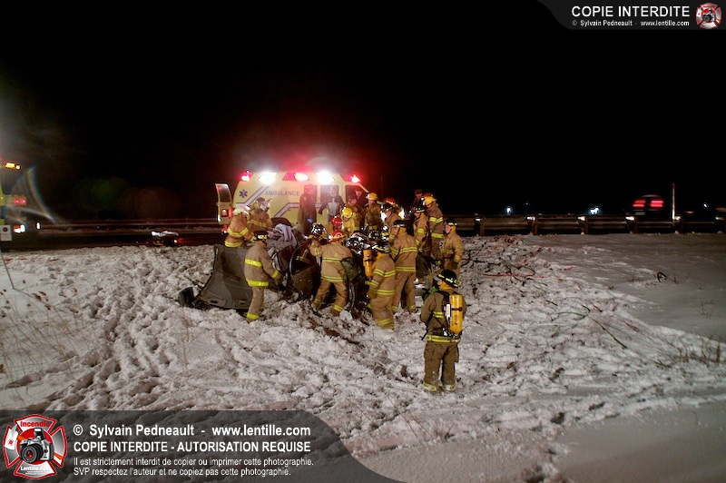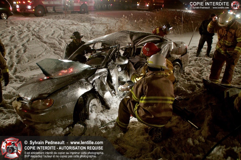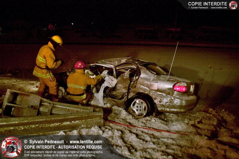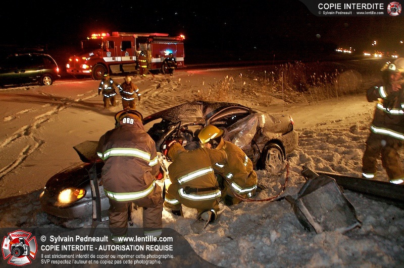 Les pompiers du Service de sécurité incendie de Saint-Hyacinthe ont dû mettre en oeuvre deux unités de désincarcération simultanément pour libérer une conductrice incarcérée dans son véhicule. Les pompiers de St-Simon ont assuré la protection incendie et assisté les intervenants en désincarcération. Les paramédics de Saint-Hyacinthe sont intervenus dans le véhicule accidenté pendant toute la durée des opérations, et ont ensuite transporté la victime au centre hospitalier.
