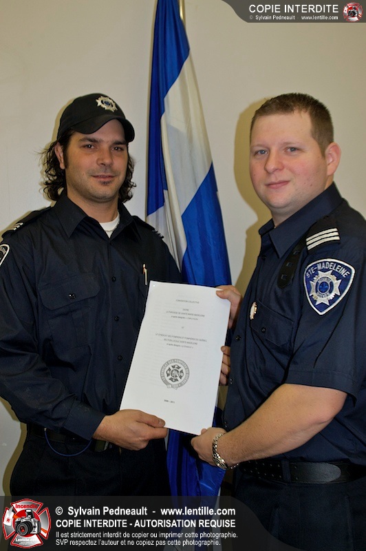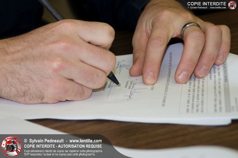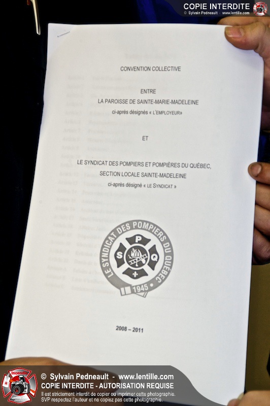 Le 19 novembre 2008 - Le 13 novembre dernier, le Syndicat des pompiers du Québec, section locale Sainte Marie-Madeleine a signé une première convention collective pour une durée de 3 ans.
