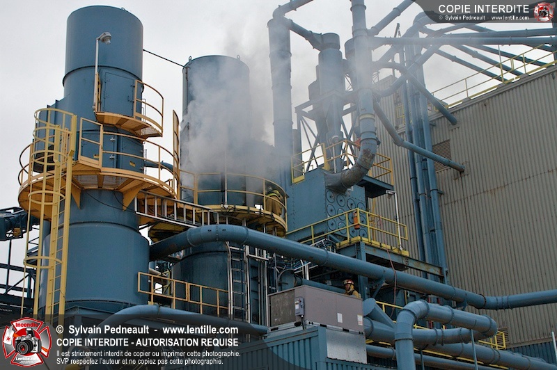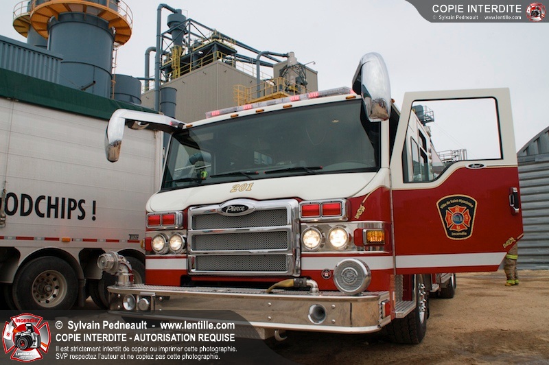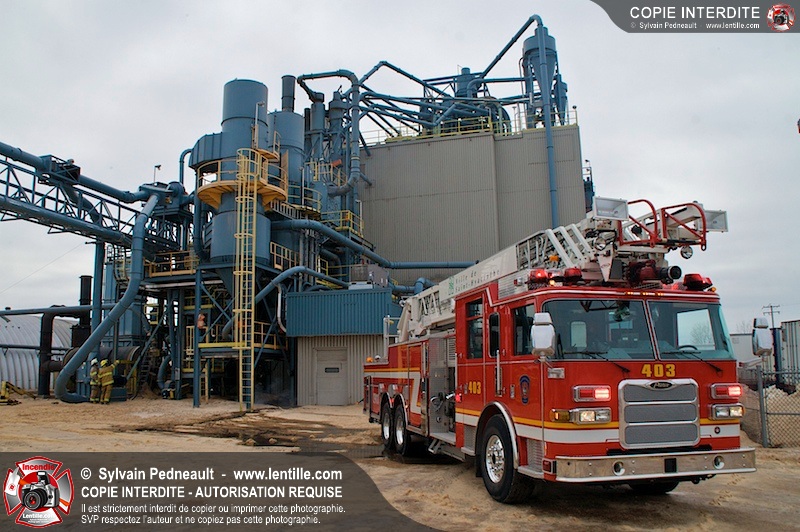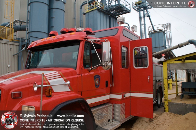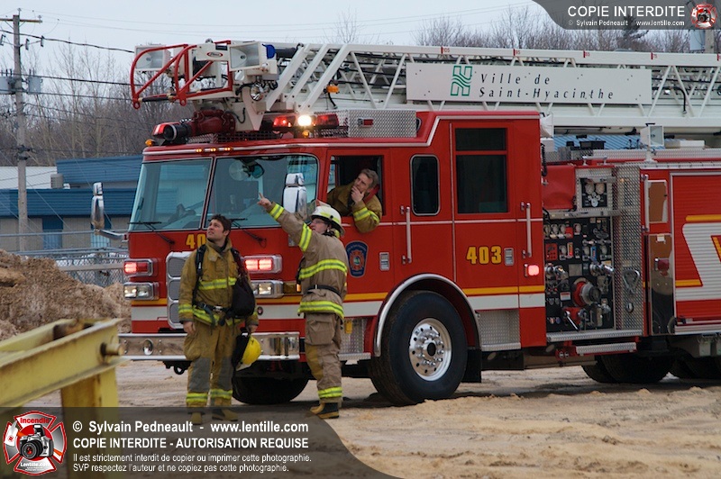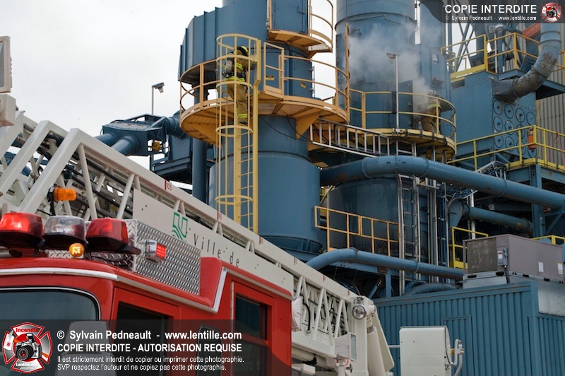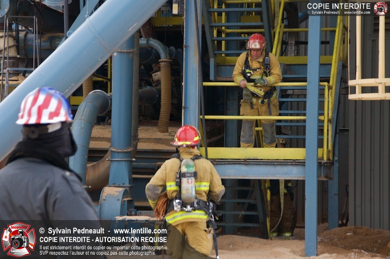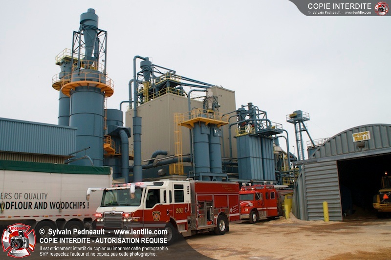 Les pompiers du Service de sécurité incendie de la Ville de Saint-Hyacinthe sont intervenus pour un feu d'industrie. L'incendie s'est heureusement limité à un dépoussiéreur à l'extérieur de l'usine. Fait intéressant, l'alimentation de la pompe d'attaque a été simplifiée et accélérée par la présence d'une borne d'incendie que le propriétaire de l'usine a fait installer à titre préventif à proximité des installations à risque.