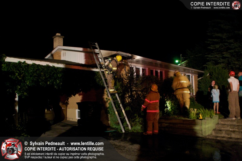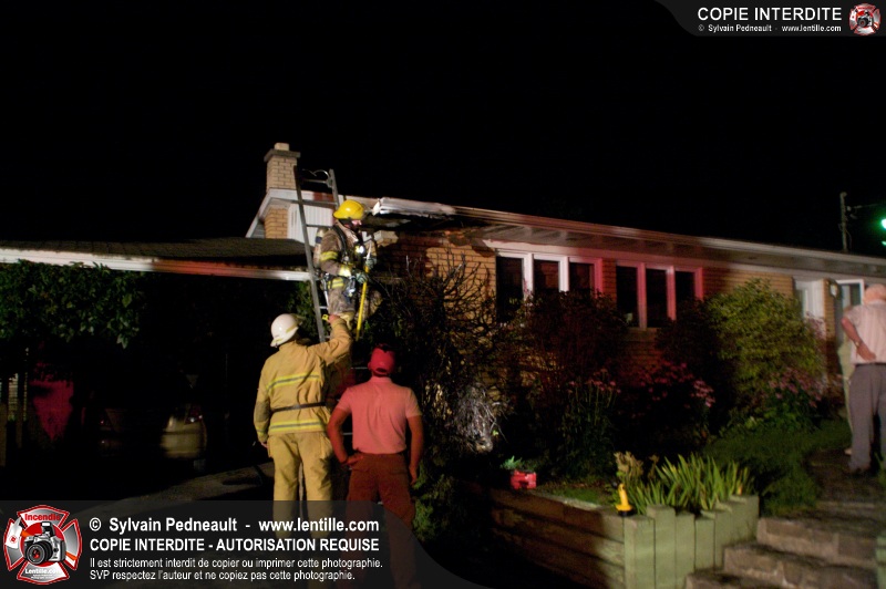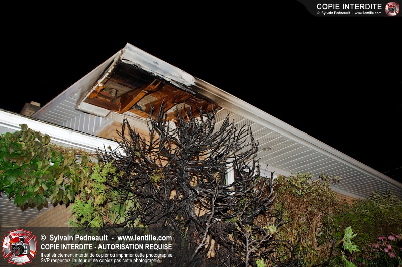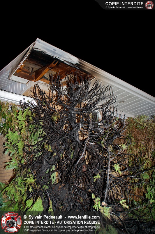 Un feu dans un cèdre s'est propagé à une résidence dans le secteur Douville à Saint-Hyacinthe. L'eau aspergée par le propriétaire de la maison avant l'arrivée des pompiers a très probablement sauvé le bâtiment. Les pompiers ont terminé l'extinction et fait les vérifications d'usage à l'aide d'une caméra thermique.