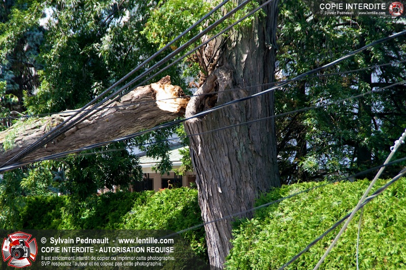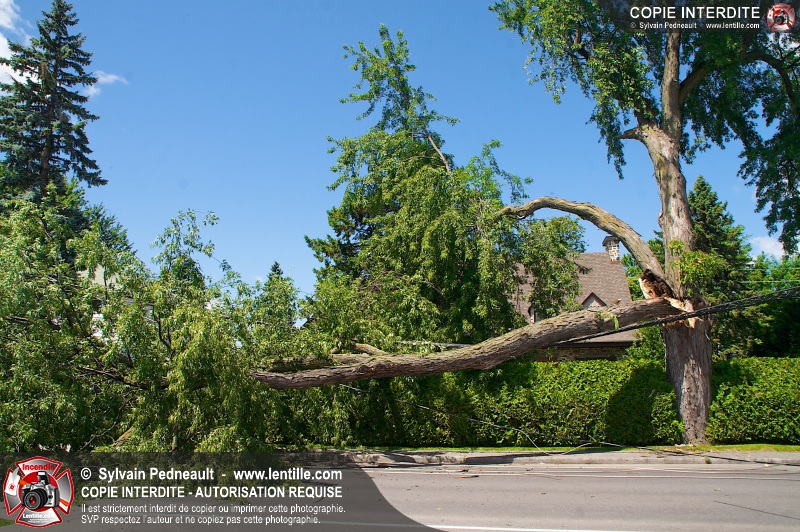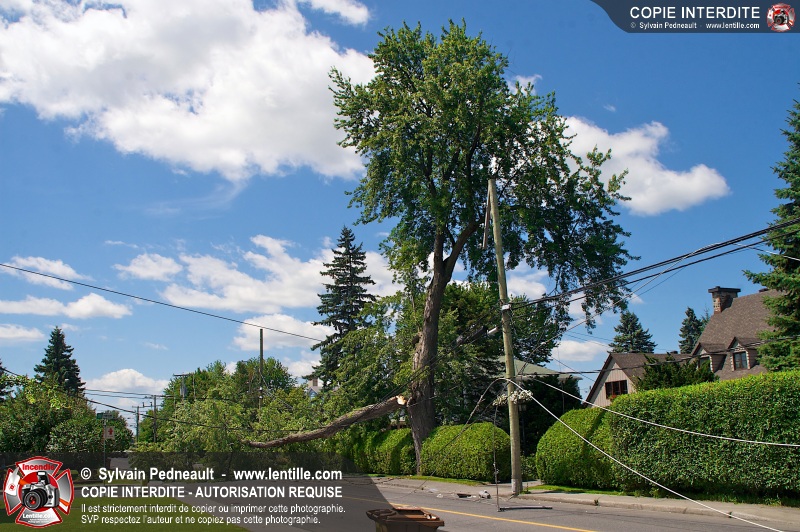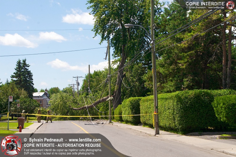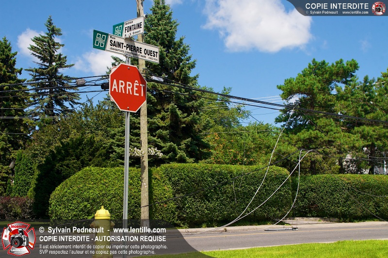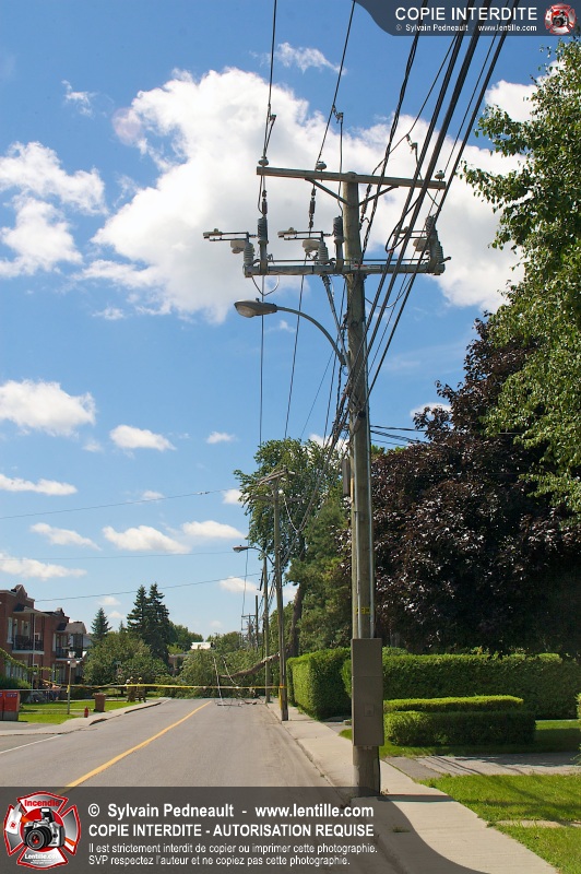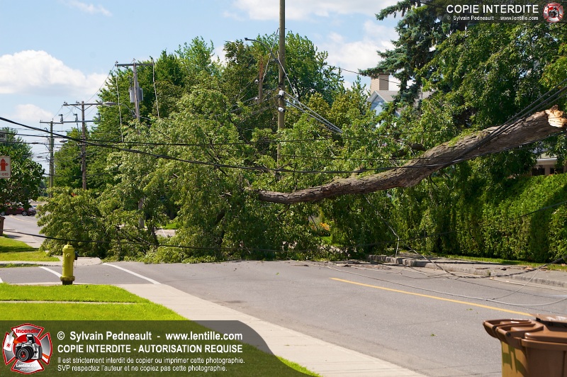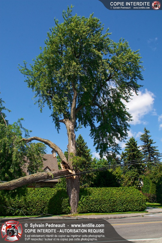 Les pompiers de Saint-Hyacinthe ont été appelés à se rendre sur la rue St-Pierre dans le secteur La Providence pour un arbre tombé sur des fils électriques. Arrivés sur place, les pompiers ont constaté qu'une imposante branche est tombée de bord en bord de la rue St-Pierre, accrochant dans sa chute une ligne de courant triphasé, une ligne électrique de basse tension, ainsi que des fils de télécommunications; le tout ayant endommagé des poteaux et une entrée électrique résidentielle.